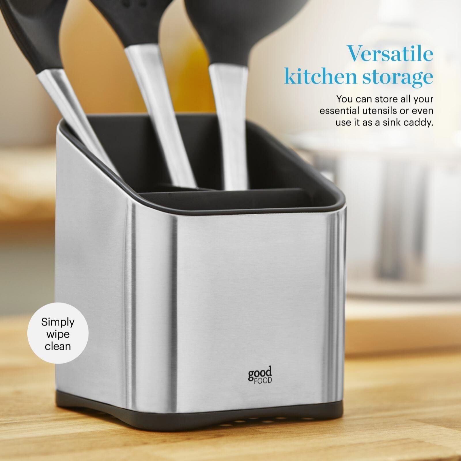 Add a sleek helper to your kitchen with the stainless steel utensil holder from Good Food in partnership with Tower, designed to keep your essentials organised and within easy reach. Featuring one large and two smaller compartments, this utensil holder is perfect for storing everything from cutlery to spatulas, scissors or sponges, while its weighted non-slip base and mirror-polished finish make it a stylish, practical addition to any worktop.