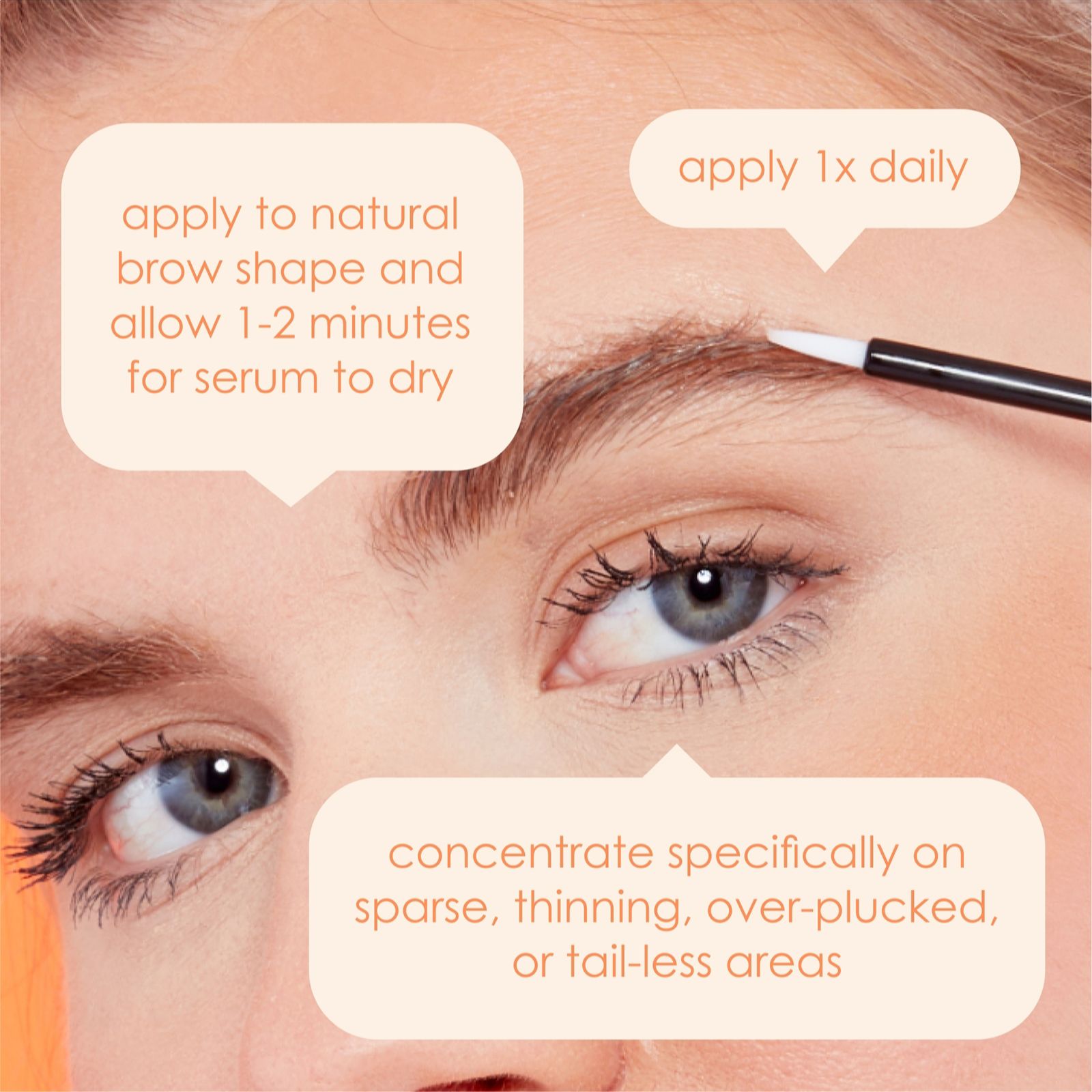 - Allow two - three minutes for the serum to fully dry before applying other products to your brow or eye area