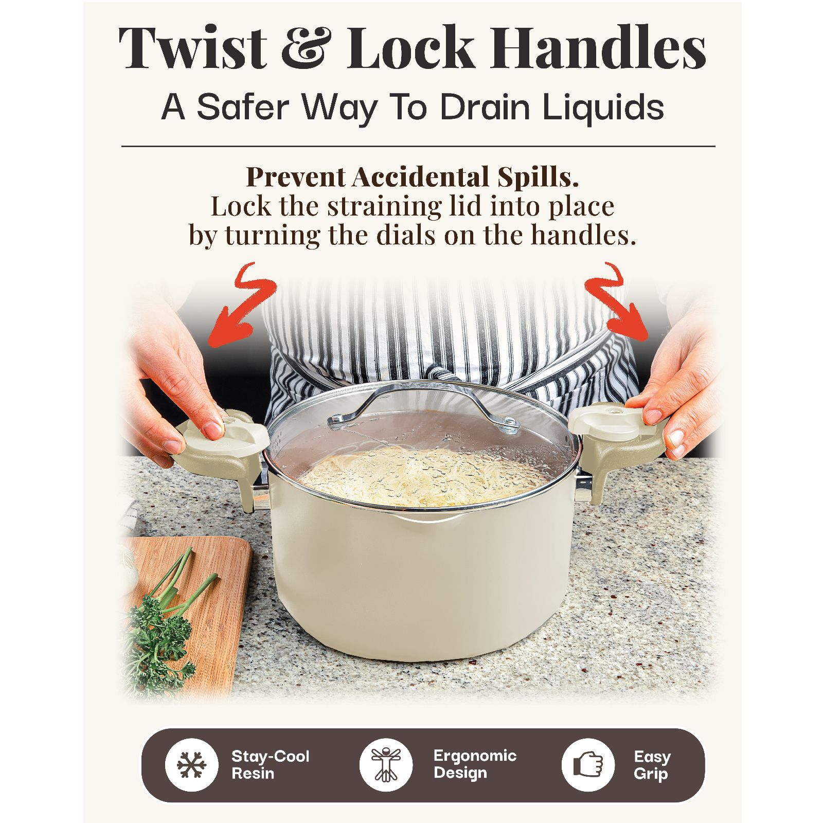 • Twist and lock handles for easy straining