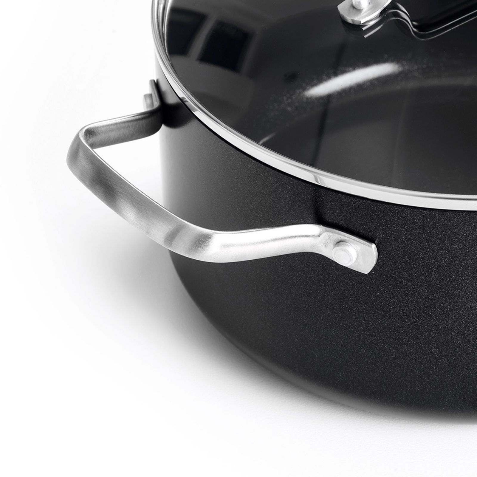 - Hard anodised aluminium with stainless steel handle and tempered glass lid