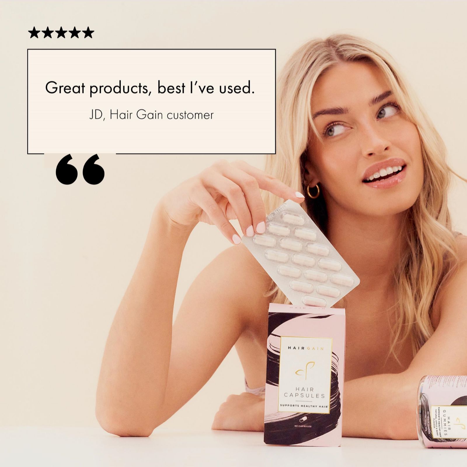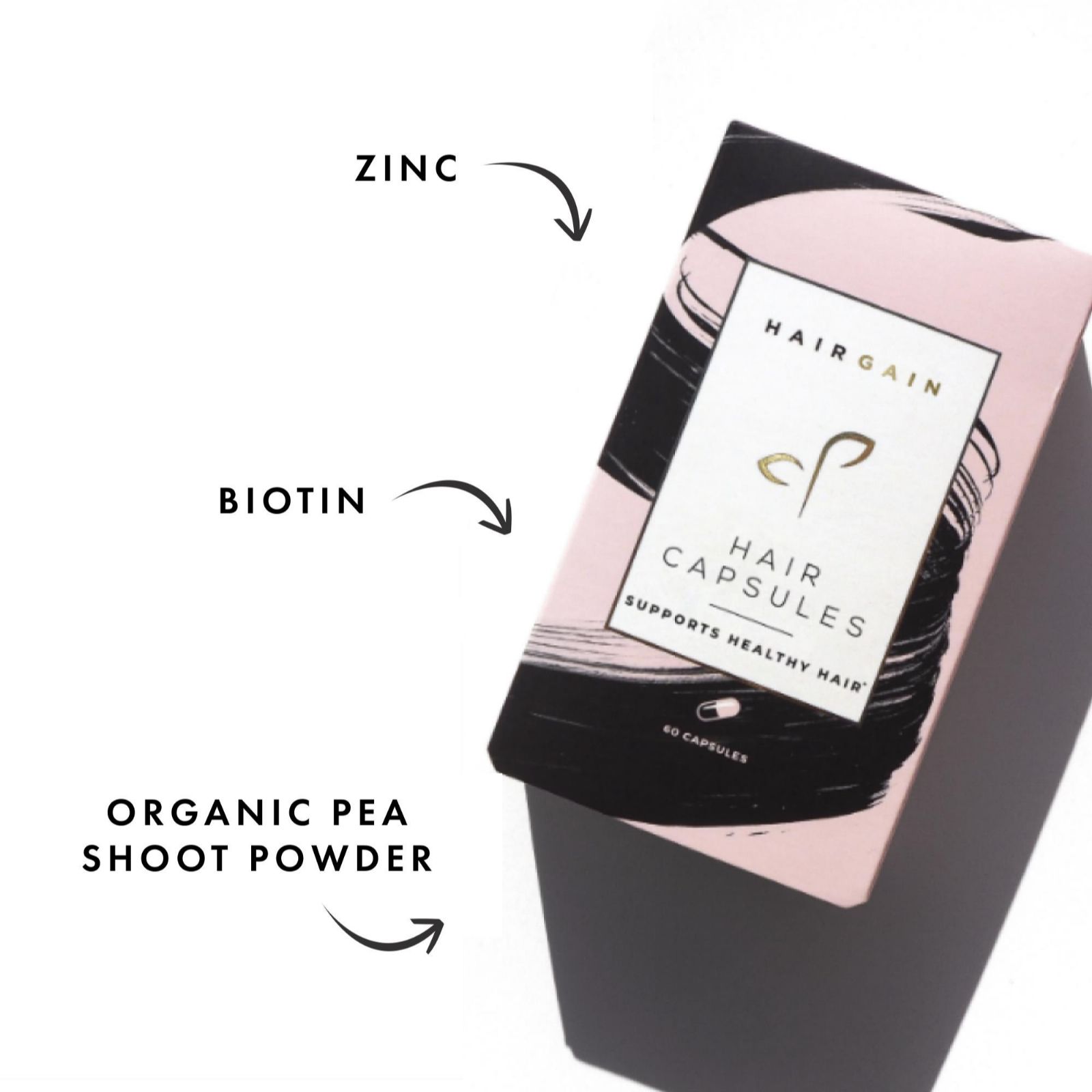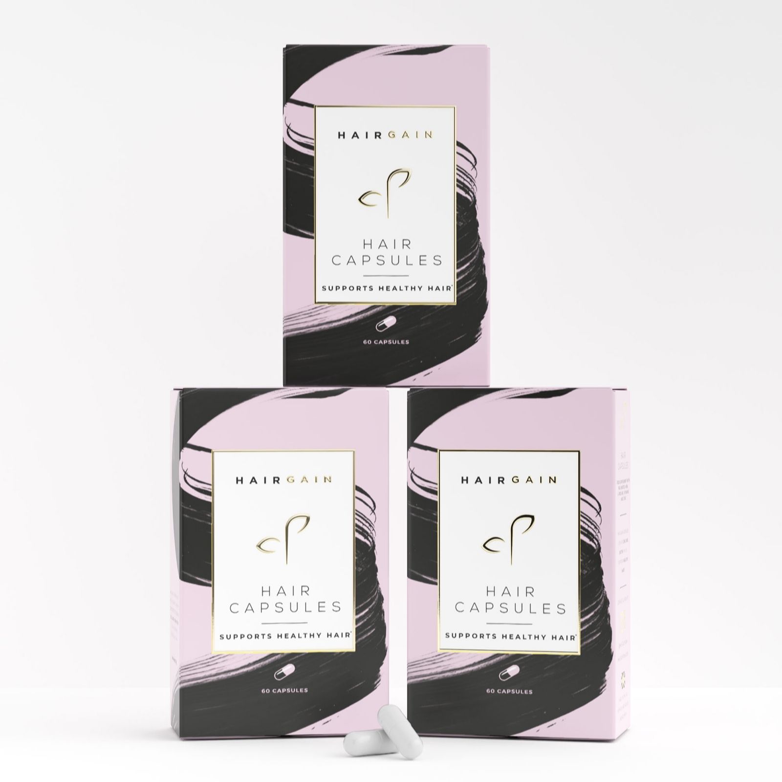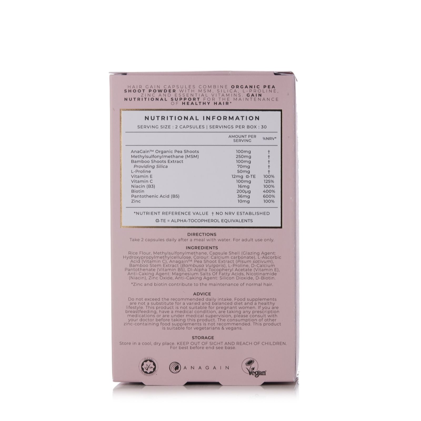 - 3 x Hair Gain Capsules (60 capsules each) - formulated with Anagain organic pea shoots, vitamin E and C, niacin, biotin, zinc and selenium