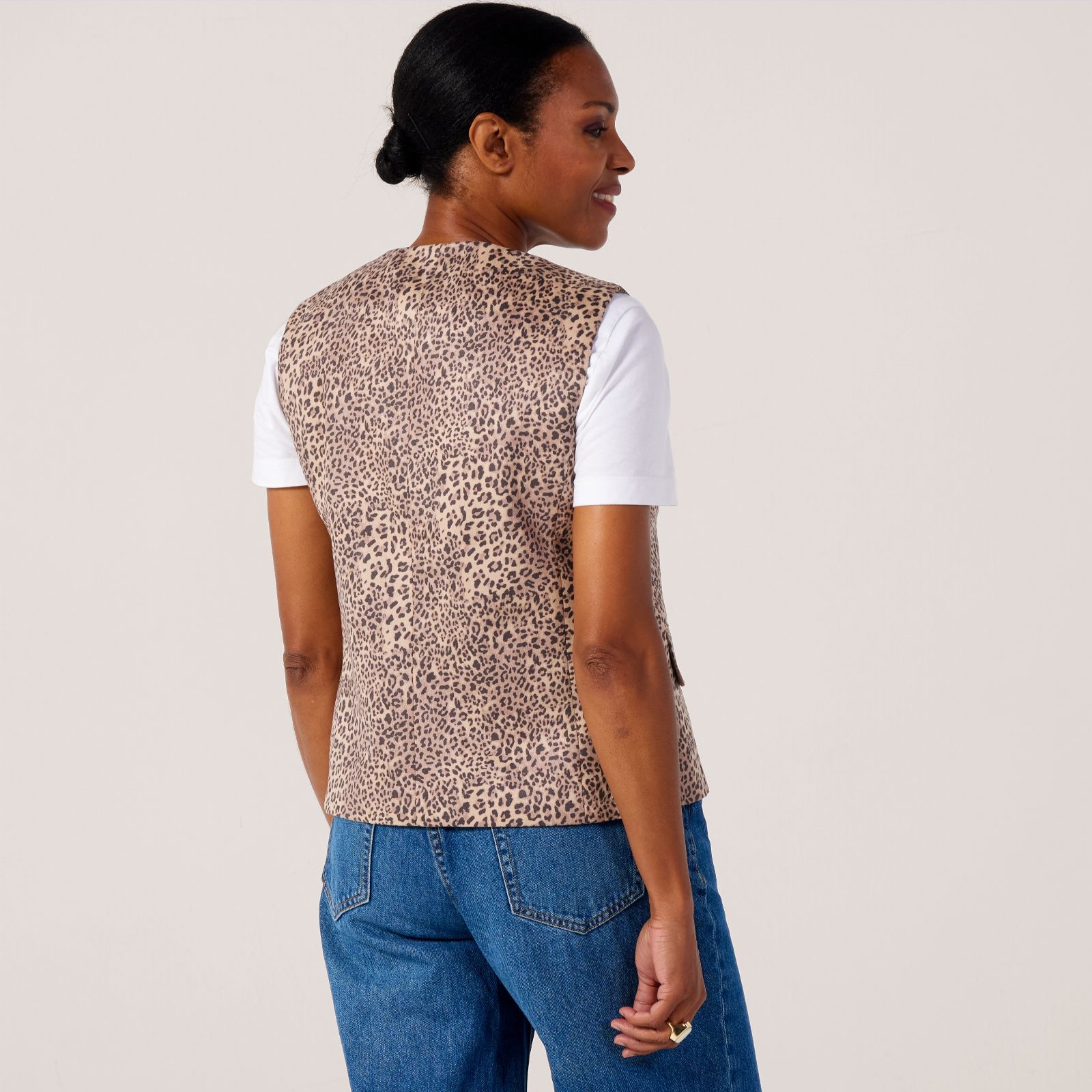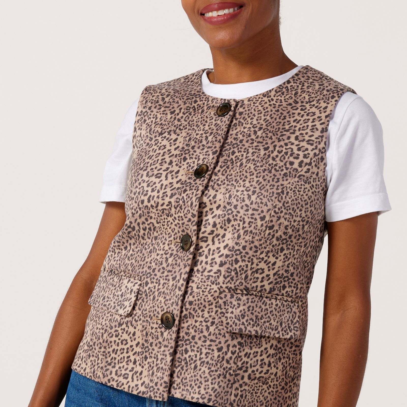 Add instant flair to your outfits with the fitted animal print waistcoat from Helene Berman, crafted in soft faux suede for a bold yet glamorous finish. The elegant high neck, princess seams and matched horn buttons create a graceful silhouette, while piped flap pockets add a touch of luxury. Layer it over a roll-neck top or knitwear to elevate your workwear or weekend style.