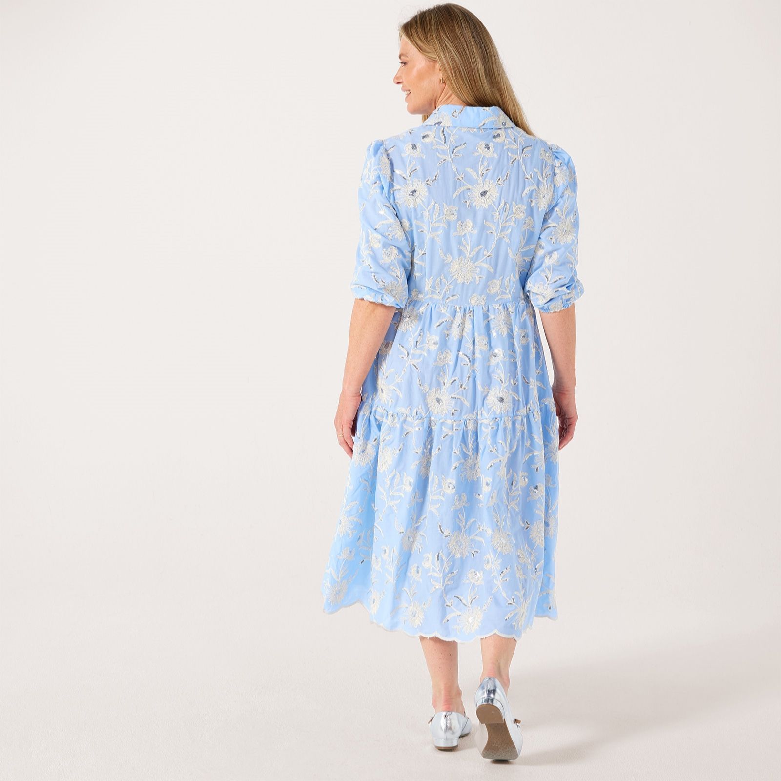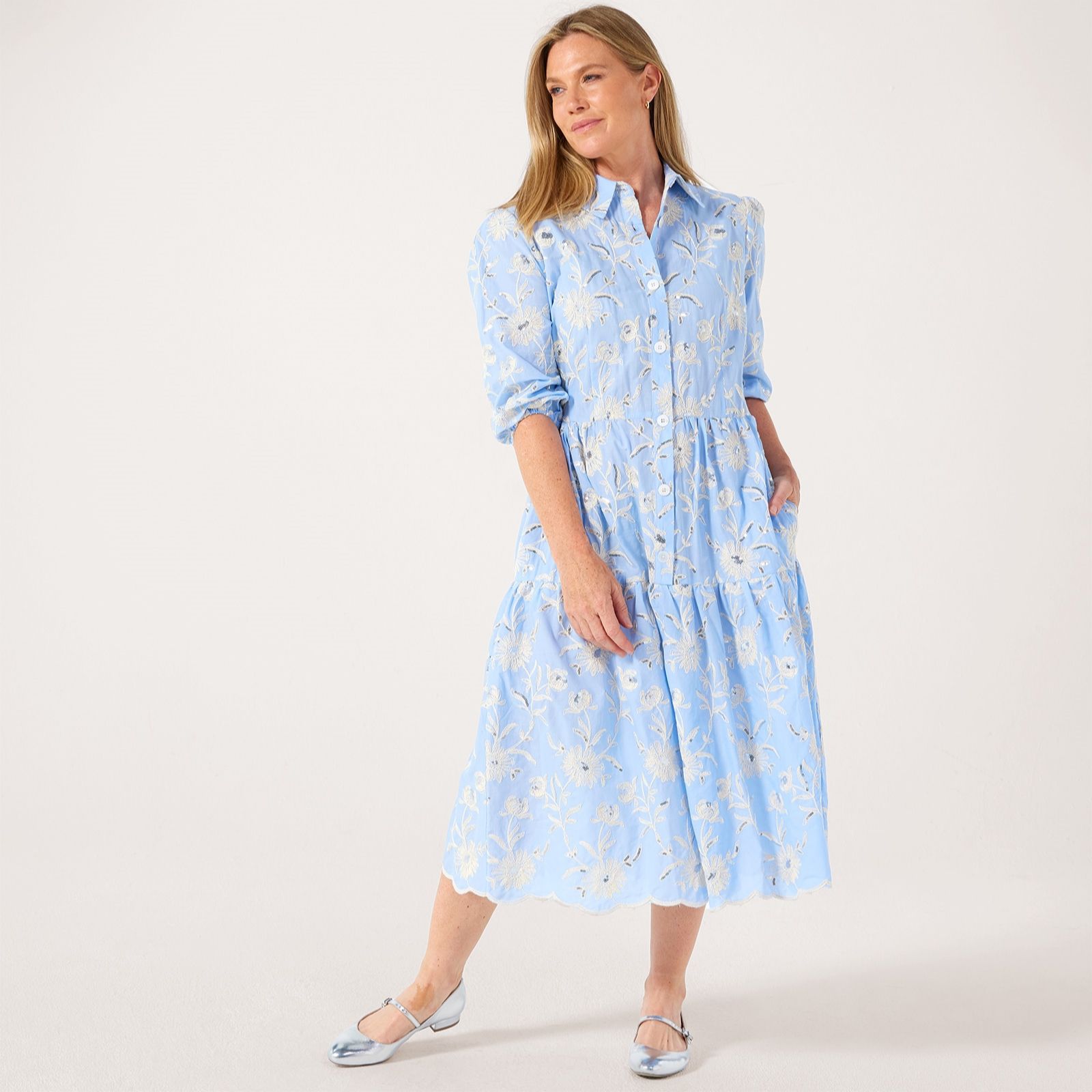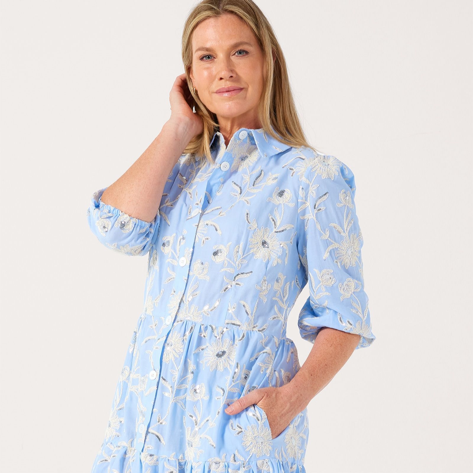 Let your style bloom with the Cassie embroidered sequin flower cotton dress from Helene Berman, where delicate floral embroidery and shimmering sequins bring a touch of artistry to this two-tiered midi shirt dress. Ideal for relaxed brunches, garden parties or special days out, its easy elegance makes it a true wardrobe favourite. Try it with classic loafers or strappy sandals for a polished, modern look.