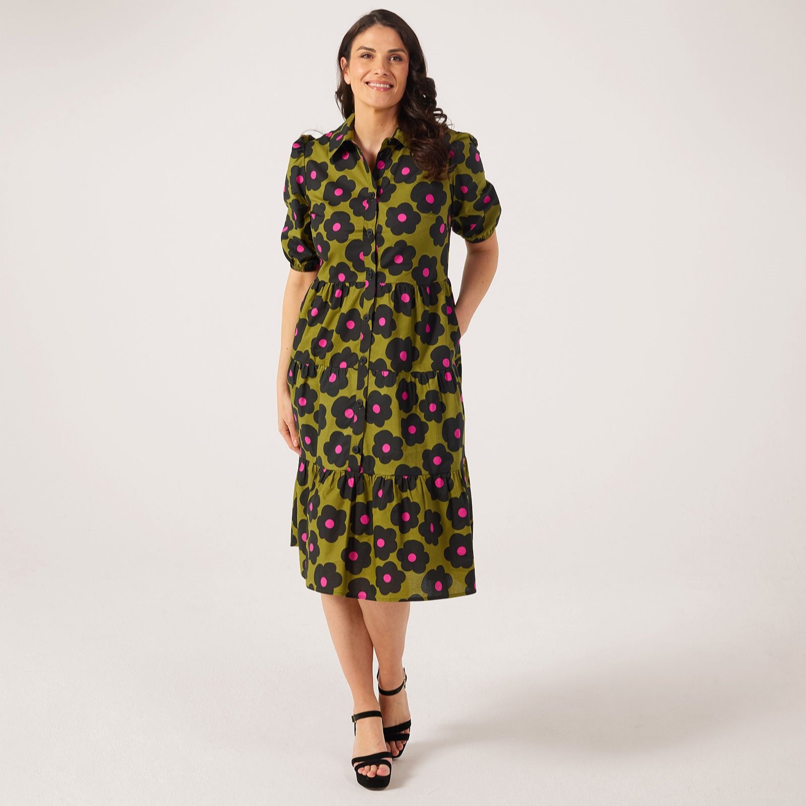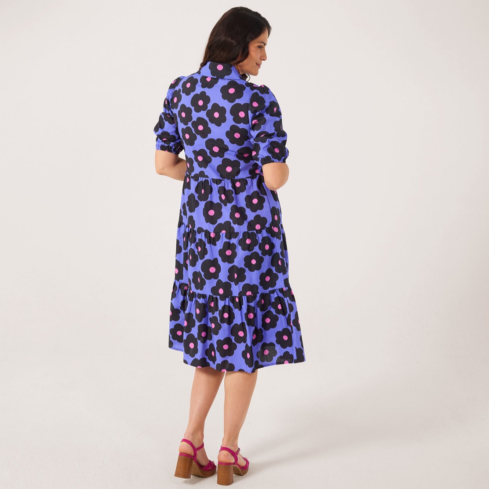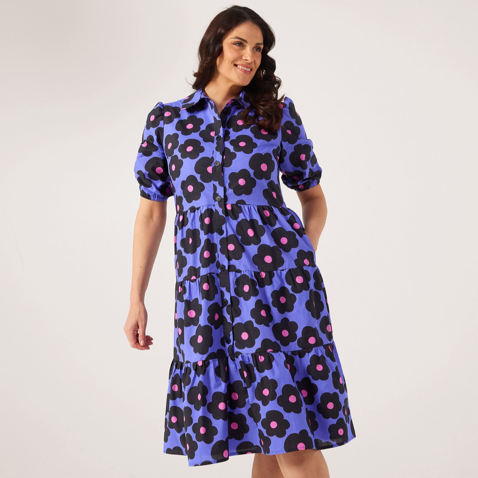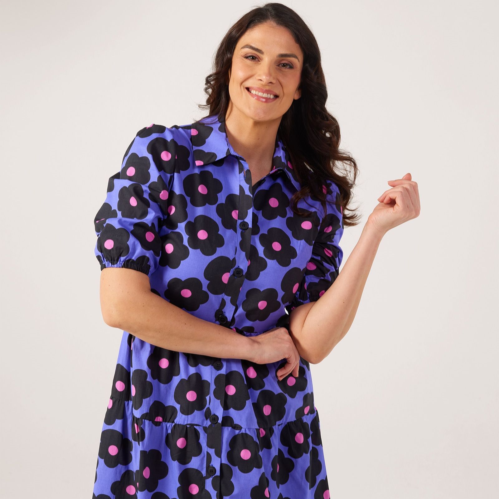 Embrace effortless style with the Helene Berman daisy print cotton poplin dress. This shirt dress is adorned with charming daisy prints, making it an ideal choice for both casual outings and special occasions. The puff sleeves and elastic cuffs add a playful touch, while the side seam pockets provide practical flair. Pair it with your favourite sandals or trainers for a chic and comfortable look.