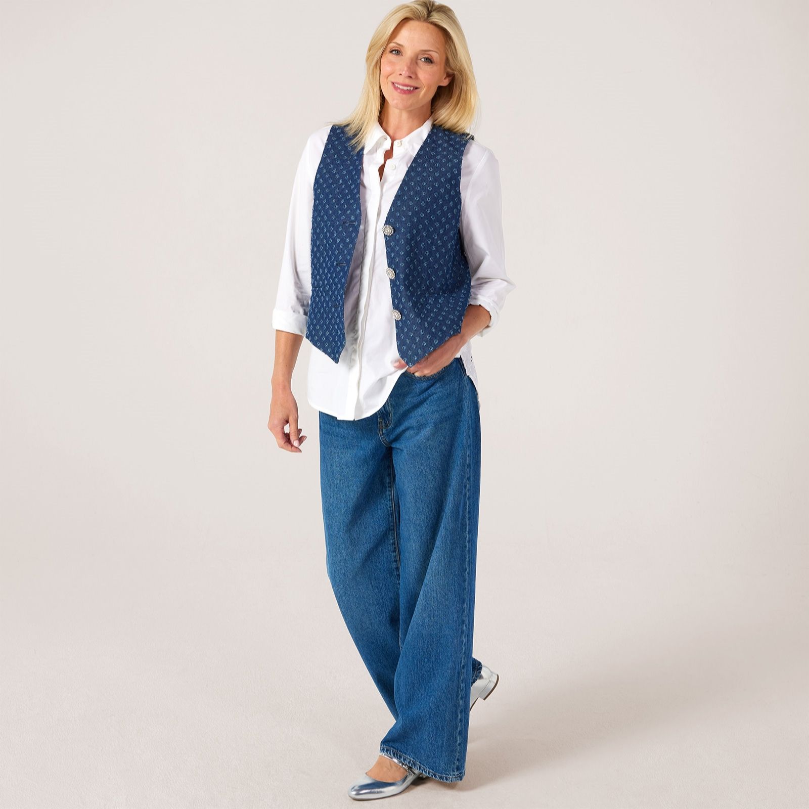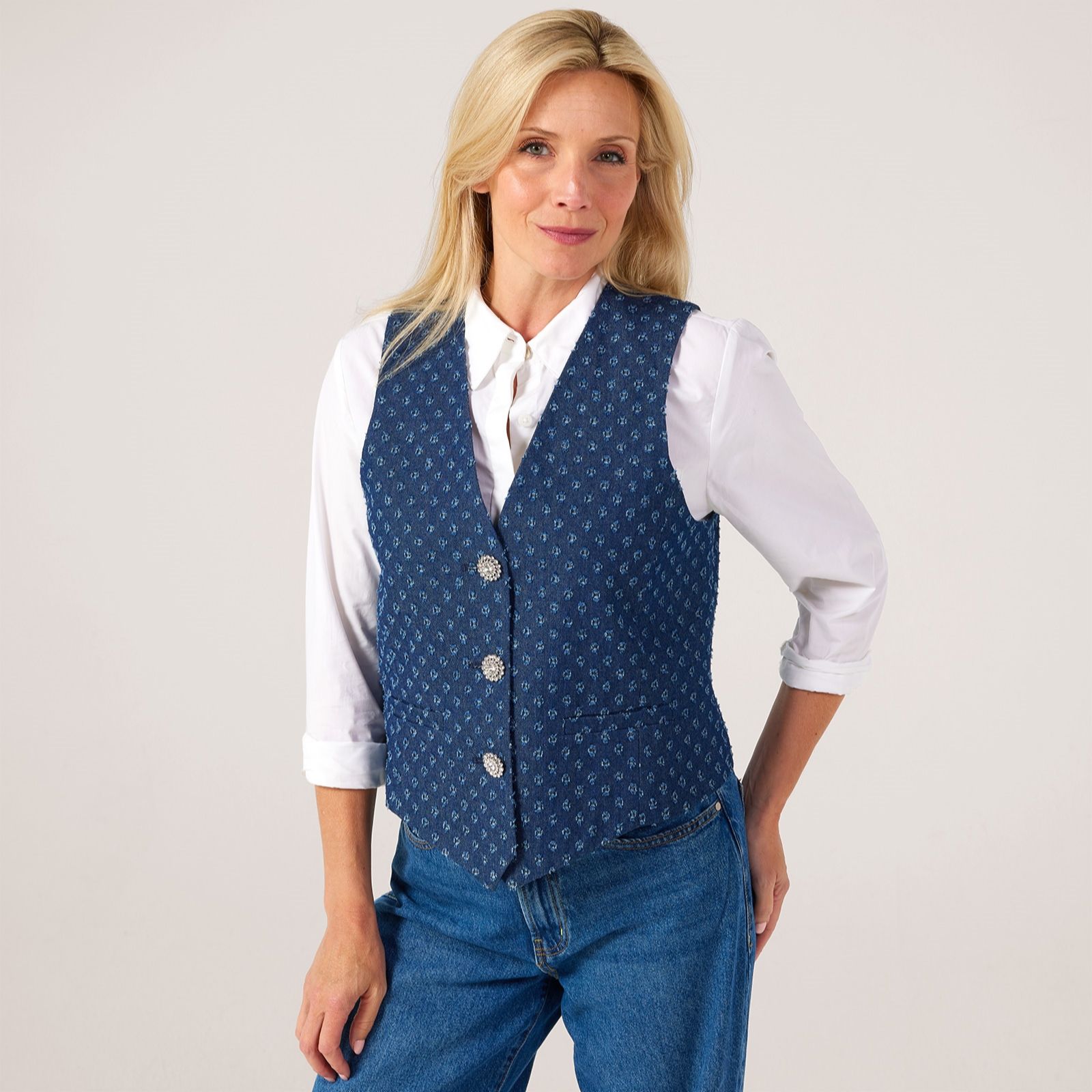 Elevate your everyday with this beautifully crafted denim waistcoat from Helene Berman, adorned with intricate embroidery for a touch of elegance. Three sparkling crystal buttons add a hint of glamour to this standout piece, while the fully lined interior ensures a comfortable fit. Perfect for layering over blouses or dresses, it transitions seamlessly from casual brunches to evenings out. For a chic look, style it with tailored trousers and sleek loafers.