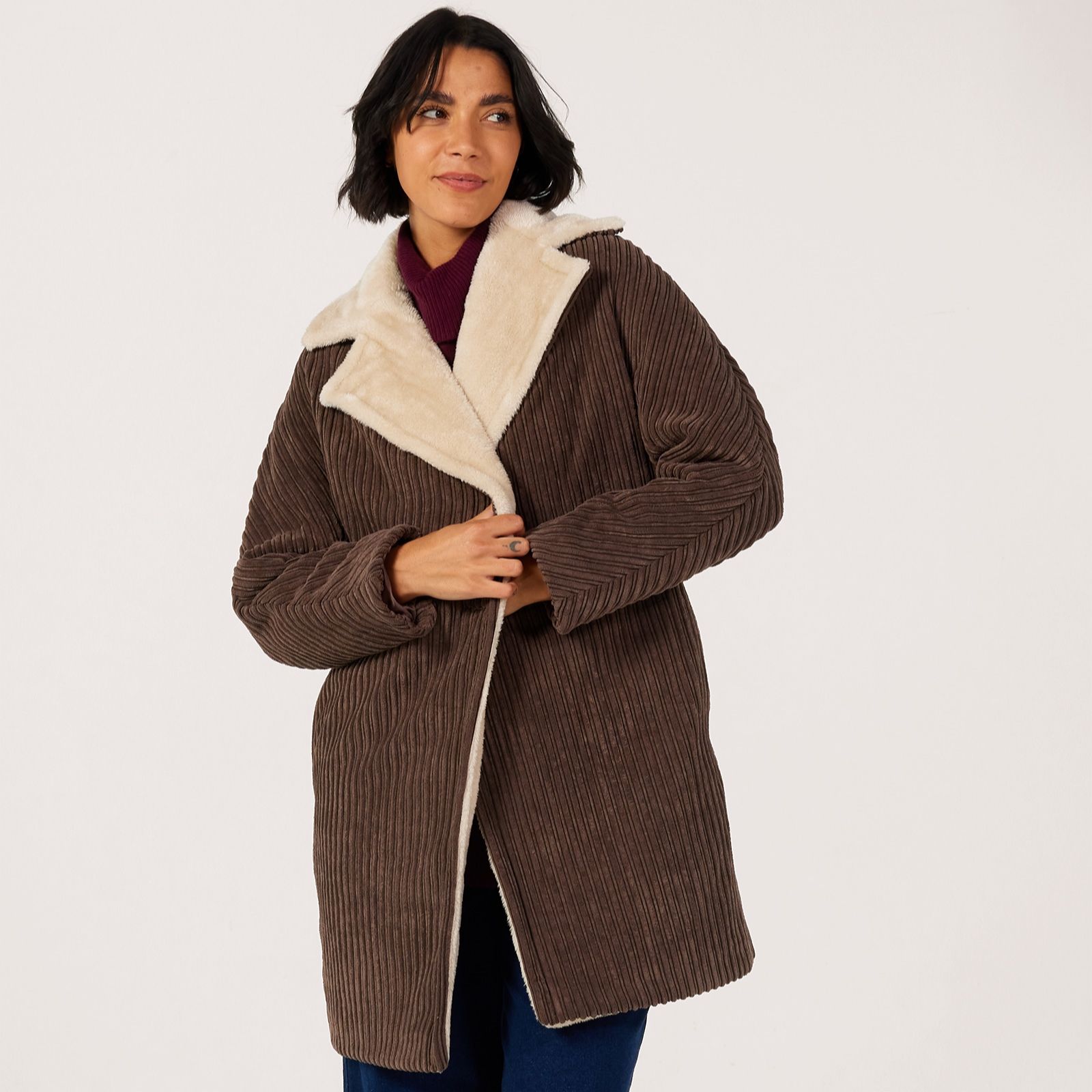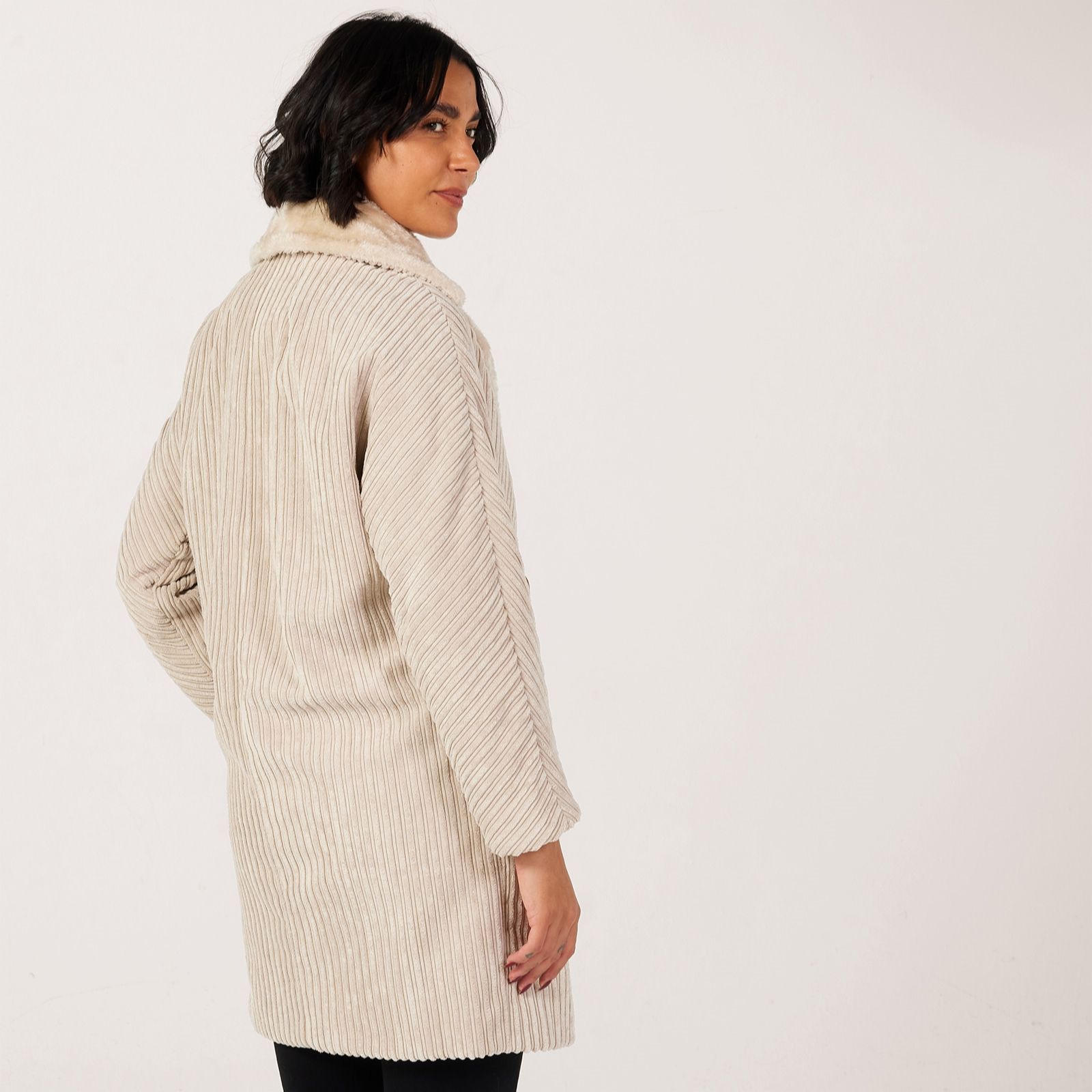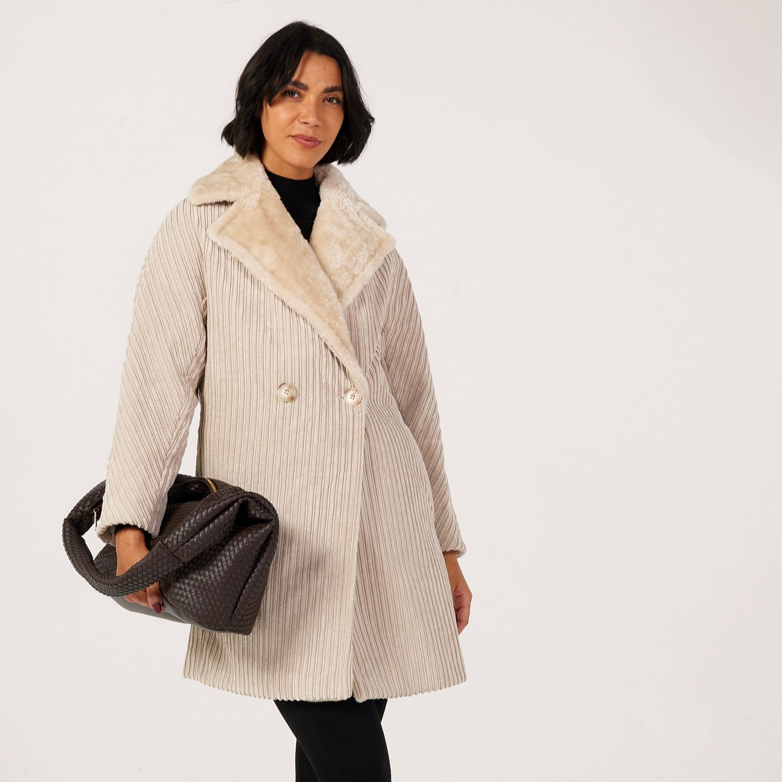 Richly textured with its ribbed finish and faux fur contrast, the double-breasted coat from Helene Berman brings a touch of luxury to your seasonal wardrobe. Crafted in the UK, its classic silhouette and side seam pockets make it a chic choice for everything from brisk morning walks to evening outings. Try layering it over a knit dress or tailored trousers for effortless elegance.