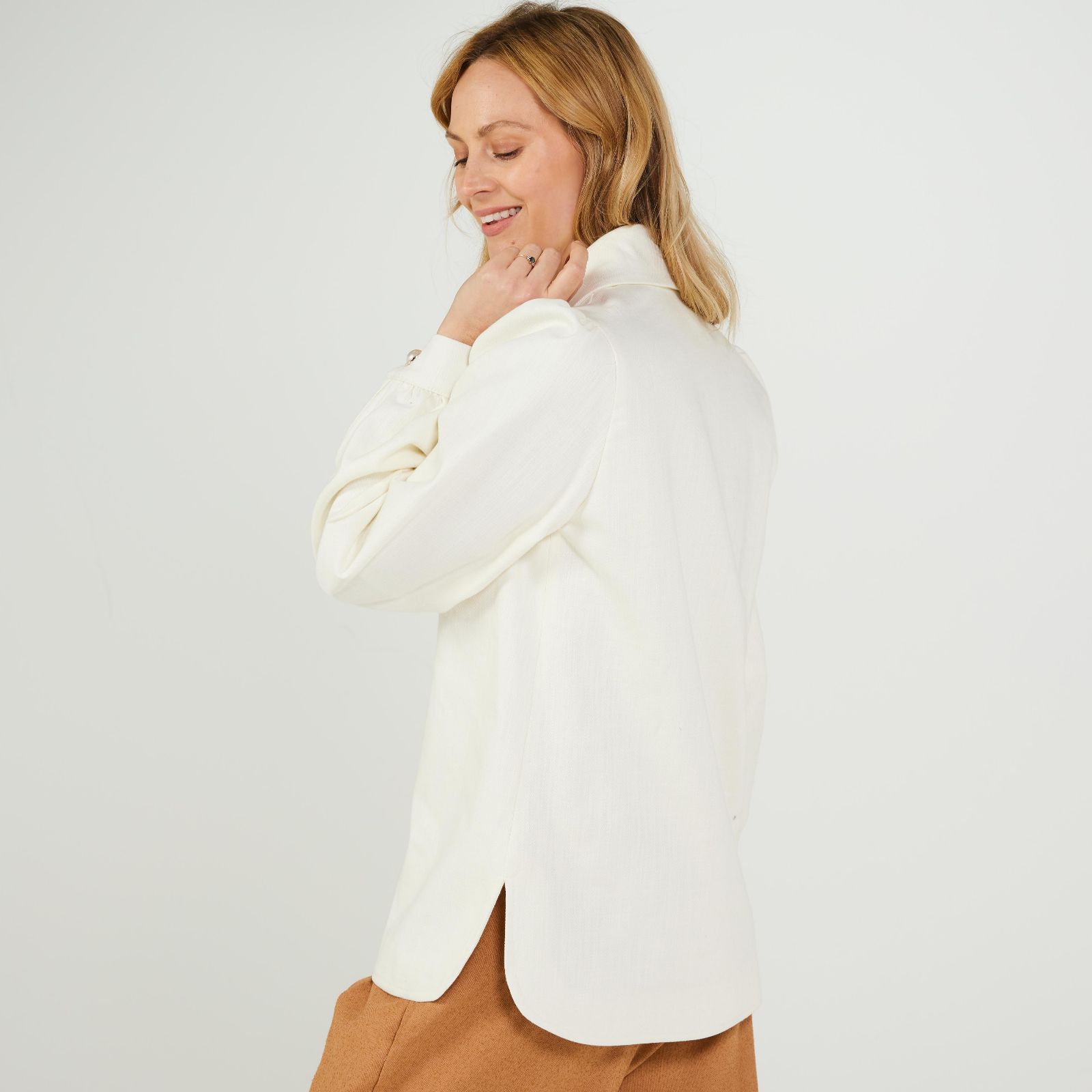 Extra features: Pearl button detail, curved hem with side seam slits, hidden pockets, fully lined with piping finish on back neck