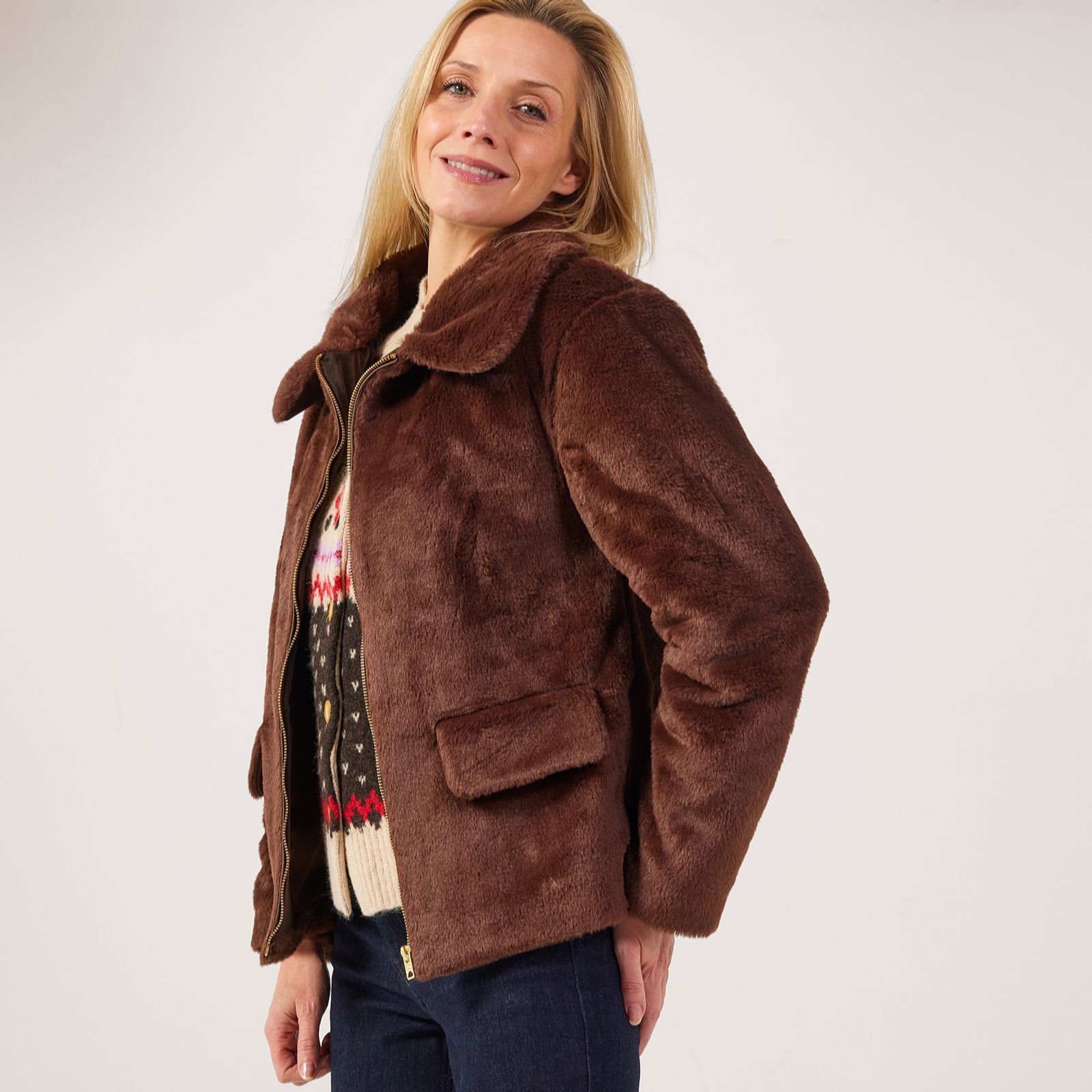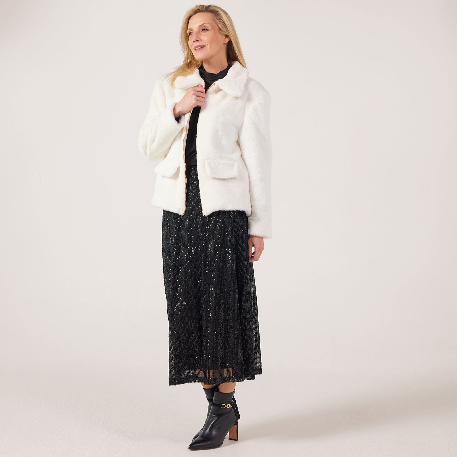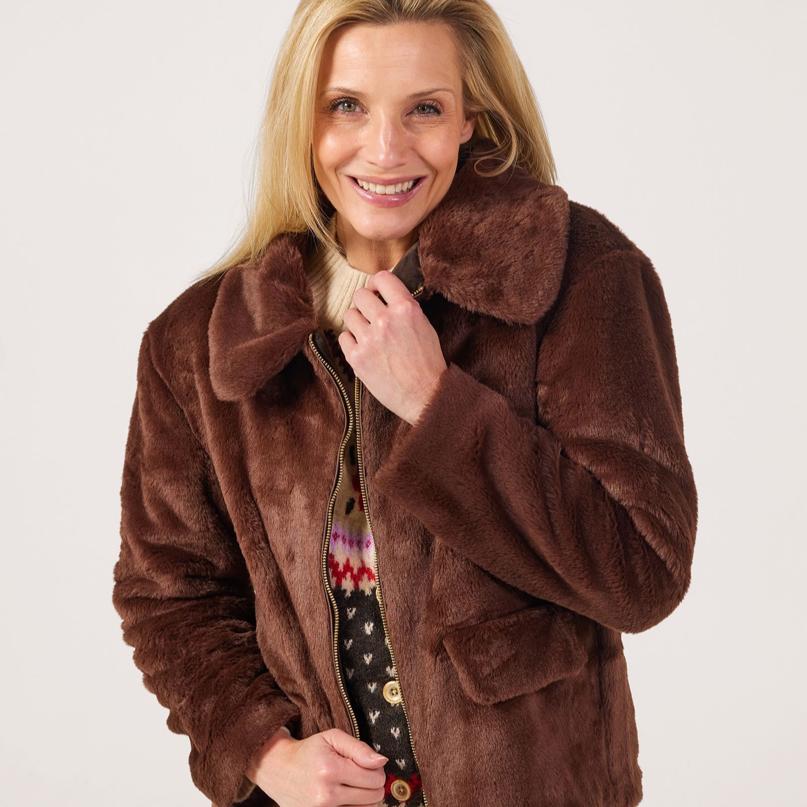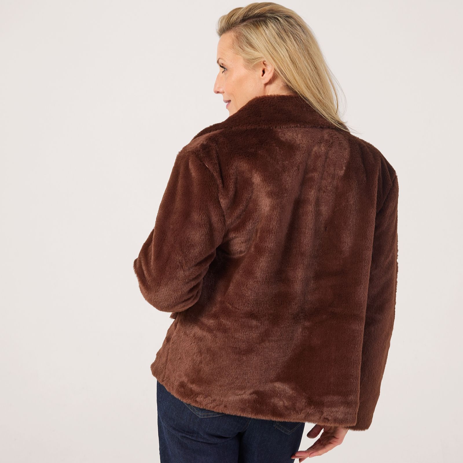 Wrap yourself in luxury with the Helene Berman Super Soft Faux Fur Coat, a chic short coat designed to keep you cosy through winter with its plush texture and elegant silhouette. Featuring metallic zip detailing, practical side seam pockets, and decorative pocket flaps, this lined coat is perfect for elevating both day and evening looks. Try pairing it with tailored trousers or a sleek dress for effortless sophistication.