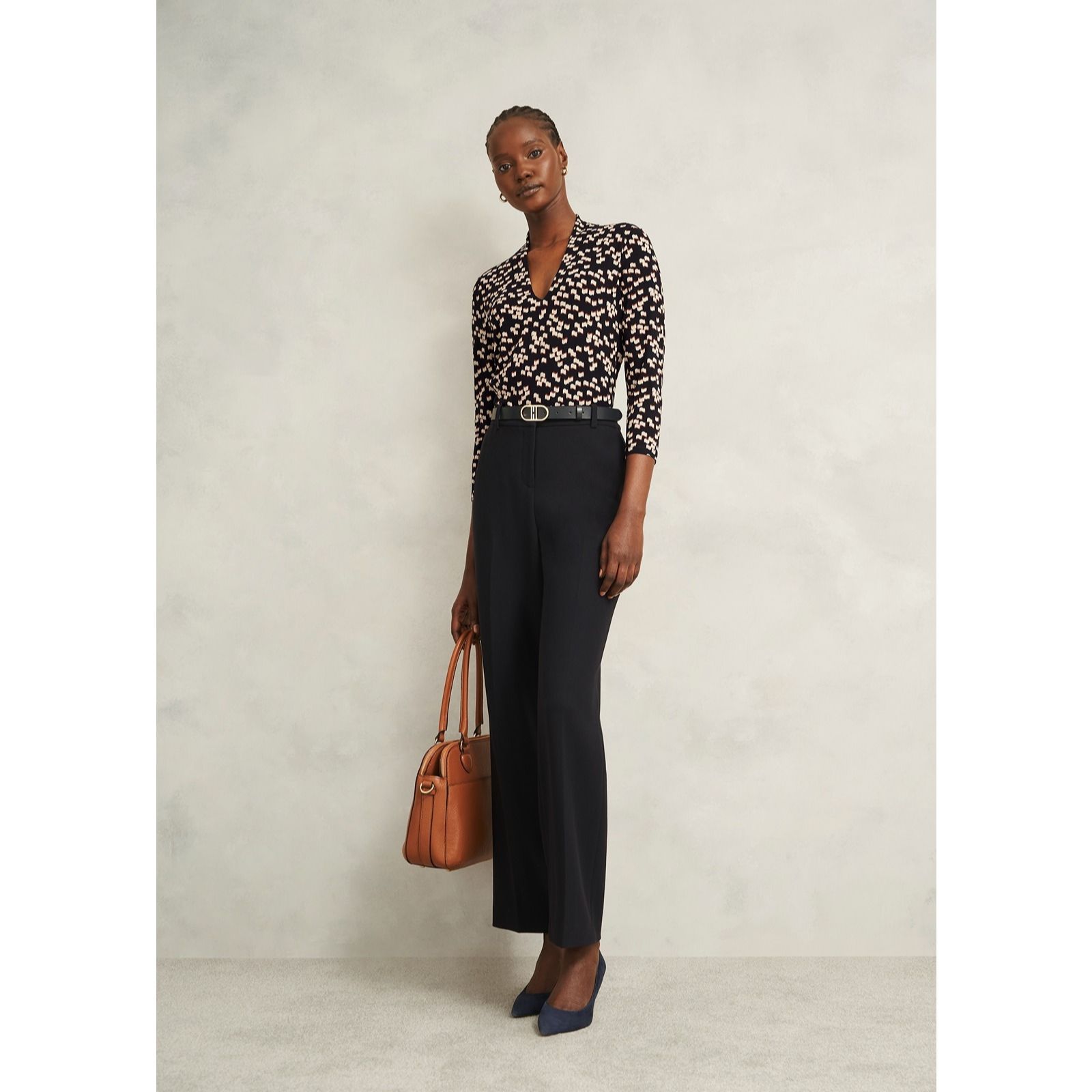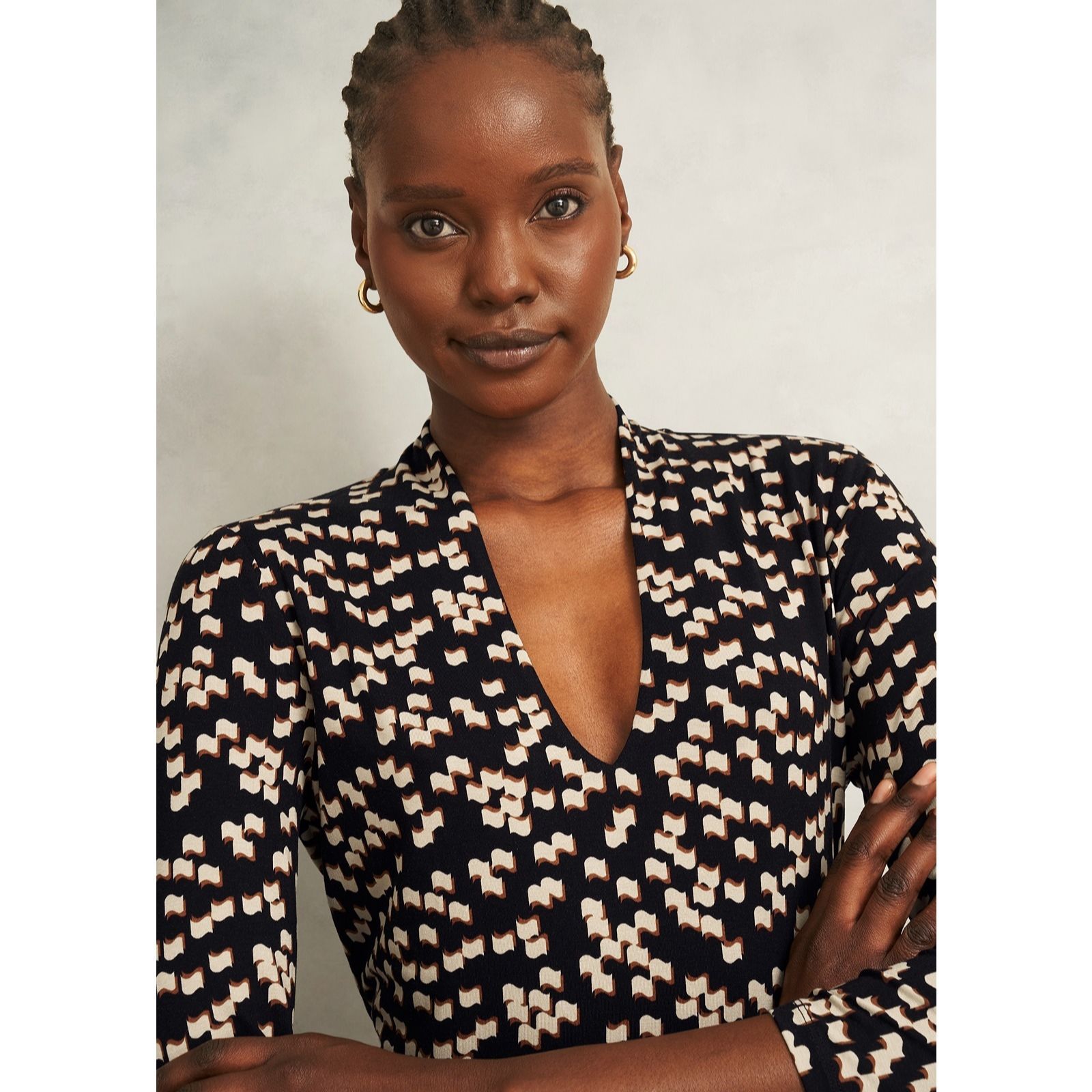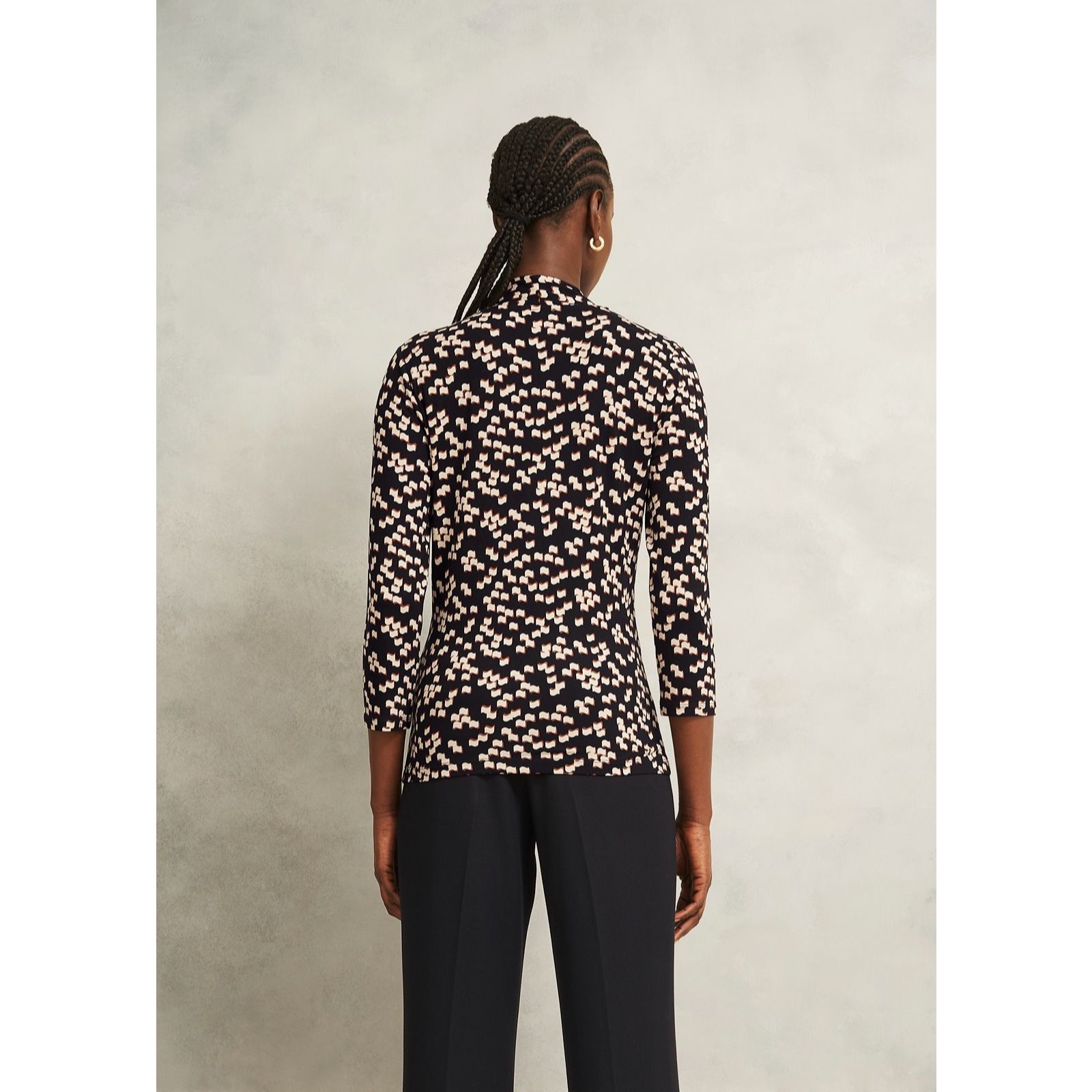 Add a contemporary polish to your wardrobe with the Aimee printed top from Hobbs London. Showcasing a striking graphic print in versatile navy and ivory, this slim-fit design features a classic V-neckline and elegant three-quarter sleeves. Perfect for both workdays and weekends, it transitions seamlessly from office meetings to evening dinners. Pair it with tailored trousers for a refined look or style with jeans for effortless chic.