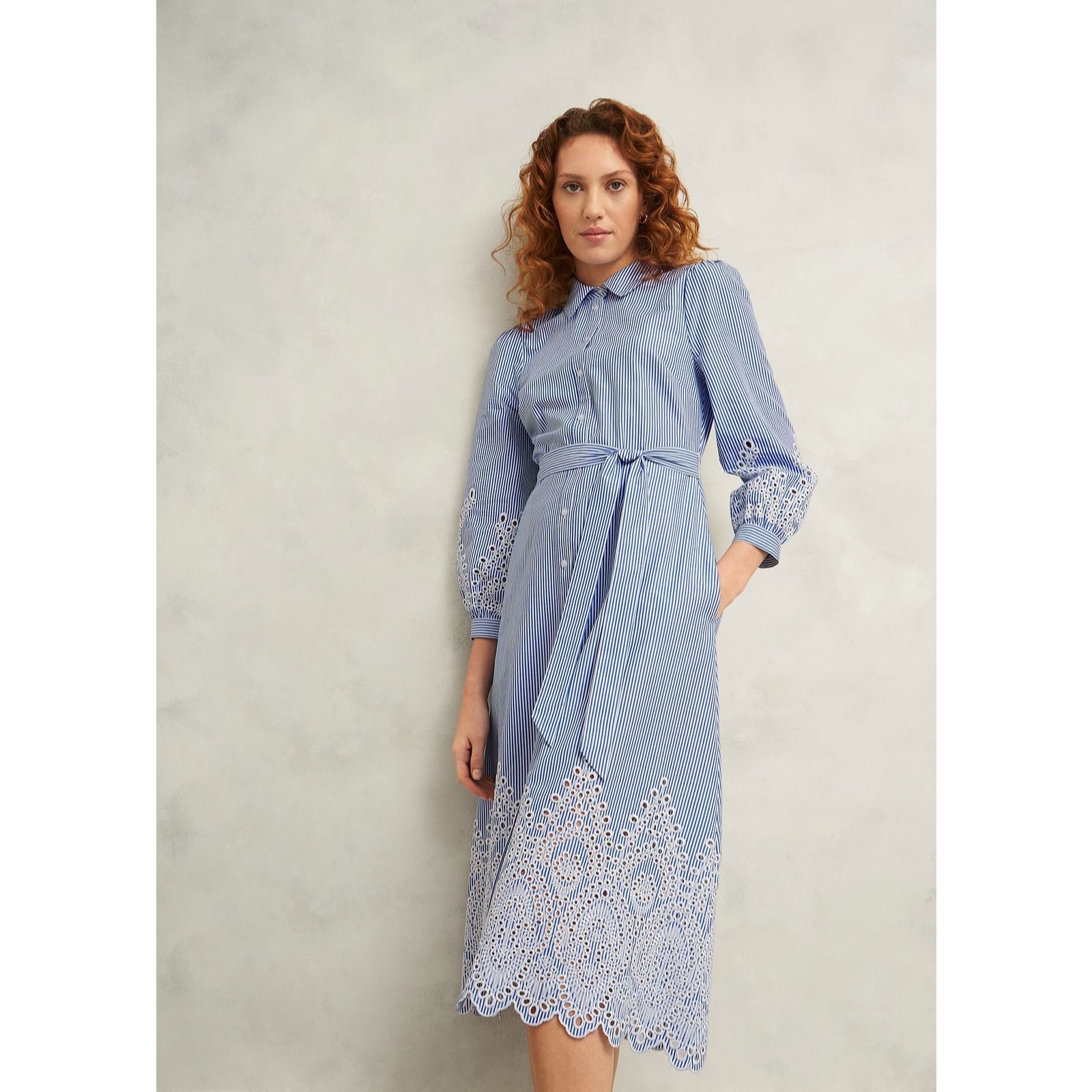 Blending classic charm with contemporary flair, the Juliette shirt dress from Hobbs London brings together breezy broderie trims and crisp summer stripes for a look that effortlessly moves from workdays to weekends. The tie waist flatters your shape, while three-quarter sleeves add a touch of laid-back sophistication. Pair with espadrilles and a sunhat for daytime outings or dress it up with wedges for evening plans.