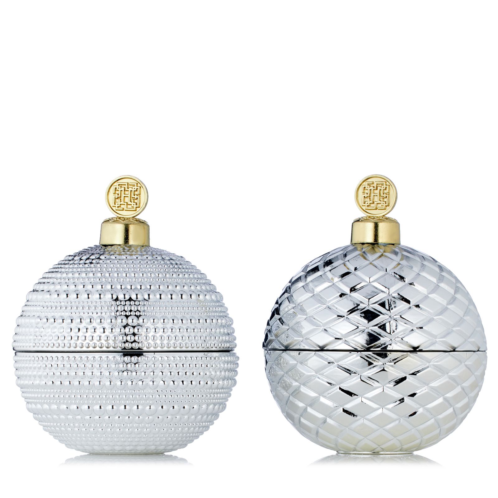 Bring festive charm to your home with this HomeWorx by Slatkin + Co Set of 2 Glass Ornament Bauble Candles, each crafted in embossed metallic silver glass with a hobnail and faceted pattern, finished with a custom gold tone lid. Perfect for seasonal gatherings or cosy nights in, these baubles fill your space with the uplifting Candy Cane Martini scent and can be reused as decorative accents once the candles are finished.
