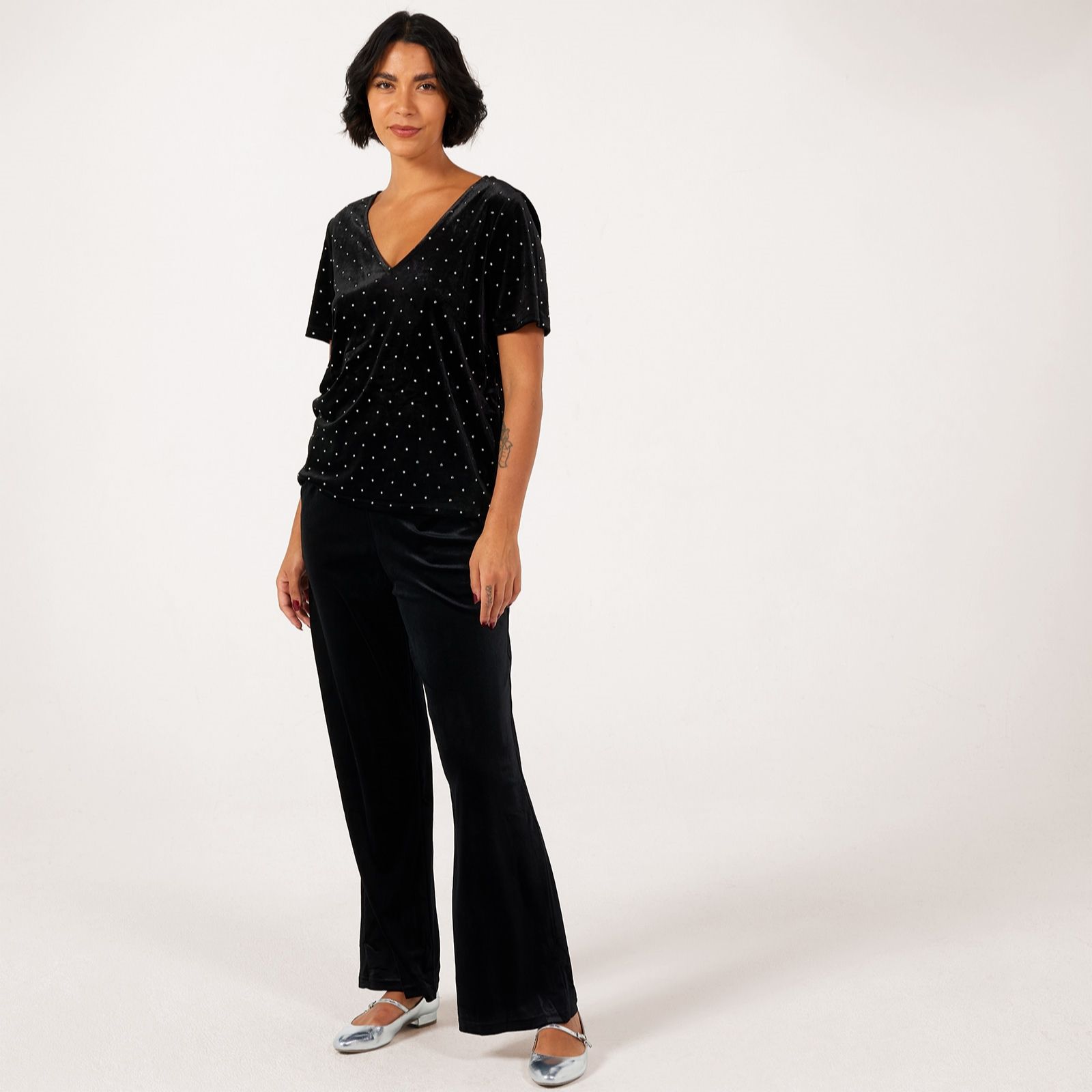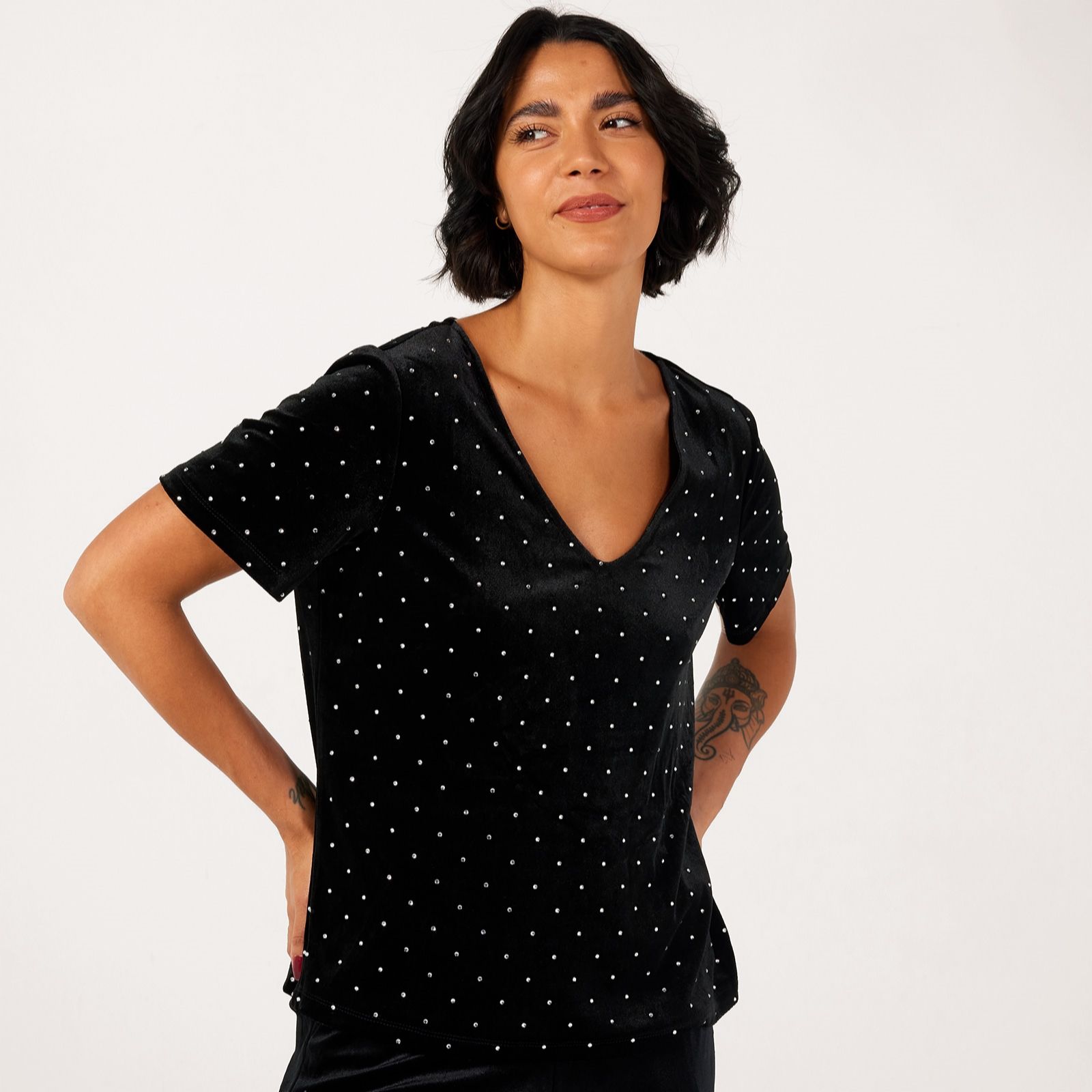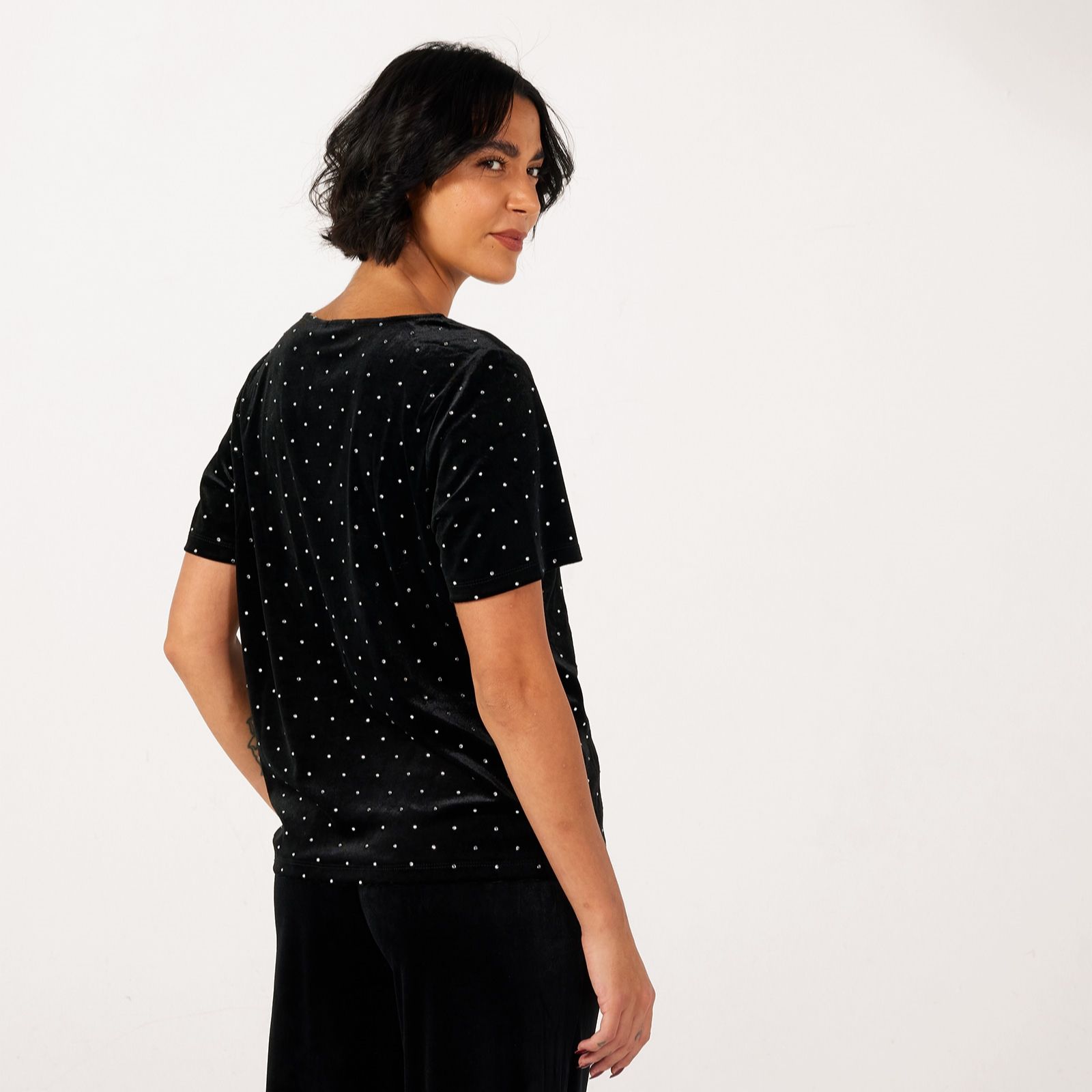 Unveil effortless glamour with the Darla velvet embellished short sleeve top from ICHI. This black T-shirt combines a regular fit with a plush, velvety texture and sparkling embellishments, making it perfect for evenings out or adding a luxe twist to your everyday style. Pair it with tailored trousers or a sleek skirt for a look that transitions seamlessly from day to night.