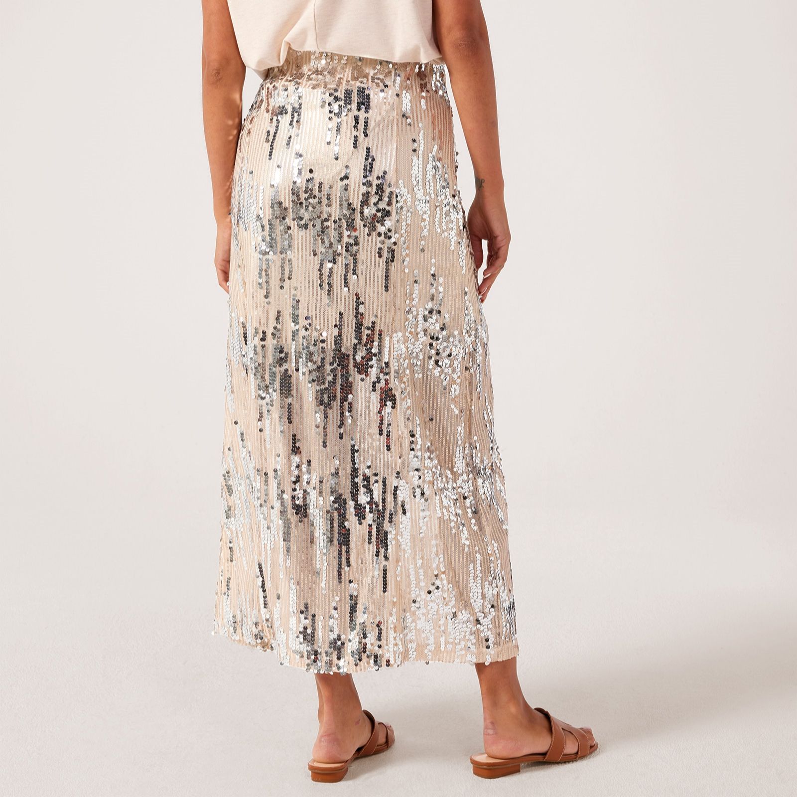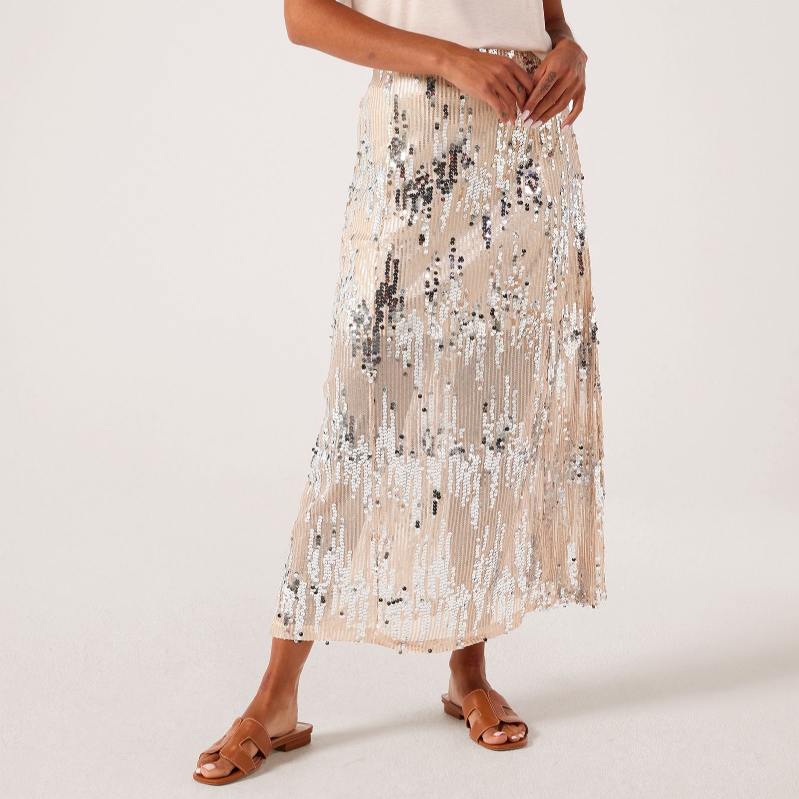 Light up every occasion with the Maulina sequin skirt from ICHI, designed in a gorgeous long length with a comfortable elasticated waist and shimmering sequins that catch the light with every step. This standout skirt is perfect for parties, dinners or whenever you want to add a sparkle to your day. For a chic ensemble, style it with a simple blouse and ankle boots or dress it down with a cosy knit.