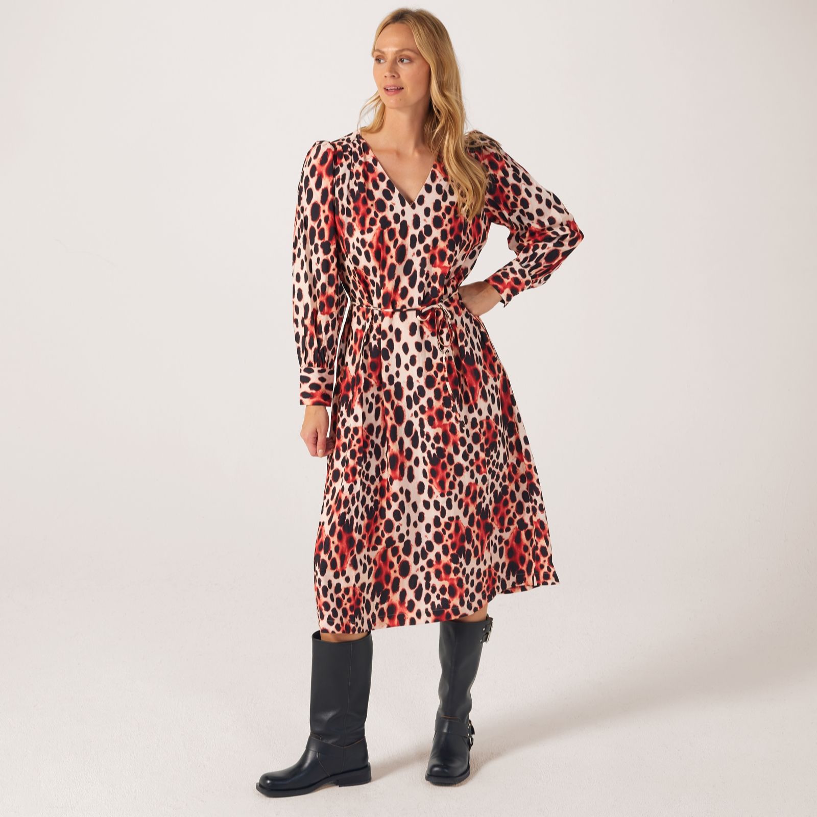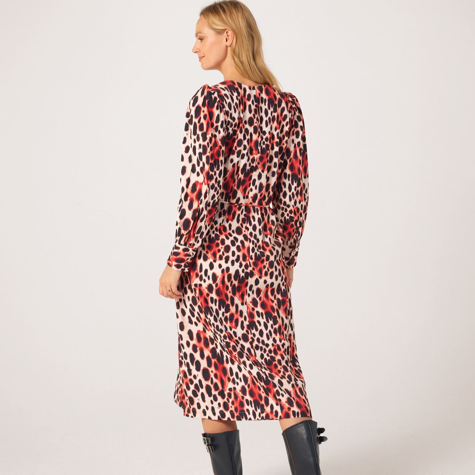 Indulge in the wild charm of the ICHI Yasmeen dress, a stylish midi dress in an all-over leopard print that effortlessly combines elegance and edge. Featuring a V-neckline and slight princess sleeves with wide cuff details and functional fabric-covered buttons, this dress is designed to make a statement. The loose fit and optional belt allow you to customise your silhouette, making it perfect for both casual outings and more formal occasions. Pair it with strappy heels for a chic look or with trainers for a laid-back vibe.