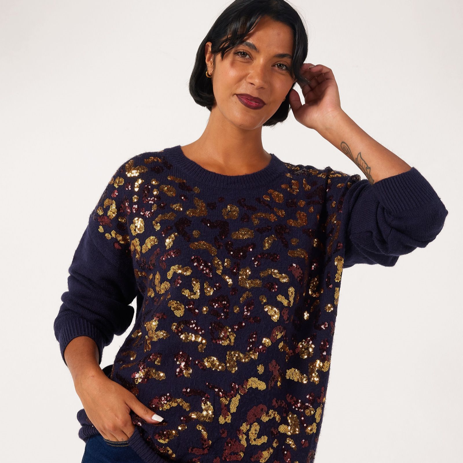 Bring a touch of sparkle to your everyday style with this animal print sequin jumper from Izabel London. The bold print is lifted with shimmering sequin embellishments, creating a look that's both playful and chic. Perfect for dressing up your casual denim or adding personality to your workwear, its a versatile piece that transitions effortlessly from day to night. Try pairing it with tailored trousers and ankle boots for a polished yet relaxed vibe.