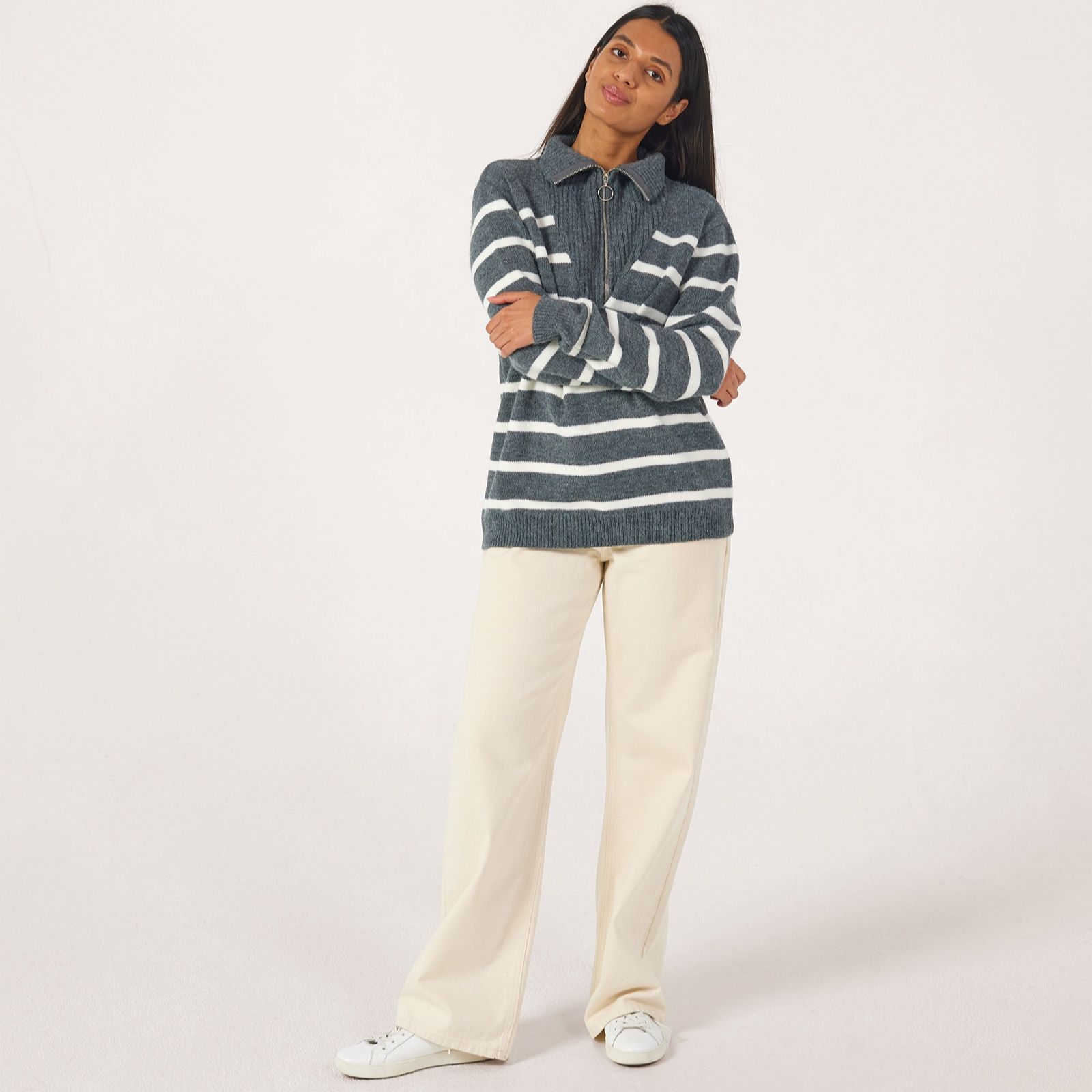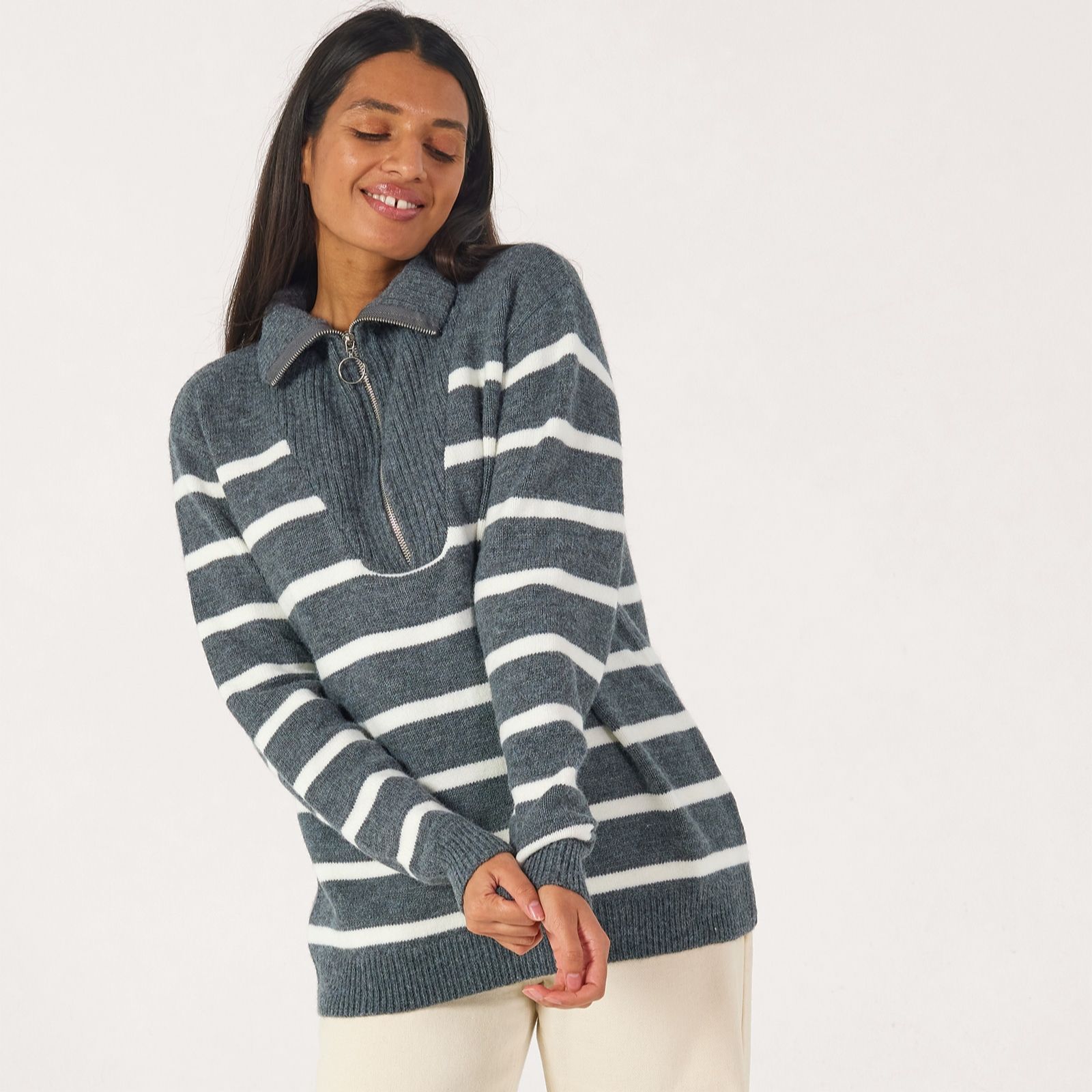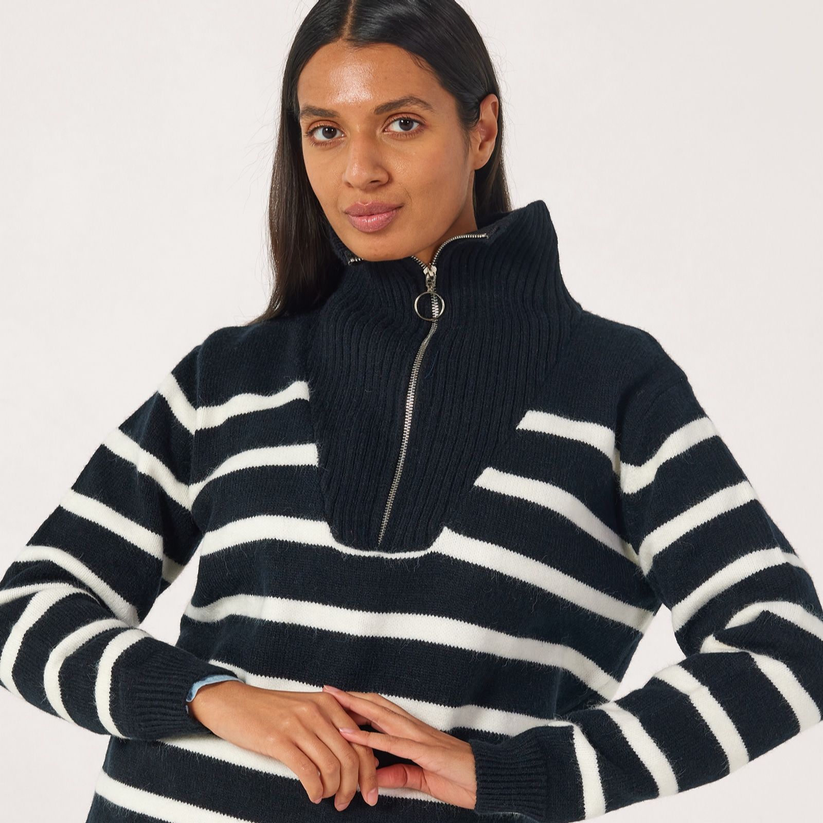 Add a fresh twist to your everyday looks with this half zip stripe jumper from Izabel London, designed with a bold striped pattern and contemporary zip front detail. Perfect for everything from relaxed weekends to coffee catch-ups, this knit pullover brings modern style to your wardrobe. Try layering it over a crisp white shirt and teaming with jeans for a chic, laid-back ensemble.