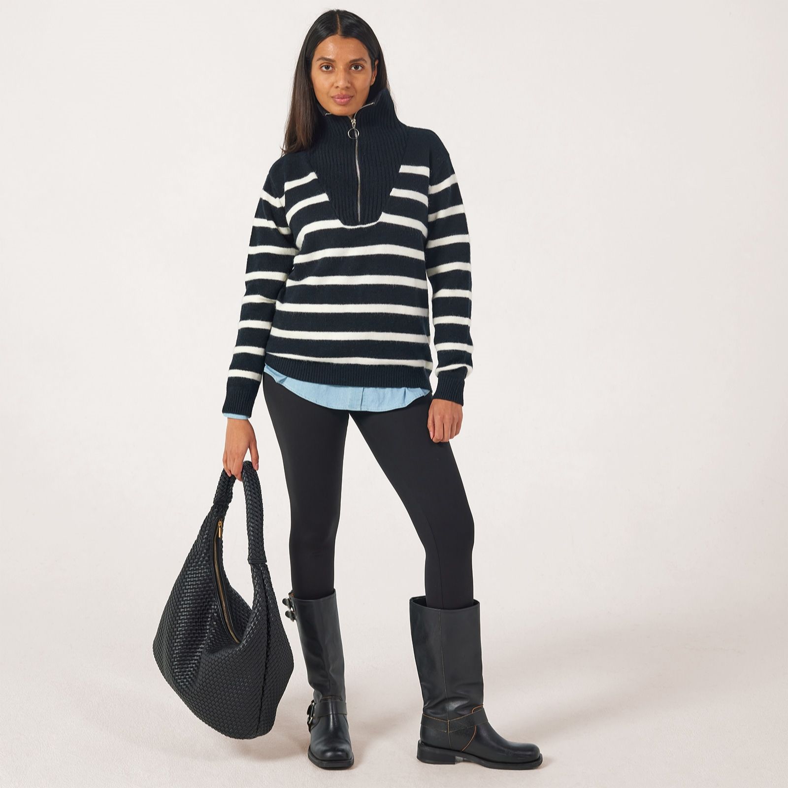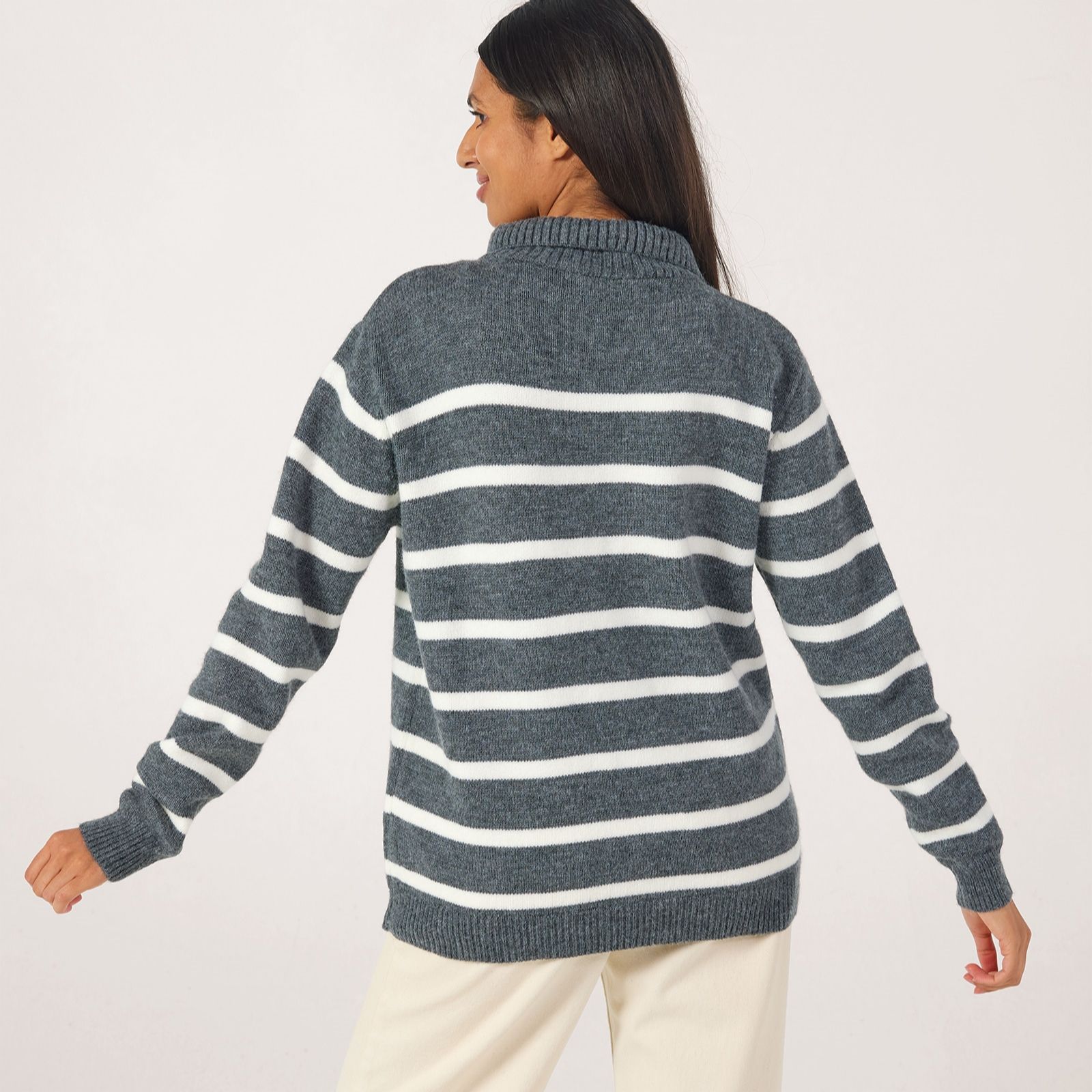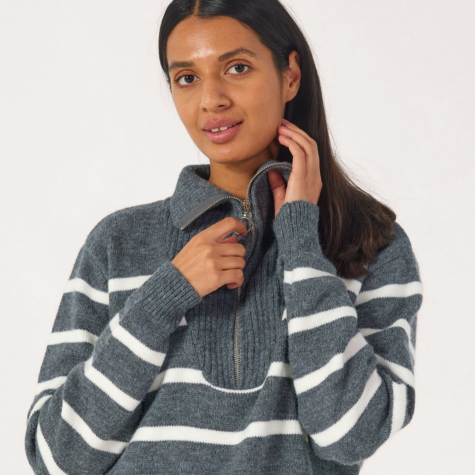 Add a fresh twist to your everyday looks with this half zip stripe jumper from Izabel London, designed with a bold striped pattern and contemporary zip front detail. Perfect for everything from relaxed weekends to coffee catch-ups, this knit pullover brings modern style to your wardrobe. Try layering it over a crisp white shirt and teaming with jeans for a chic, laid-back ensemble.