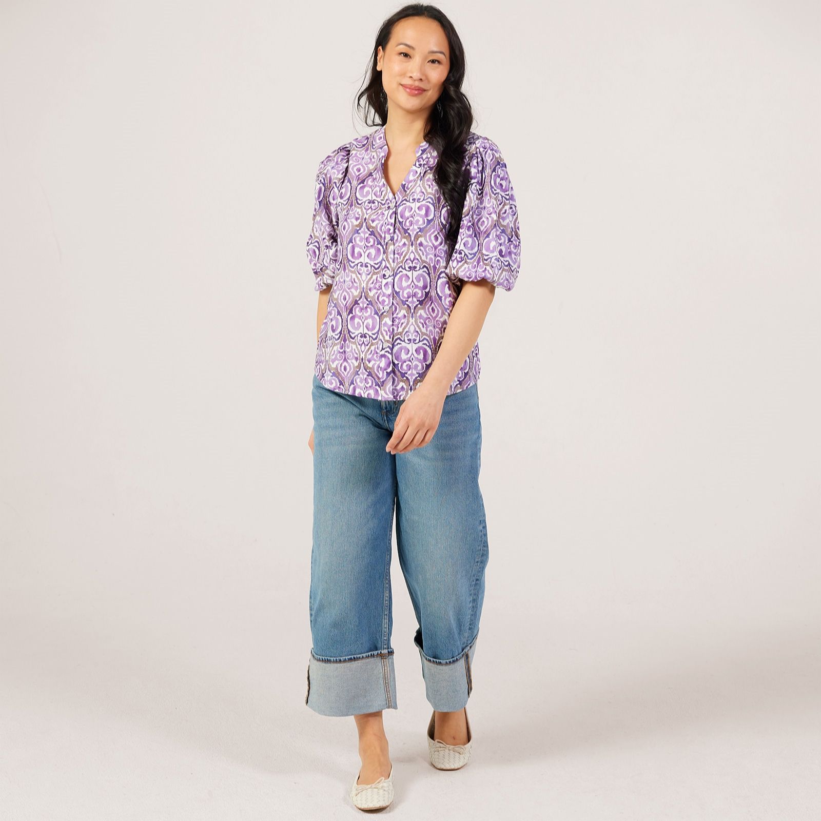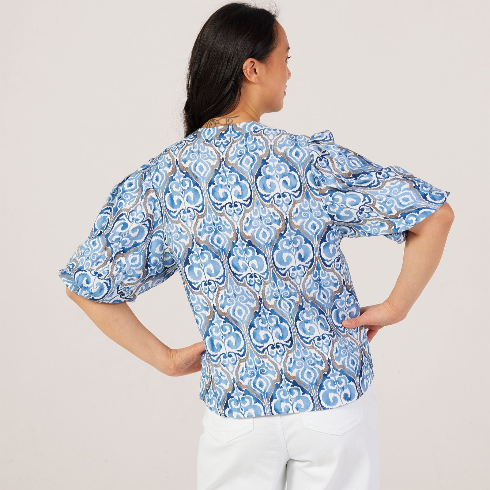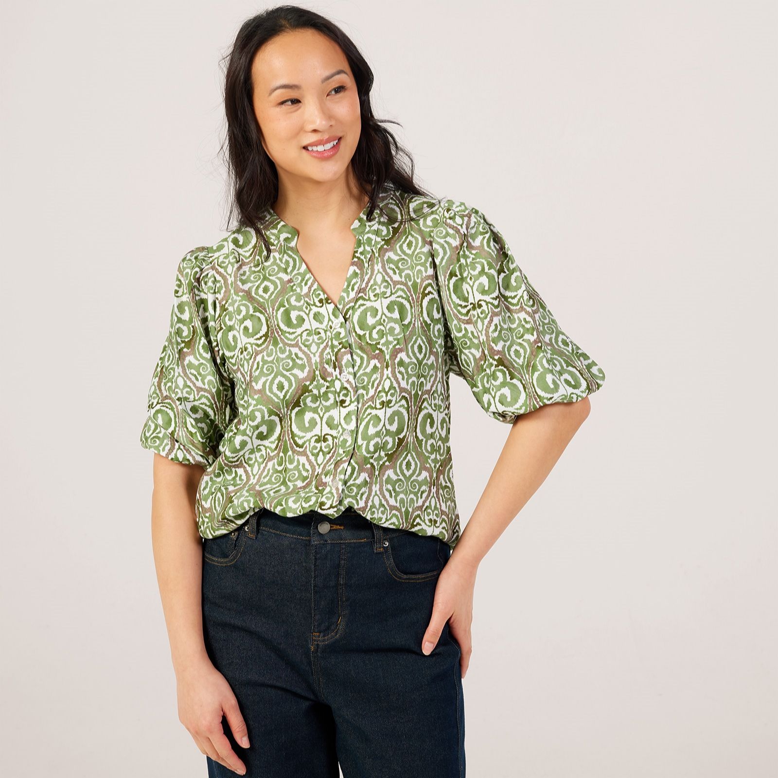 Infuse your wardrobe with the artistic charm of the Ikat printed blouse from Izabel London, where soft hues create a captivating all-over design. Perfect for casual days, office wear or weekend outings, its button-through front and easy fit make it a versatile style staple. Try pairing it with tailored trousers for a smart edge or wear it with jeans for effortless off-duty chic.