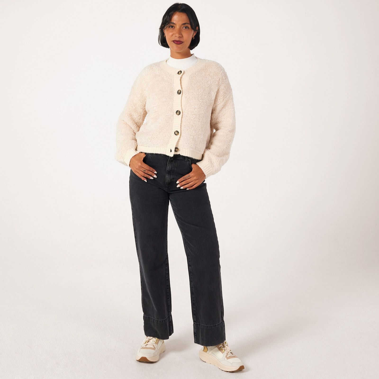 - Dropped shoulders and ribbed cuffs