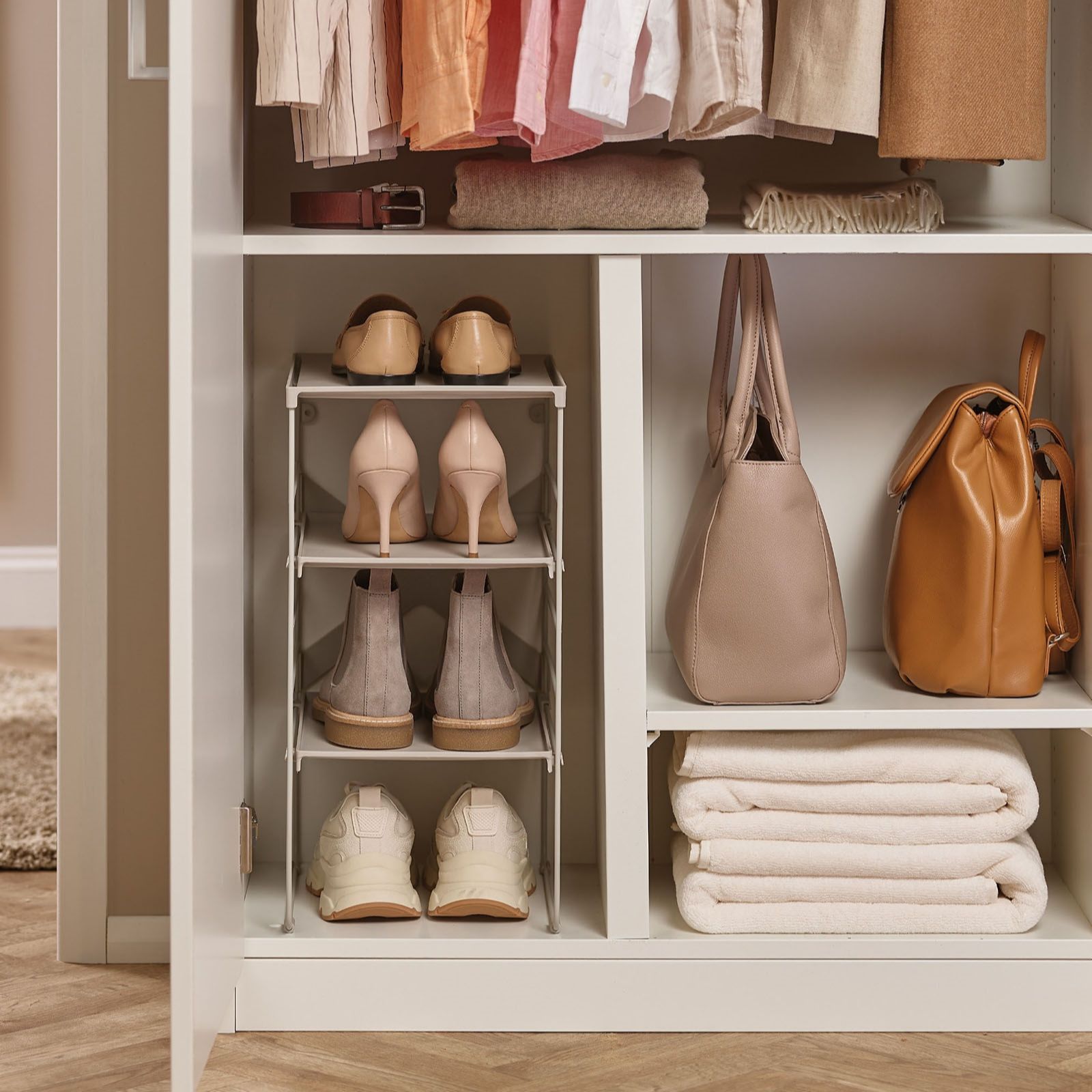 Elevate your home organisation with the Joseph Joseph Level Adjustable Shoe Rack Single. Its adjustable shelves securely clip onto the sturdy steel frame, accommodating up to four pairs of shoes or boots of various shapes and sizes. Ideal for wardrobes, cupboards, utility rooms and hallways, this rack ensures your footwear remains neatly arranged and easily accessible. Plus, you can stack additional racks for even more space and secure them to the wall for added stability.