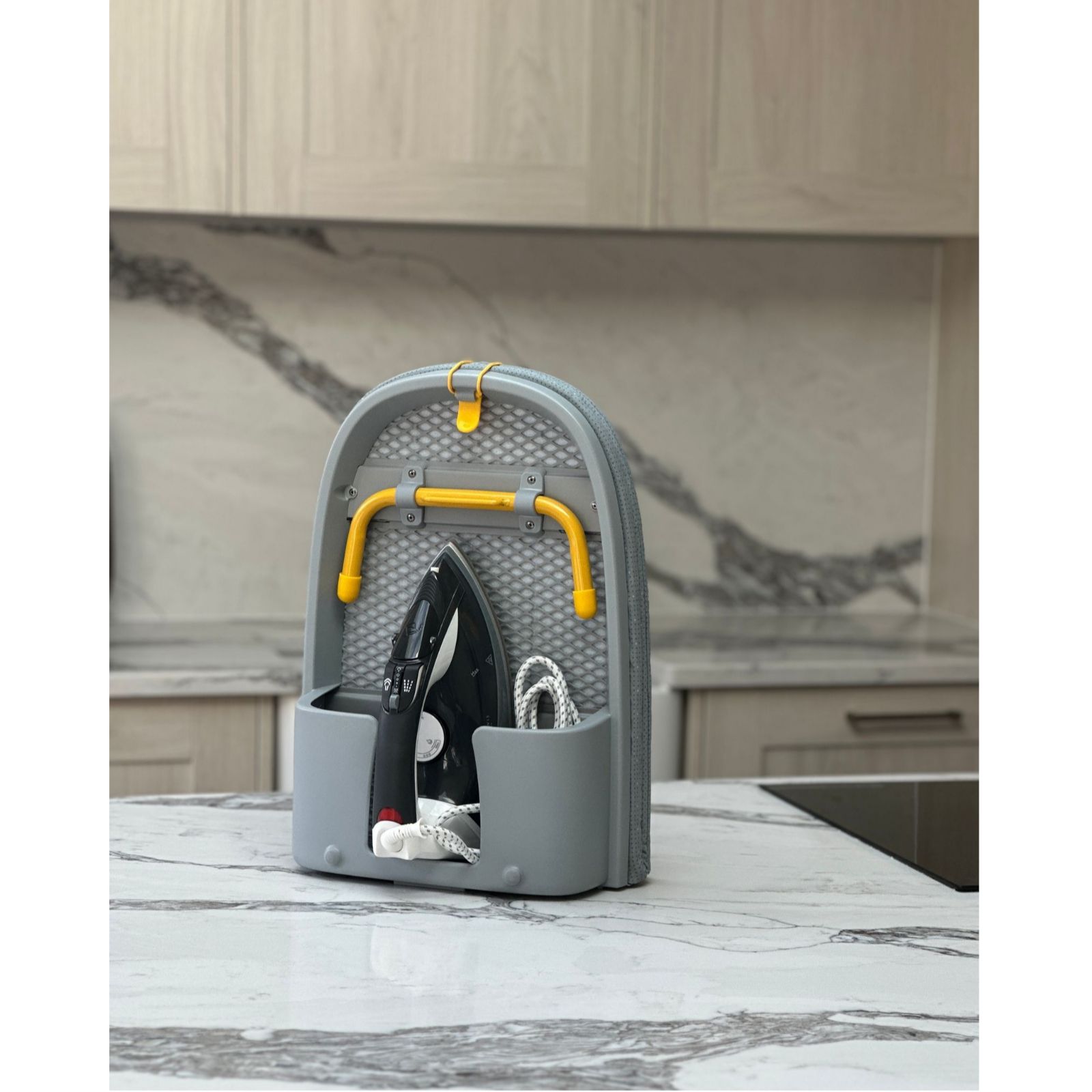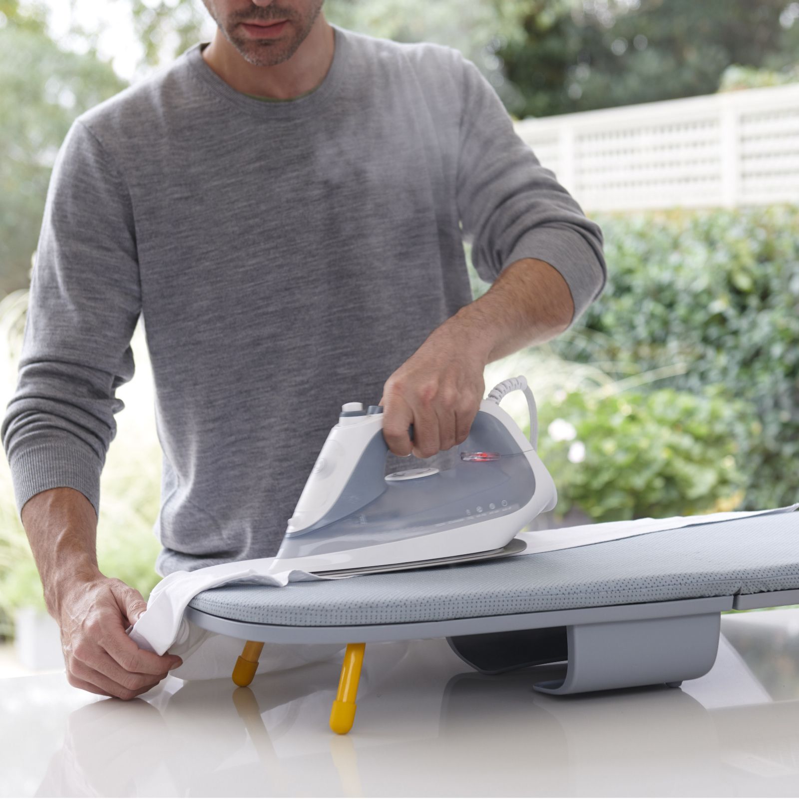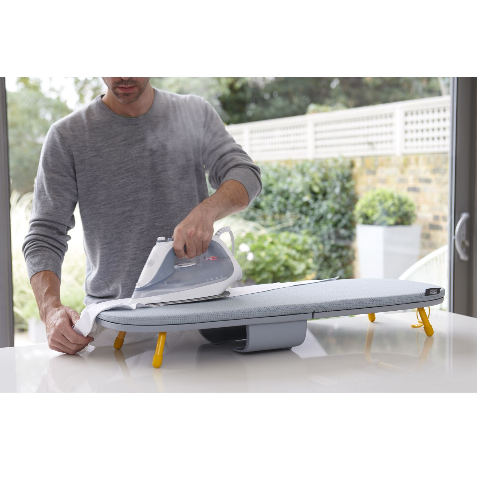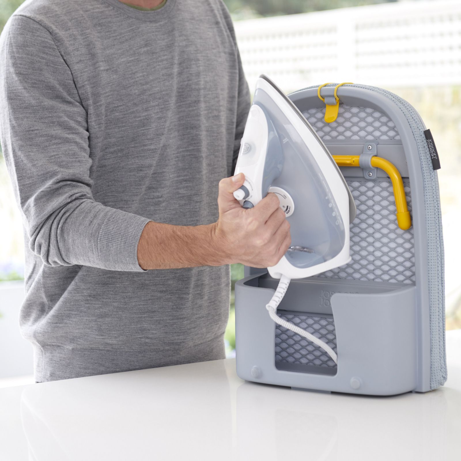 Revolutionise your ironing routine with the Joseph Joseph Pocket Folding Table Top Ironing Board. This compact ironing board is perfect for those with limited storage space or for quickly ironing a few items, while its innovative design allows it to fold neatly in half and includes a hanging hook for easy storage on a wall or door. The generous ironing surface is ideal for shirts, trousers, dresses and more, and the cover comprises a 100% cotton top layer with a thick padded felt underlay for smooth ironing.