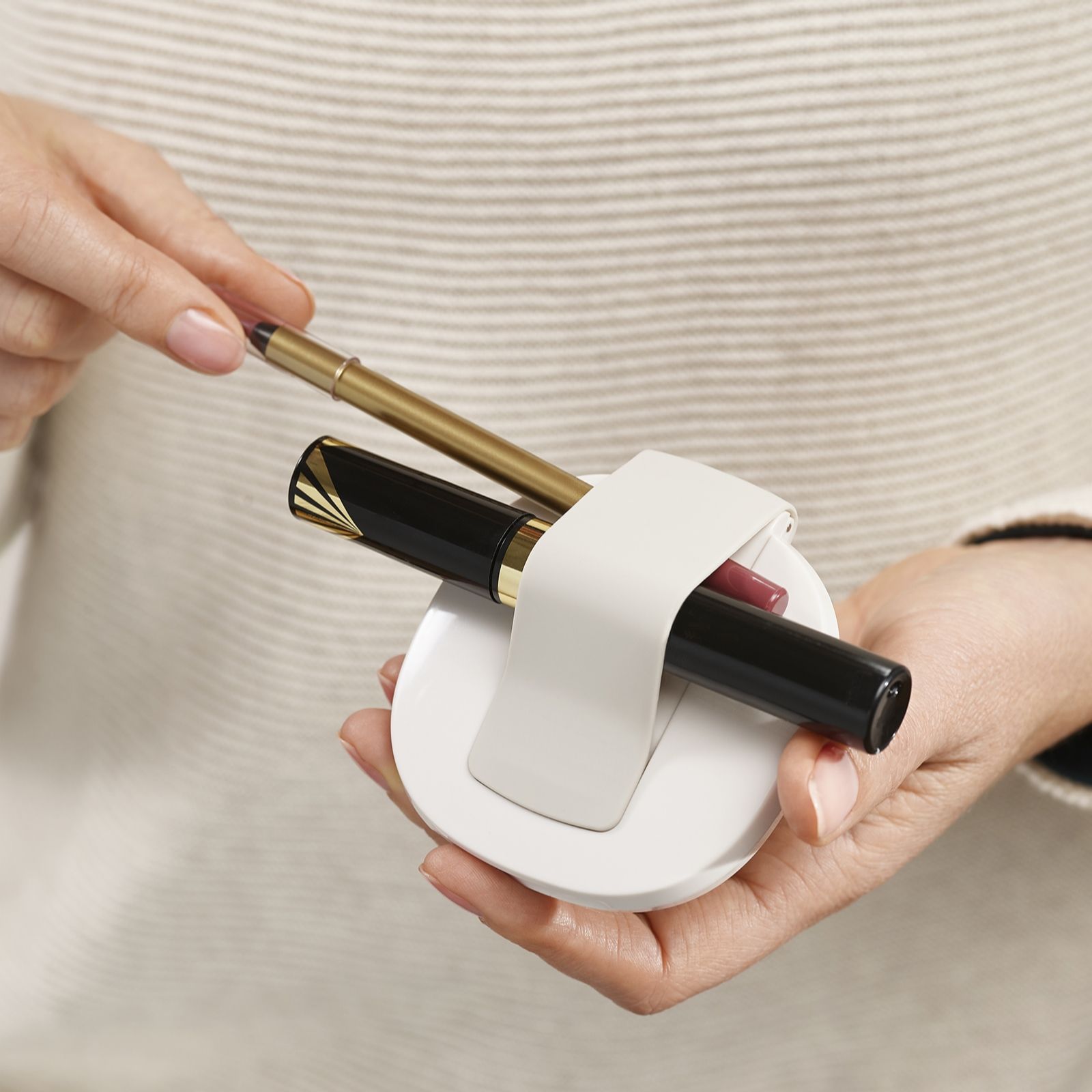 Check and perfect your make-up on the go with the Joseph Joseph Viva 2-in-1 Compact Mirror. This elegant mirror features a standard mirror giving you a distortion-free view of your entire face, plus a 3x magnifying mirror for fine detail work such as applying mascara. A soft, silicone strap provides a handy finger loop for holding the mirror securely when using and also a convenient place to store small make-up essentials like an eyeliner pencil, lipstick, or mascara. Finally, a magnetic closure keeps the mirror securely closed in your bag.