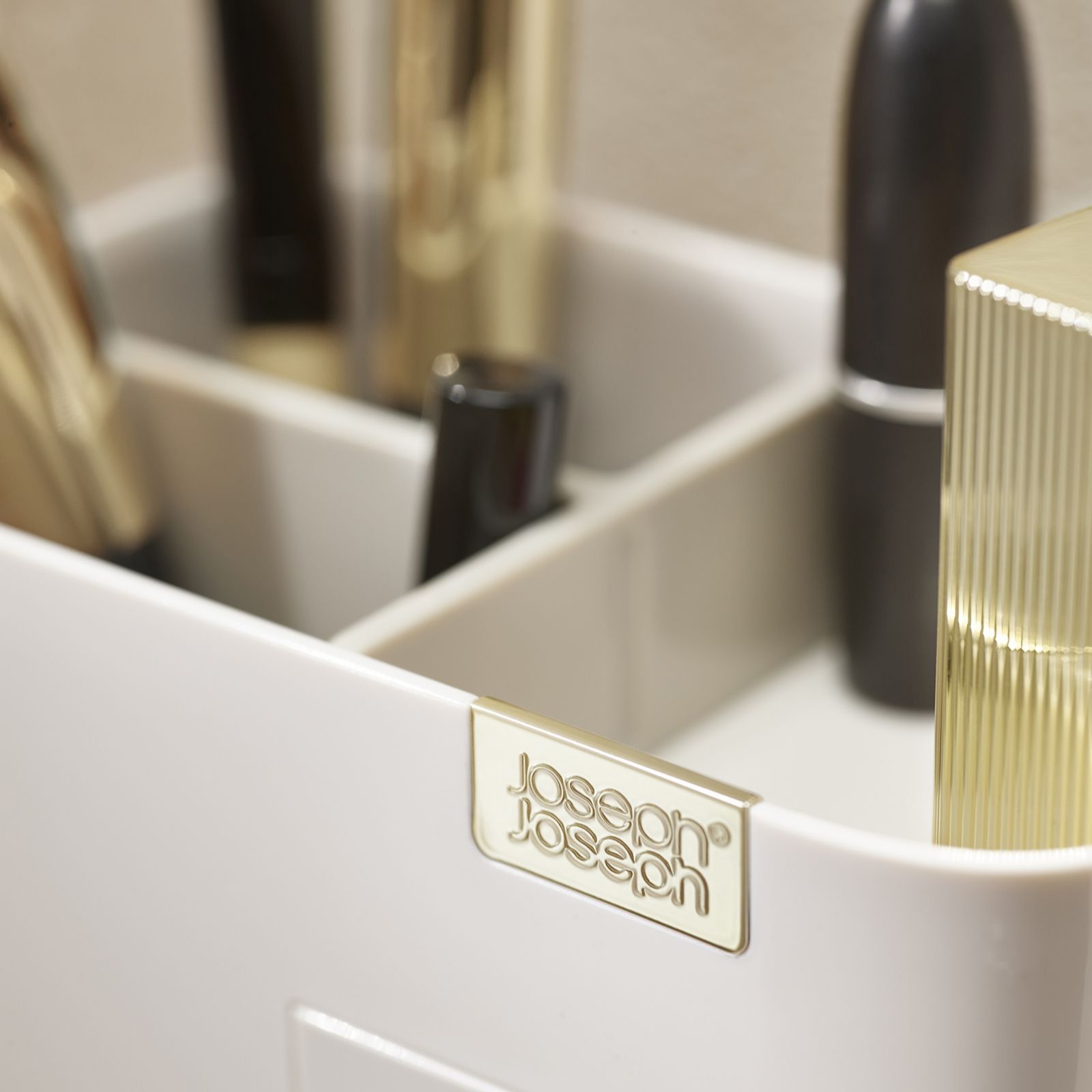 Get organised with the Joseph Joseph Viva Compact Organiser with Drawer. This sleek and practical caddy features both deep and shallow compartments, perfect for storing a variety of beauty essentials such as makeup brushes, mascaras and eye shadows. The small drawer, equipped with an easy pull tab and a self-locating magnetic closure, is ideal for smaller items like cotton wool pads, cotton buds or make-up sponges. Finished with a chrome-plated badge detail, this organiser is perfect for limited dressing table space.