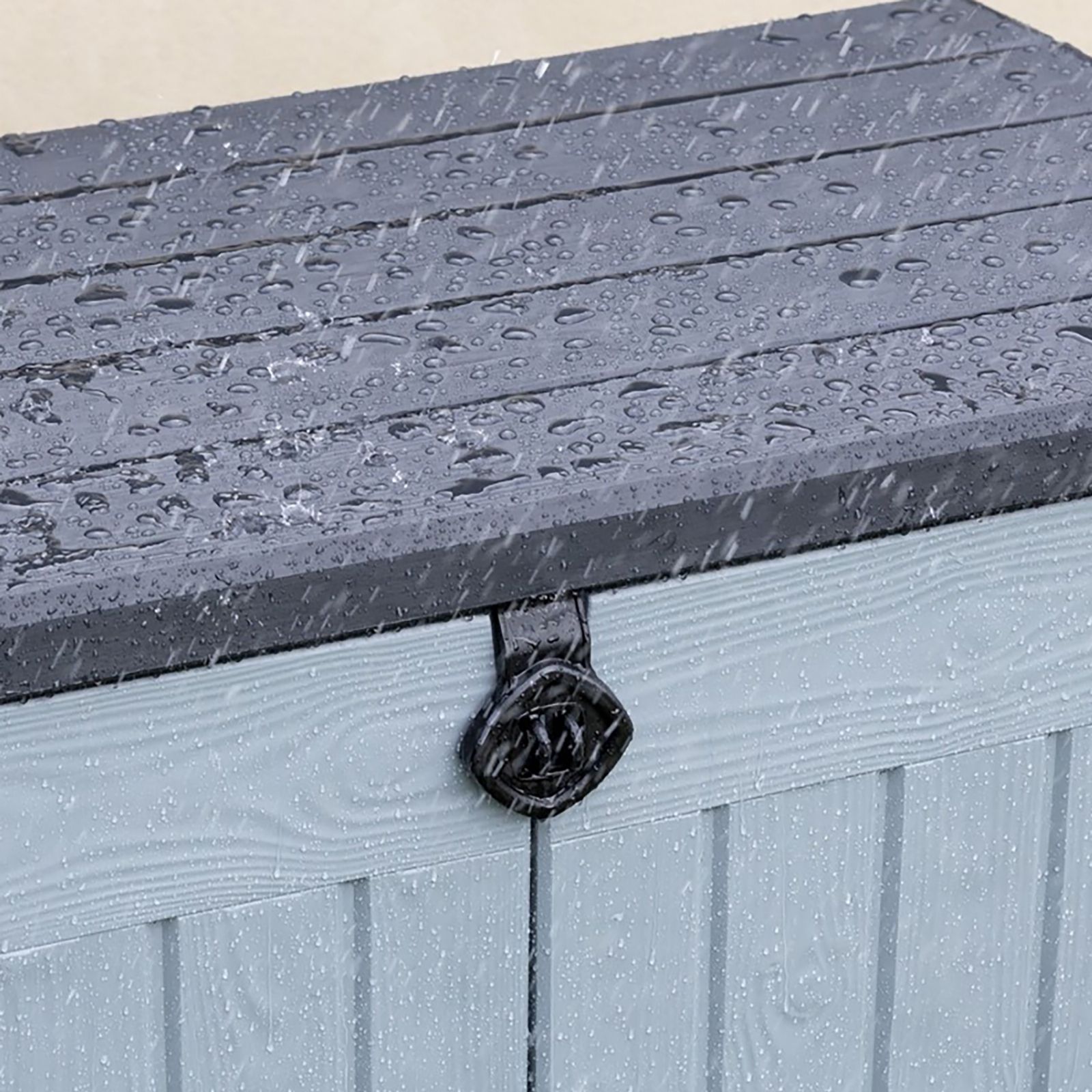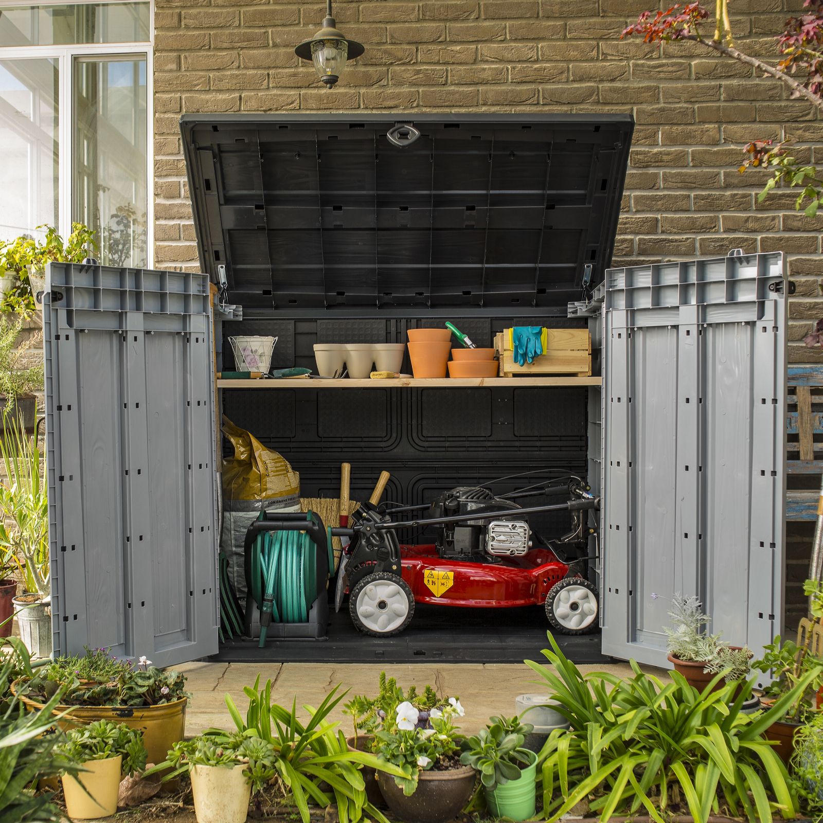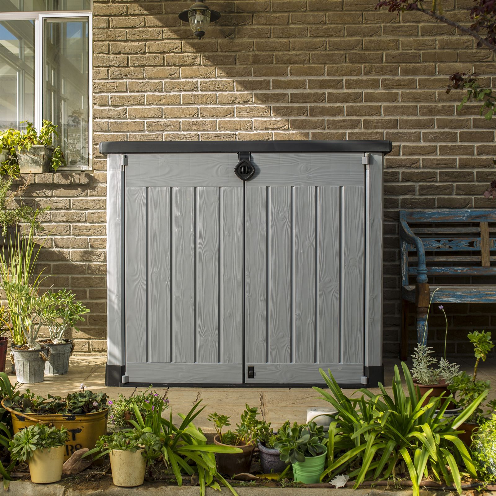 Keep your garden neat and tidy with the Keter Store It Out Ace 1200L. This is the perfect outdoor storage solution, boasting enough space for lawnmowers, cushions, brooms, rakes, planters, or even two 240L wheelie bins. Elegant but durable wood effect panels keep everything clean and dry, while the liftable lid and front double doors make access a breeze, whether you're top loading your bins or getting out your cushions to enjoy a sunny day. And lockable lids ensure everything's securely squared away once you're done.