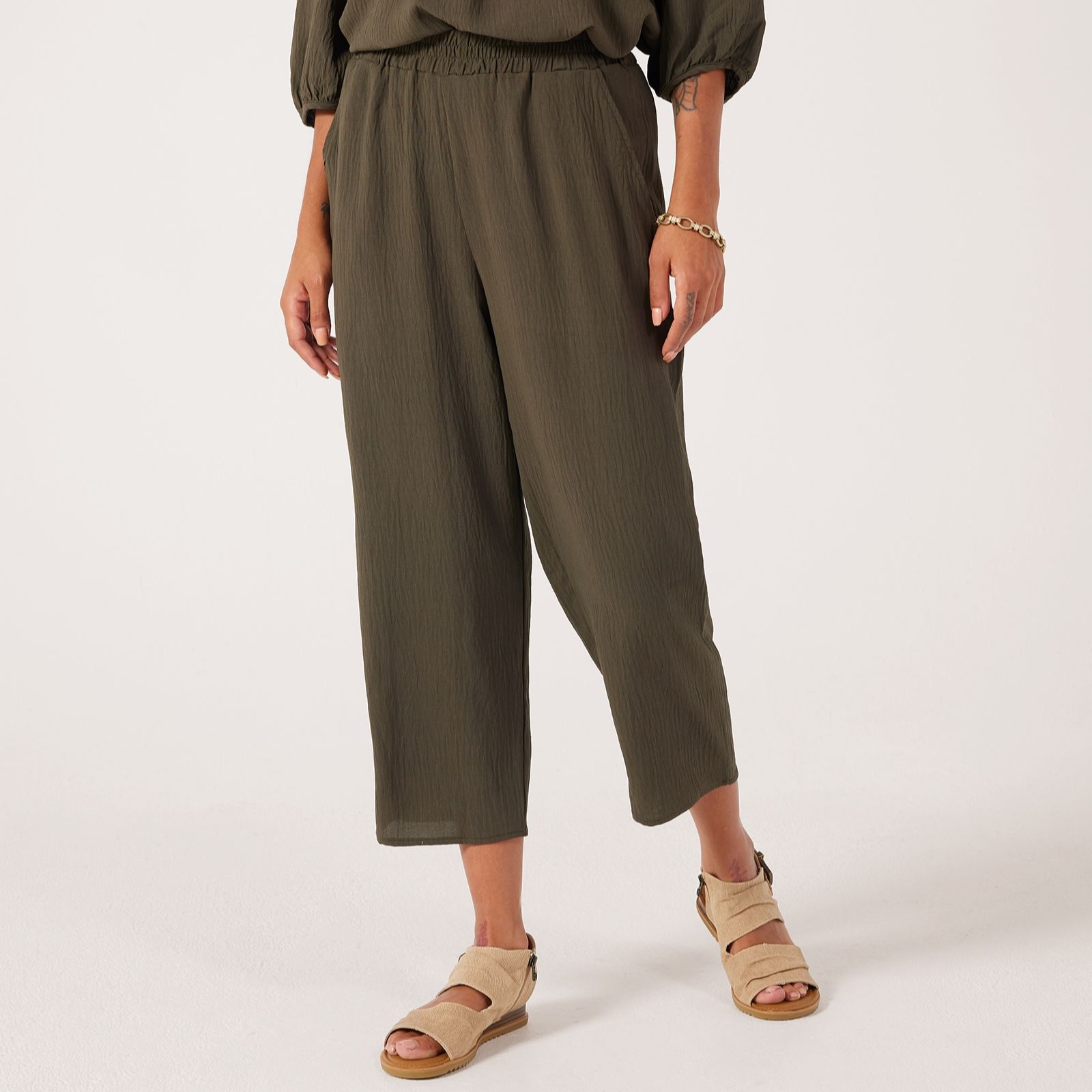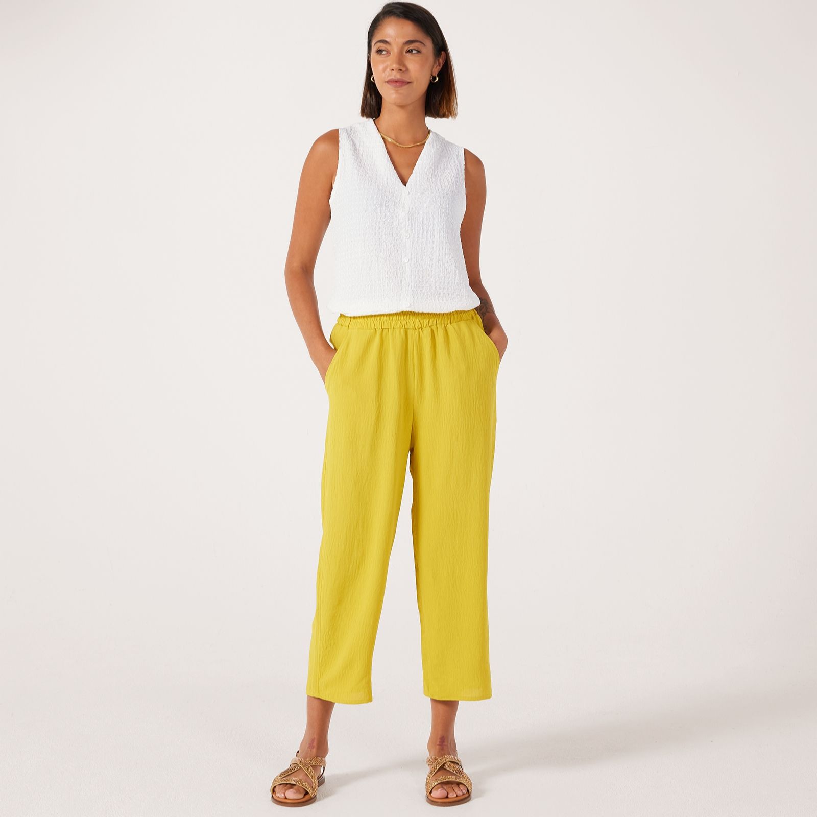 Slip into laid-back style with these crinkle poplin relaxed trousers from Kim & Co in a standard length. These everyday trousers feature a cropped length and elasticated waist that promise all-day comfort, while the slanted front pockets lend a practical touch to your look. Perfect for running errands or meeting friends, try pairing them with a loose blouse and sandals for a carefree outfit.