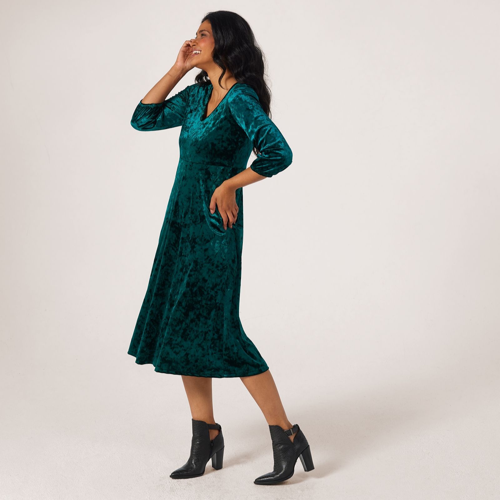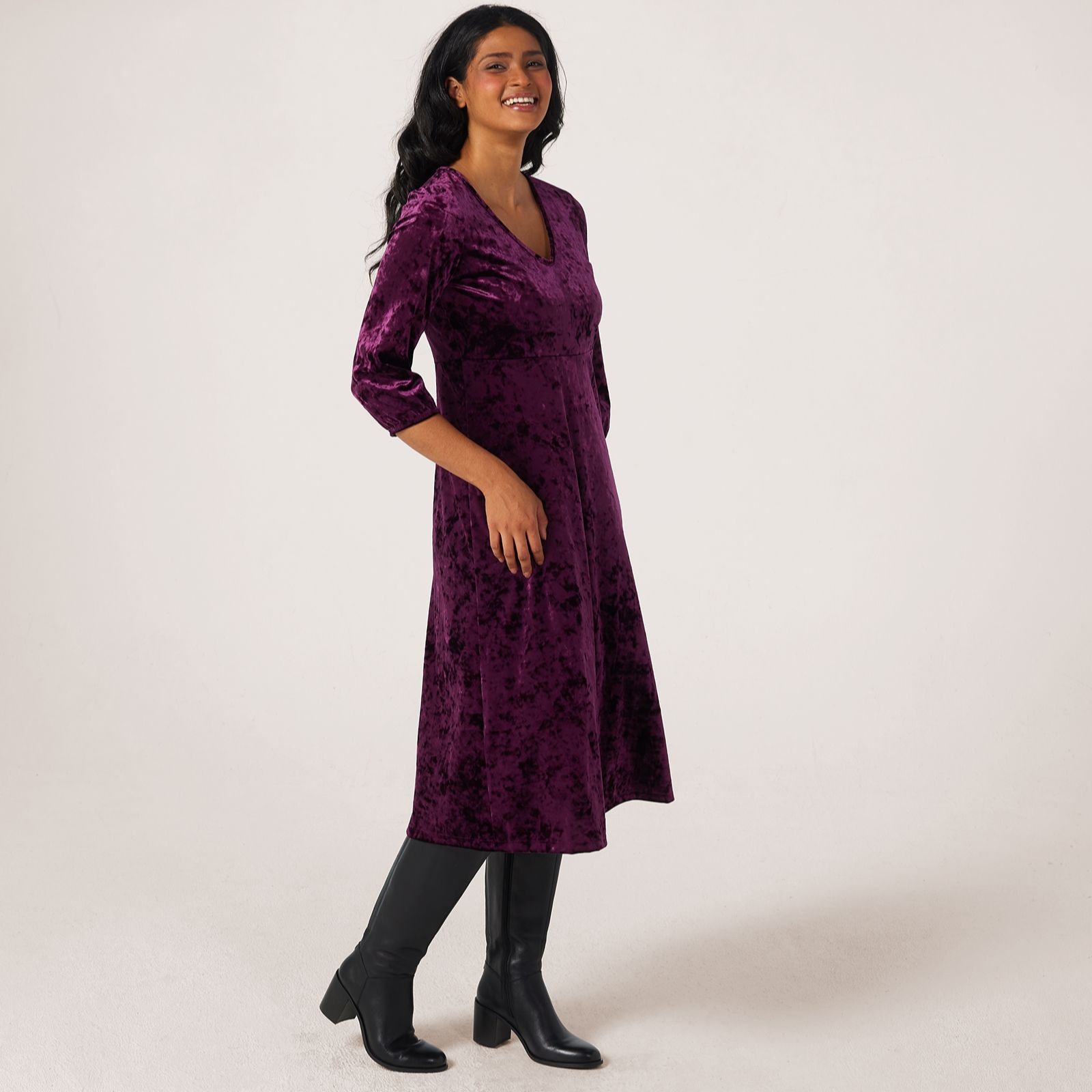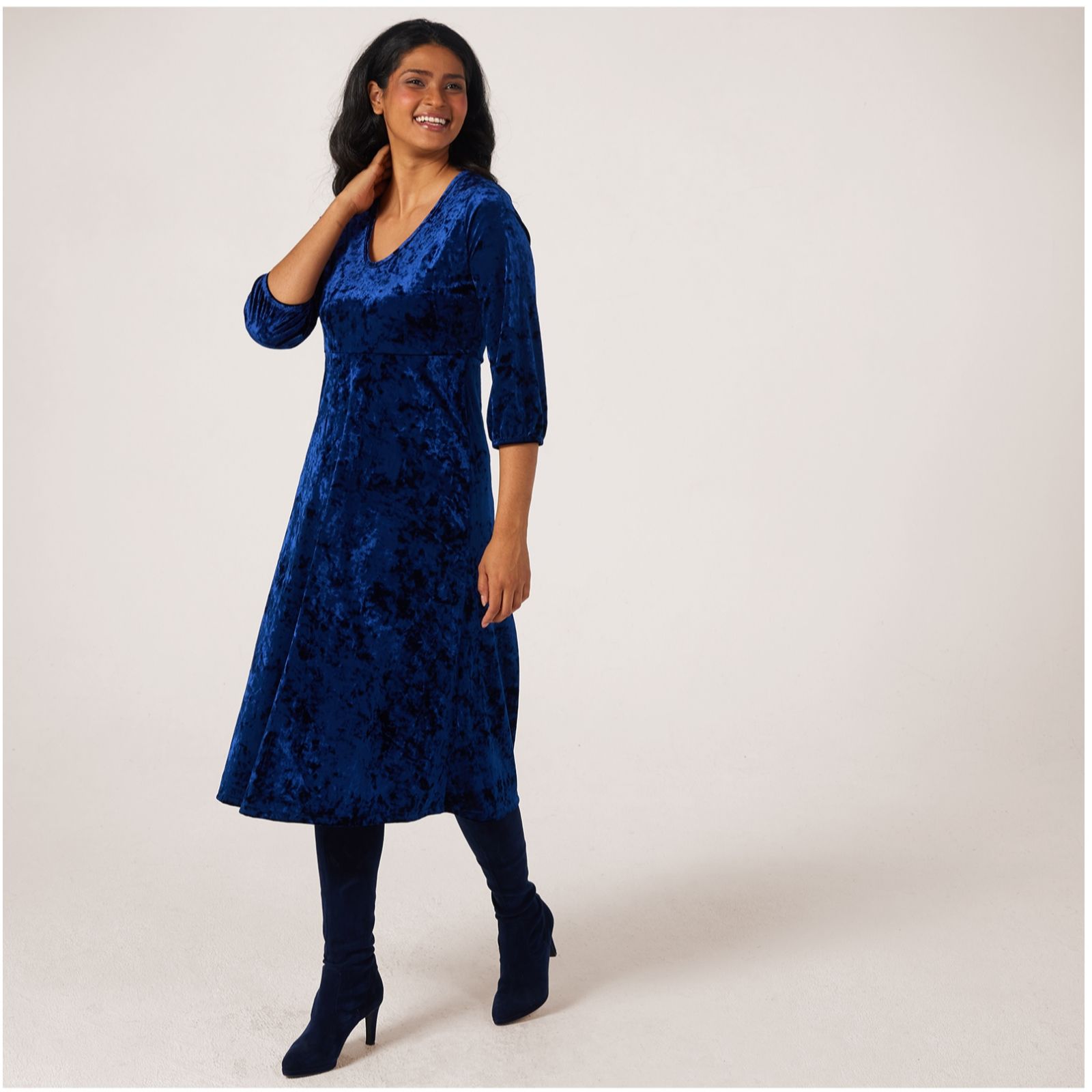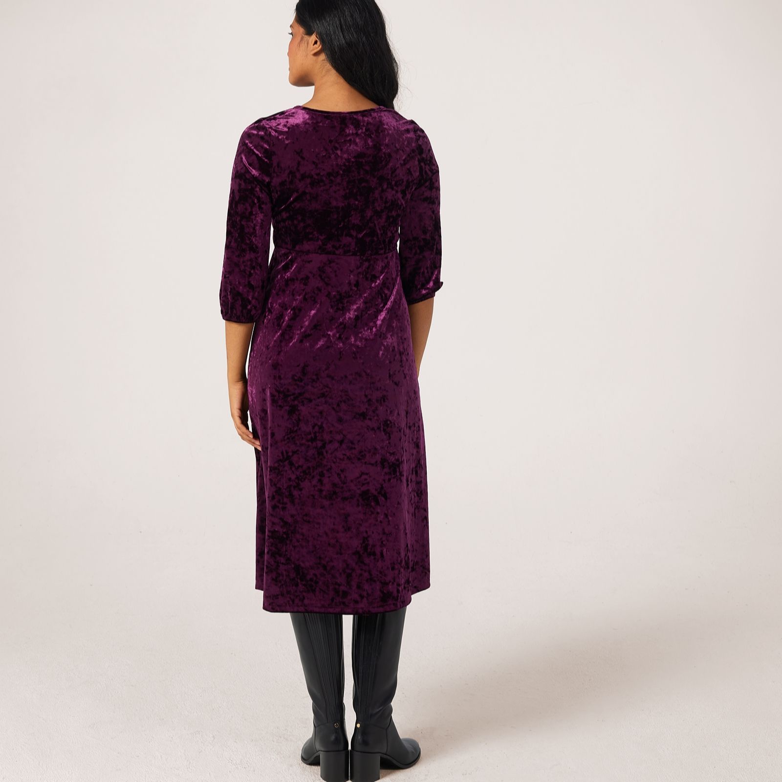 Slip into effortless sophistication with this crushed velvet midi dress from Kim & Co, where a sweet V-neckline and elegant boat neck meet blouson 3/4-length sleeves for a look that radiates modern glamour. Its defined waist and flared hem create a flattering silhouette, making this versatile piece perfect for parties, evening dinners, or a chic day at the office. Pair with your favourite heels and a statement clutch for an ensemble that transitions seamlessly from day to night.
