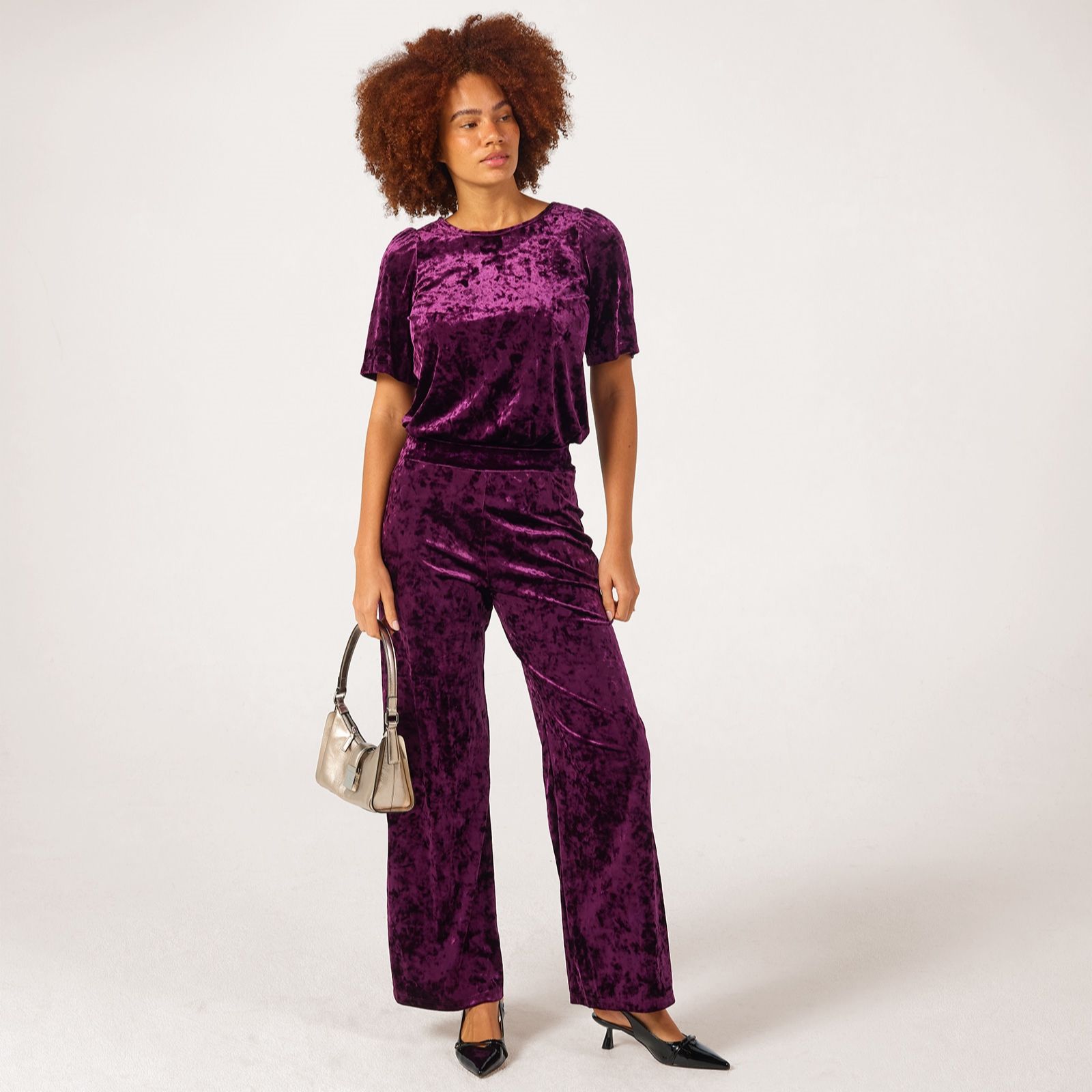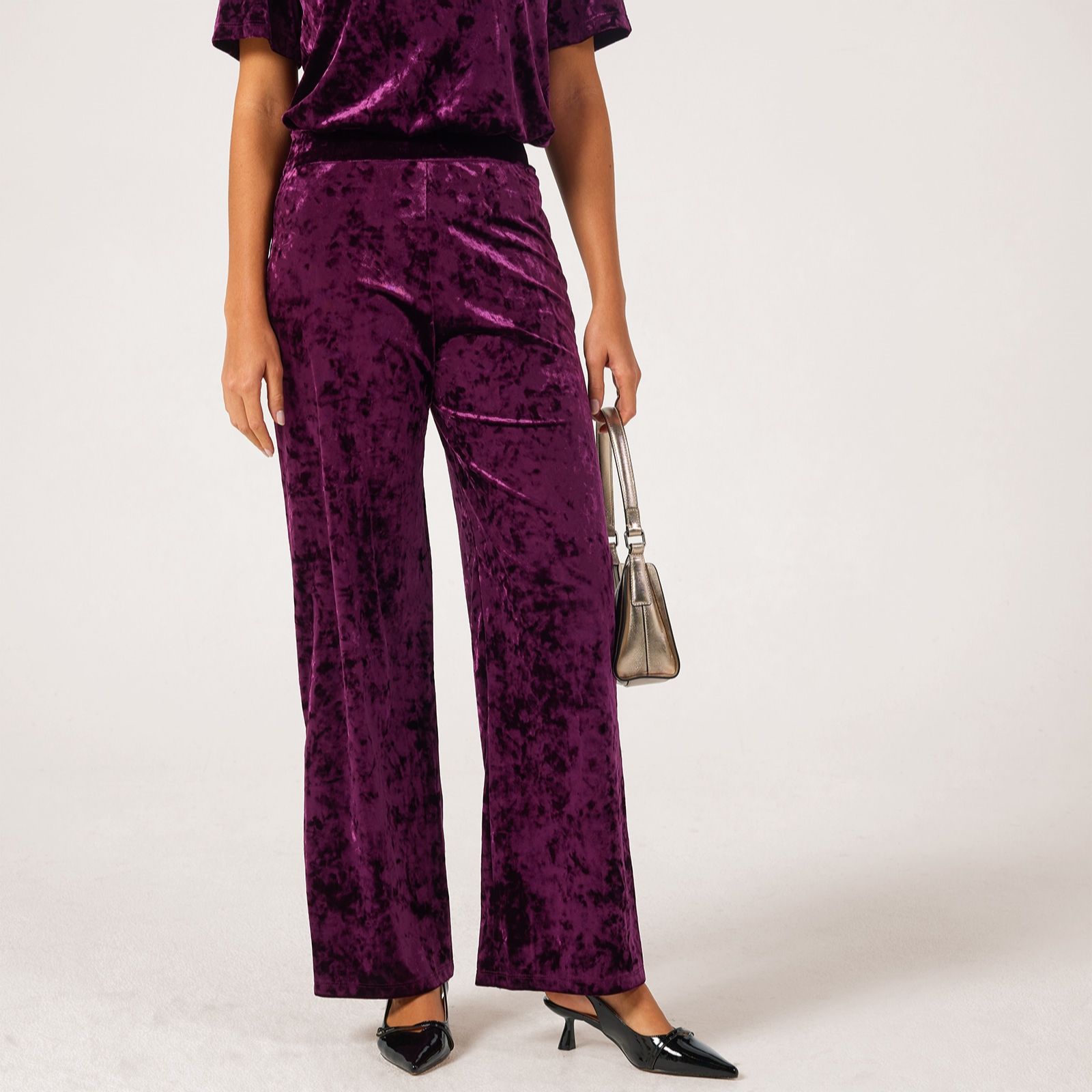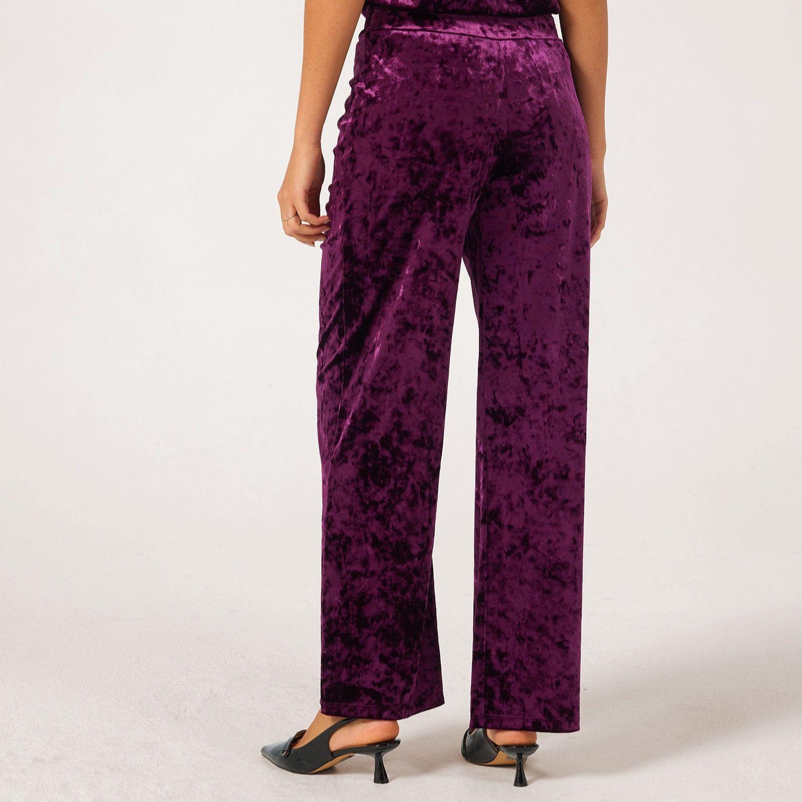 Step into effortless style with the crushed velvet Kati straight leg trousers from Kim & Co in a standard length. Designed with a luxuriously smooth, seamfree finish and a wide comfort waistband, these trousers add instant luxury to your look. Perfect for both relaxed days and chic evenings, pair them with a silky blouse and heels for an easy yet elegant look.