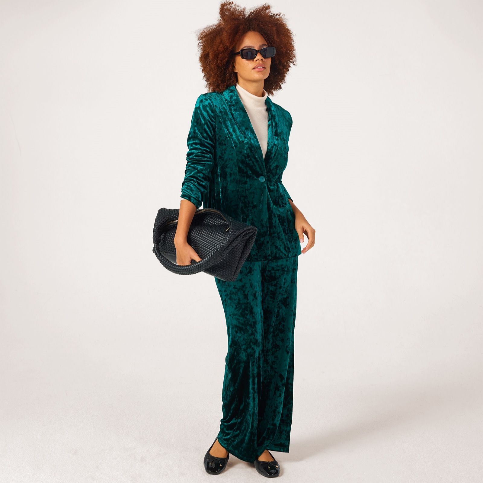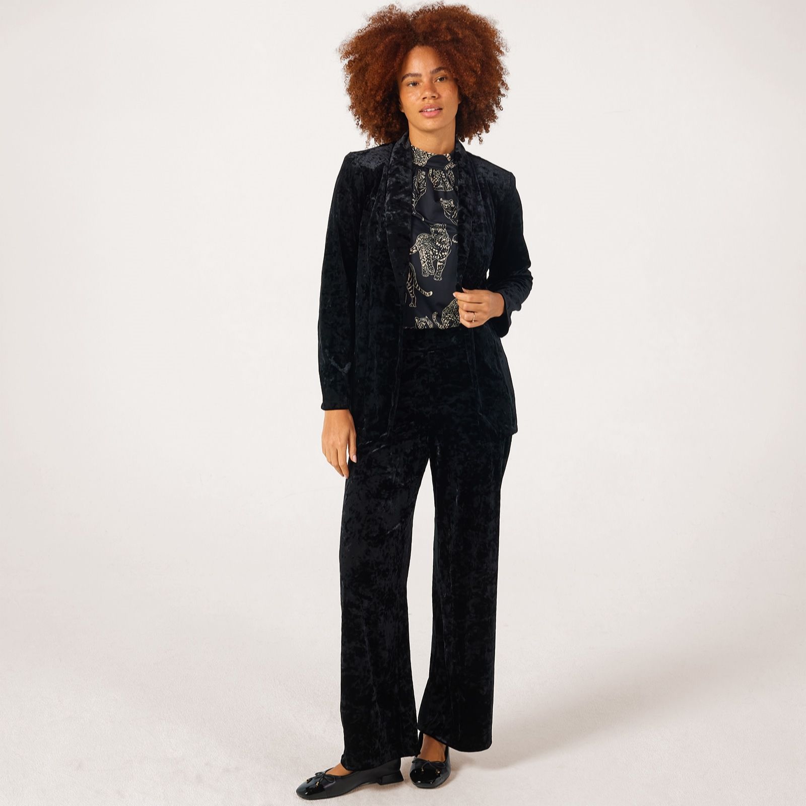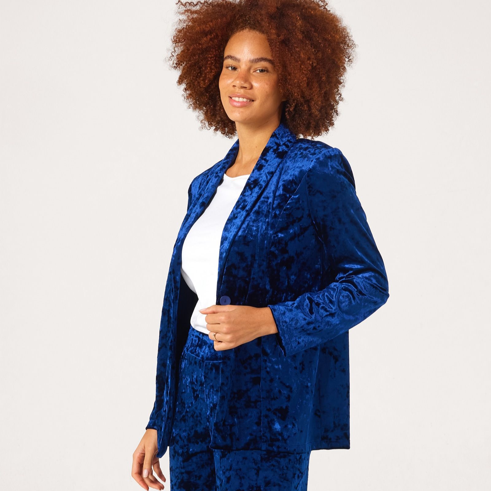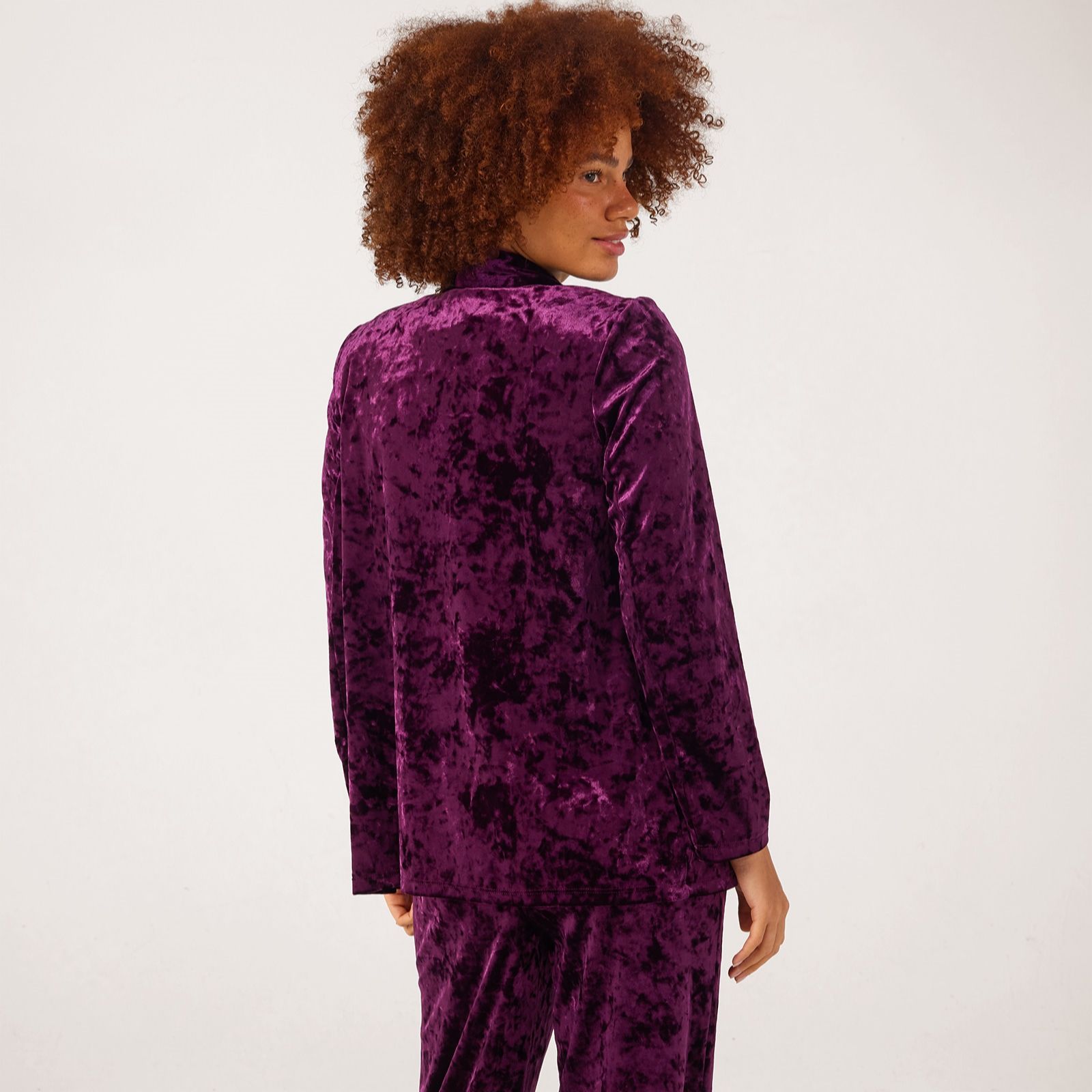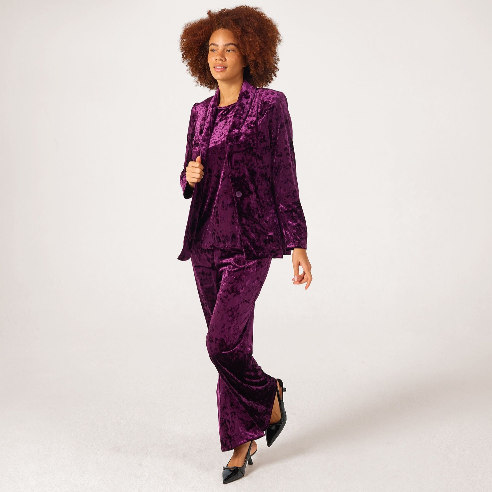 Wrap yourself in the luxurious shimmer of Kim & Co's crushed velvet shawl collar evening jacket, designed with a graceful silhouette, long sleeves, and a single button fastening for effortless elegance. Perfect for dressing up special occasion outfits or adding a touch of glamour to your everyday look, this jacket transitions seamlessly from dinner dates to parties. Style it over a sleek camisole and tailored trousers for a sophisticated ensemble.