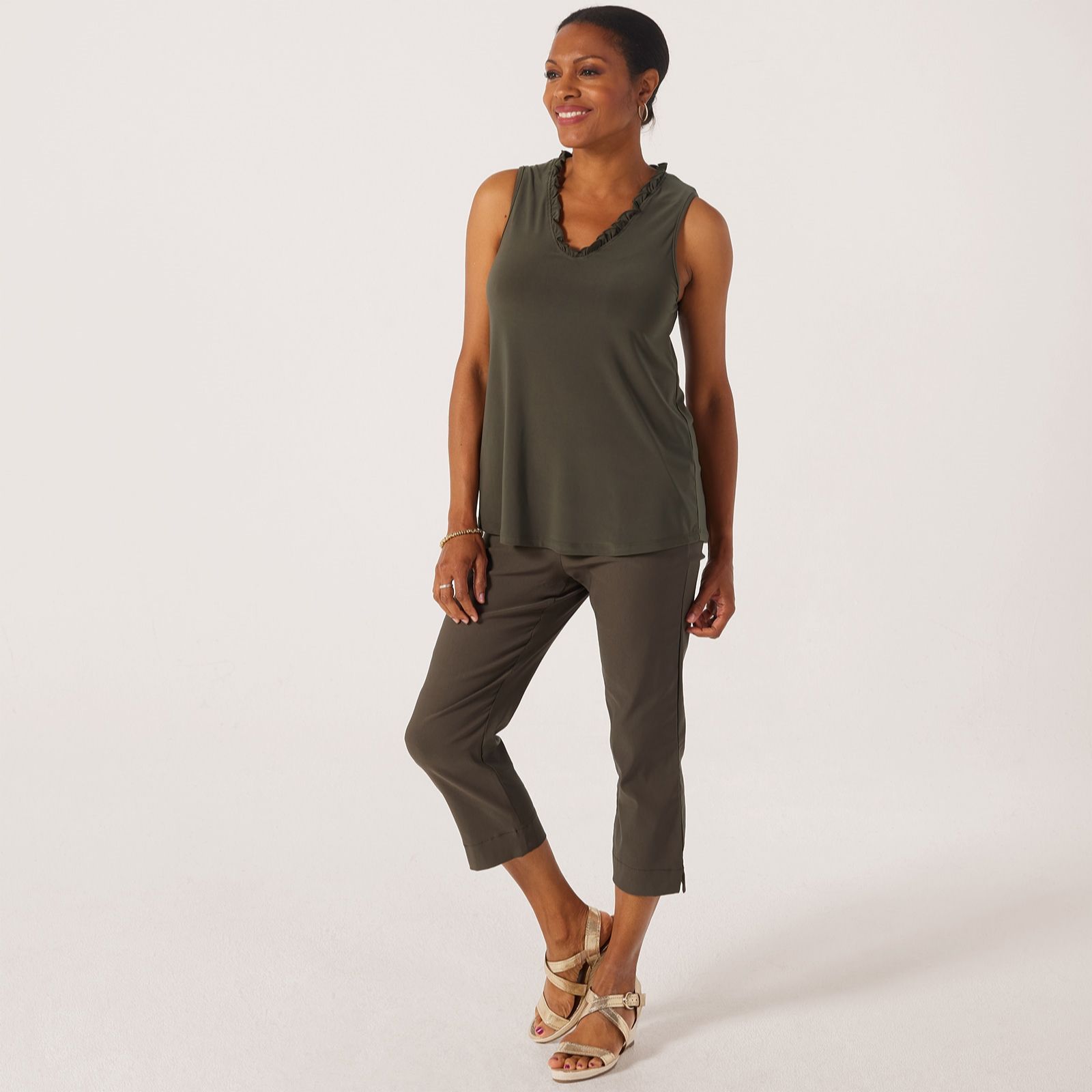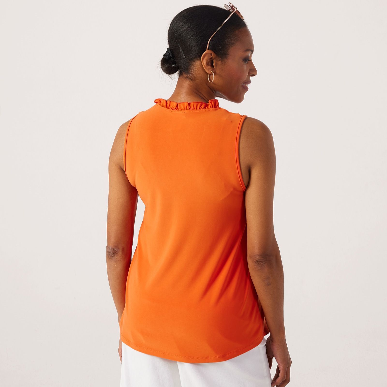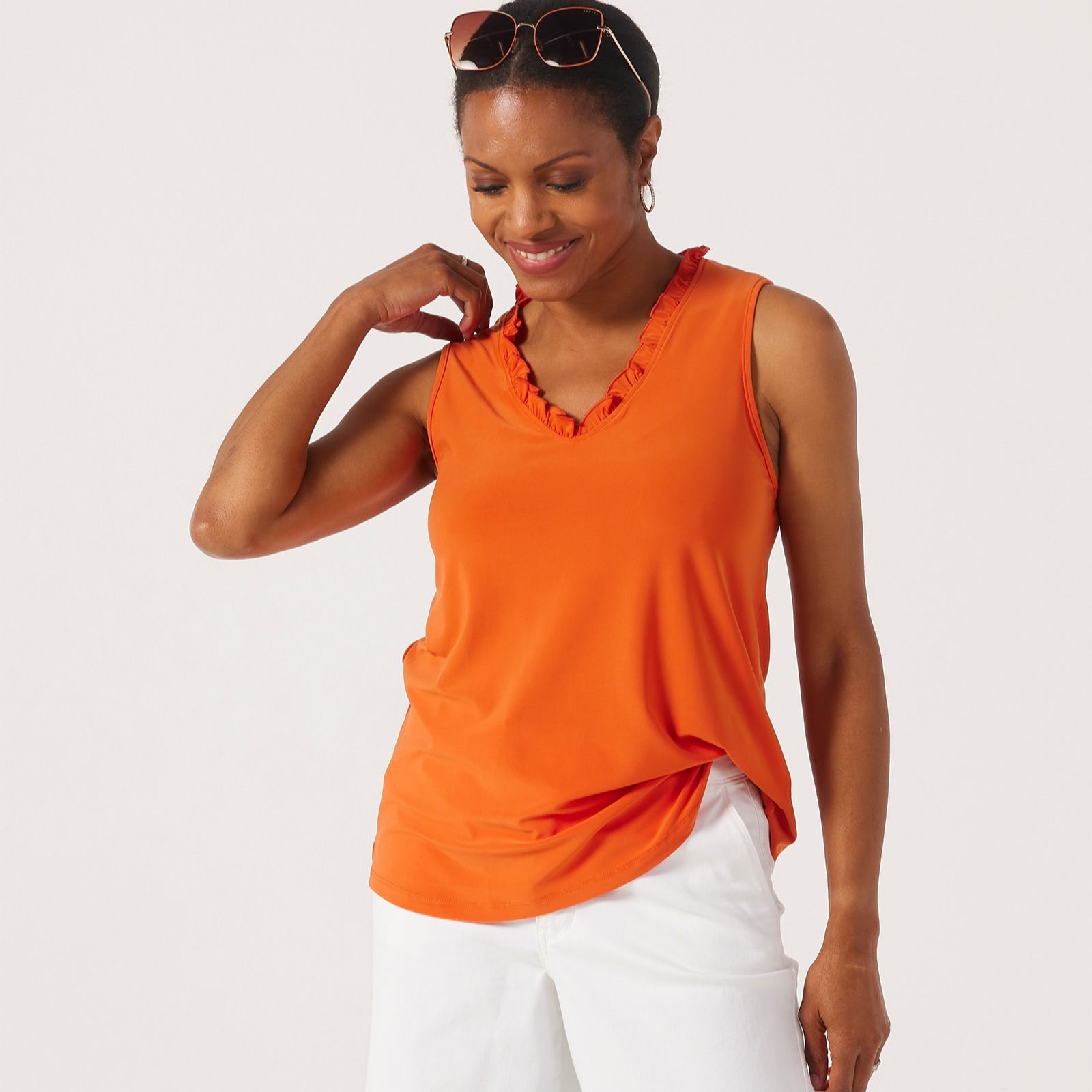Embrace effortless elegance with the Kim & Co Deluxe Brazil Jersey sleeveless top. This captivating piece is adorned with a frilled neckline, featuring a soft V-neckline with a delicate merrow edge finish that adds a touch of sophistication. Perfect for a sunny brunch or an evening gathering, its versatile design makes it a must-have in your wardrobe. Style it with tailored trousers or a flowing skirt for a chic ensemble that transitions seamlessly from day to night.