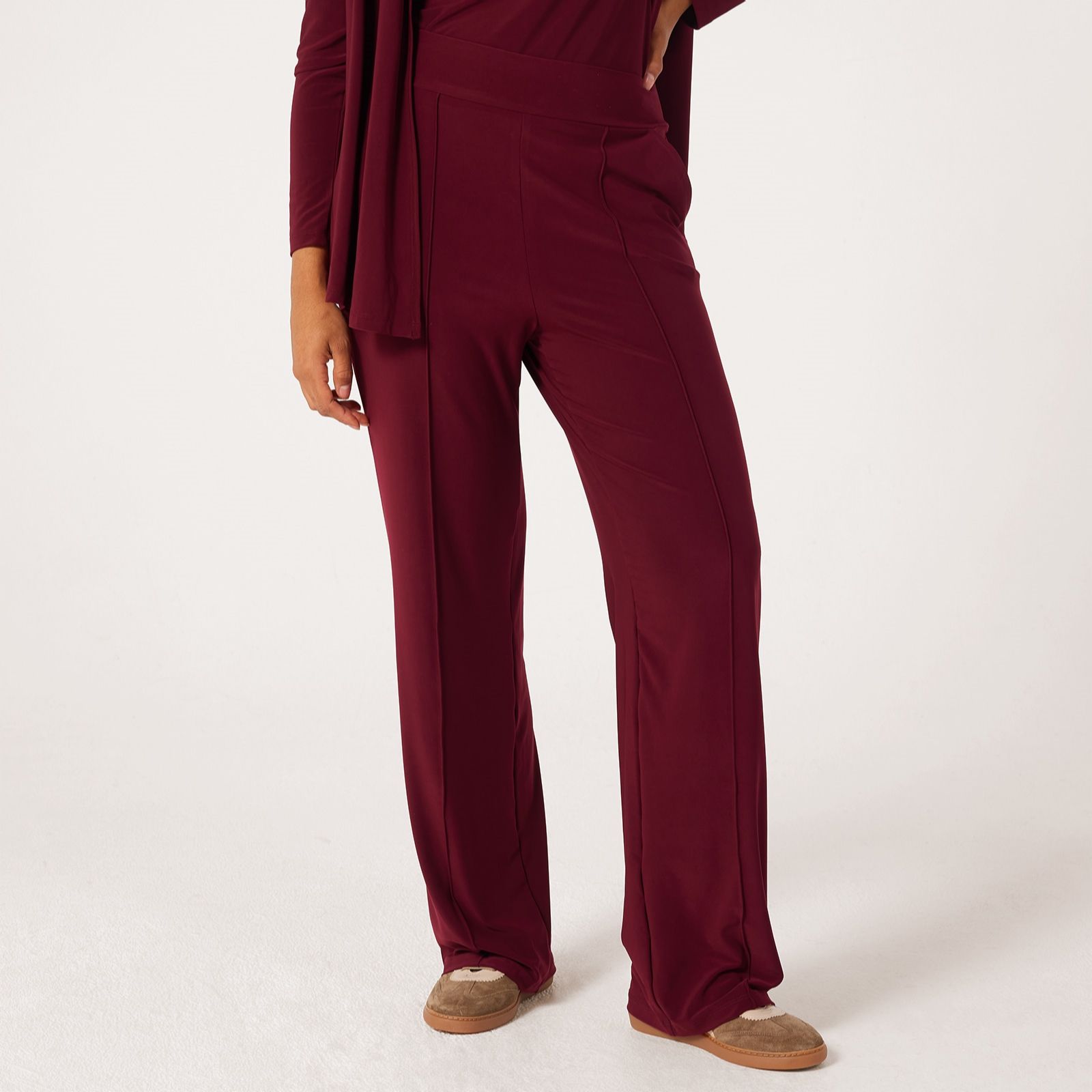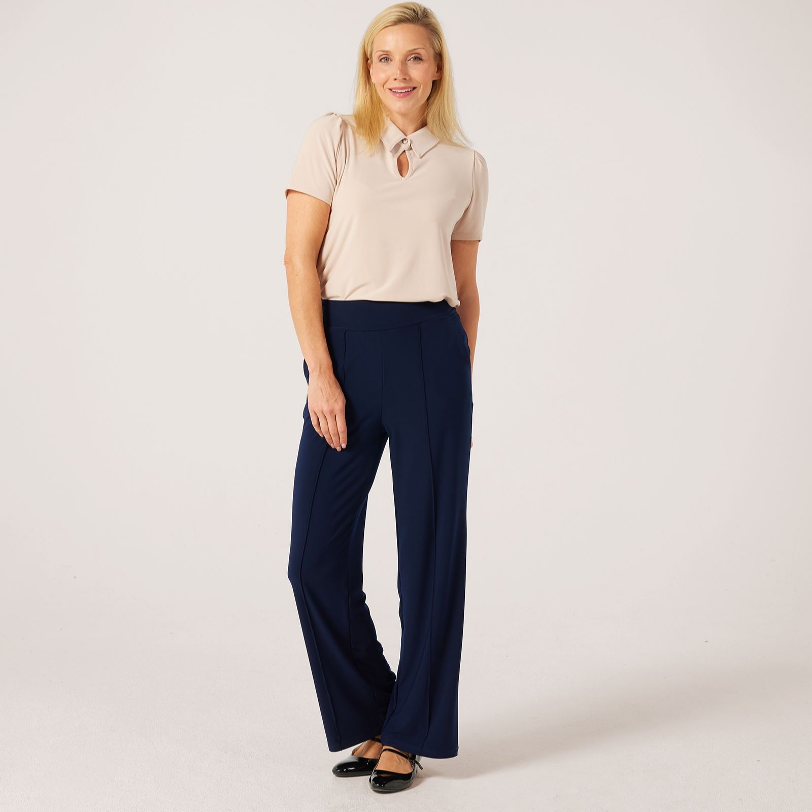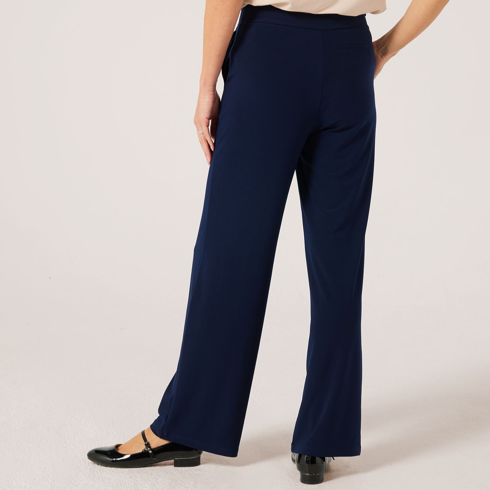 Step into effortless sophistication with the Kyla wide-leg pintuck petite trousers from Kim & Co, crafted in their signature deluxe Brazil Jersey. The full-length silhouette, comfort waistband and elegant pintuck detailing along the front legs make these trousers the perfect choice for workdays, casual outings or evening events. Pair with a fitted blouse and heels for a polished finish.