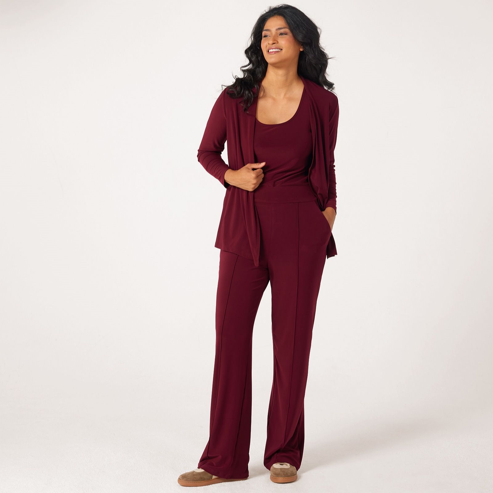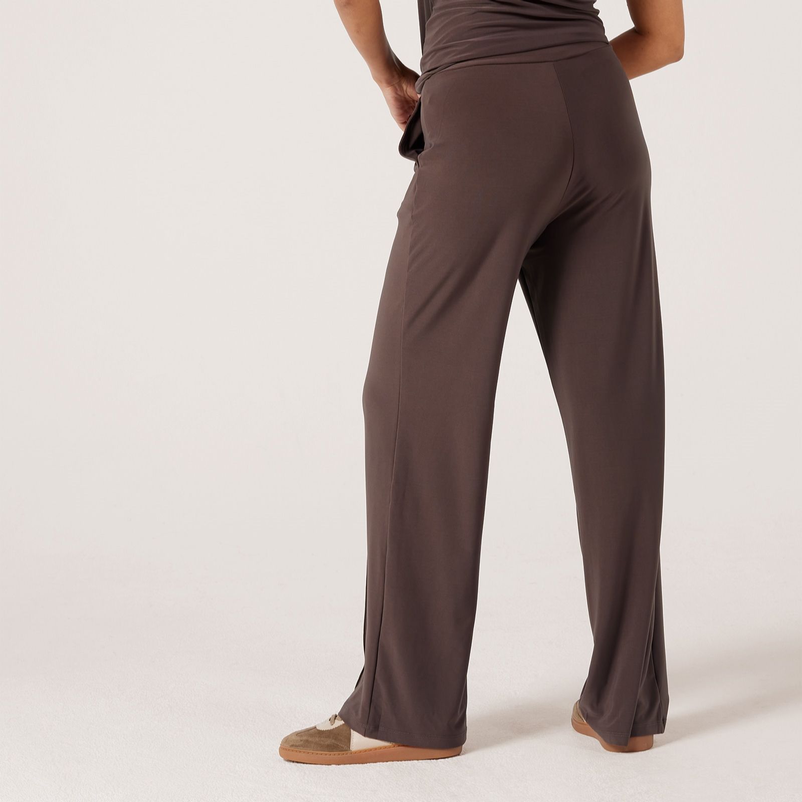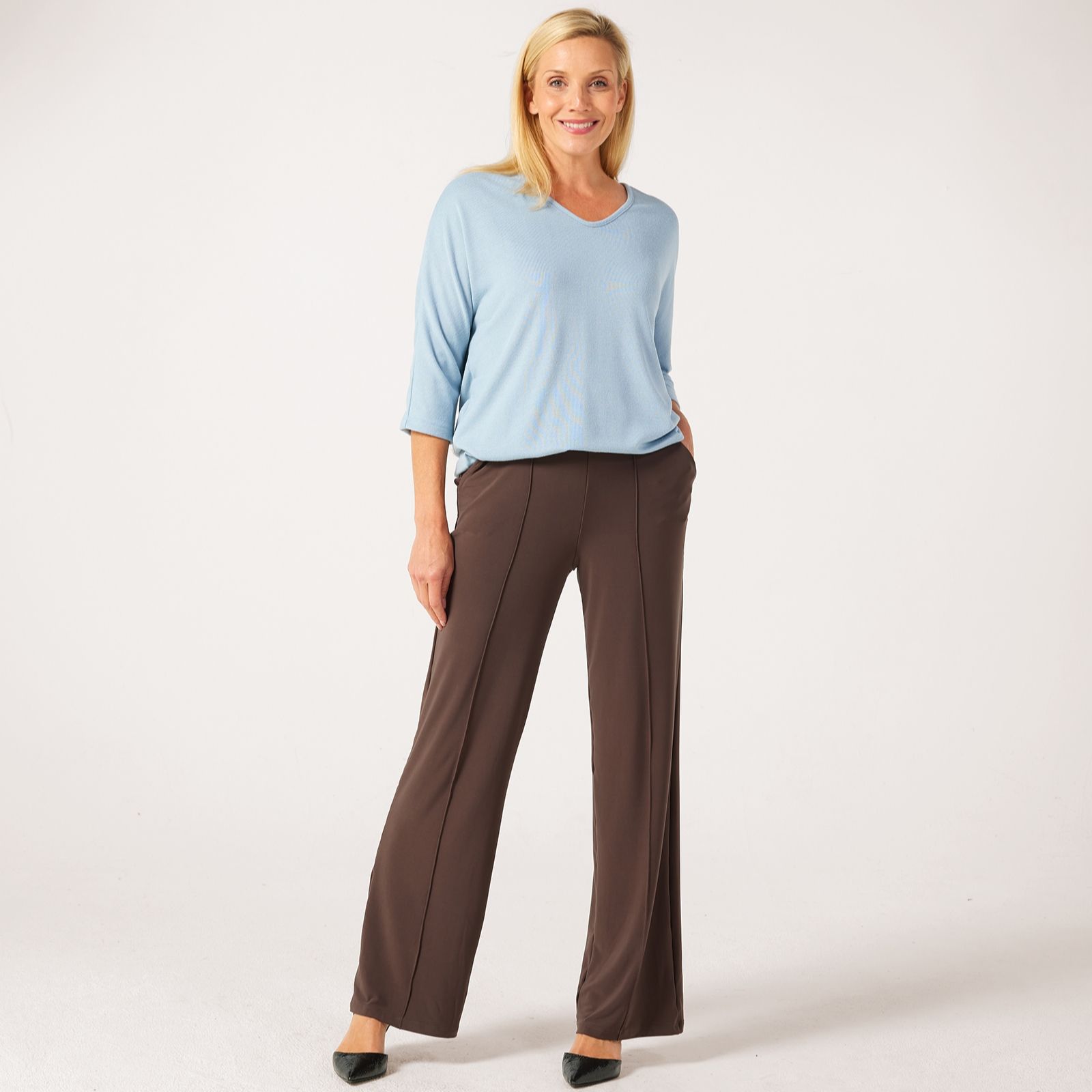 Step into effortless sophistication with the Kyla wide-leg pintuck petite trousers from Kim & Co, crafted in their signature deluxe Brazil Jersey. The full-length silhouette, comfort waistband and elegant pintuck detailing along the front legs make these trousers the perfect choice for workdays, casual outings or evening events. Pair with a fitted blouse and heels for a polished finish.