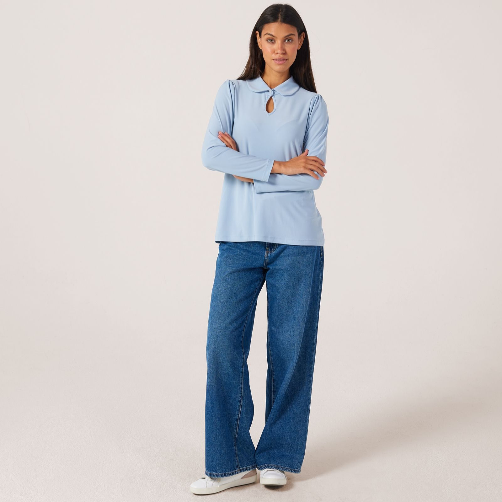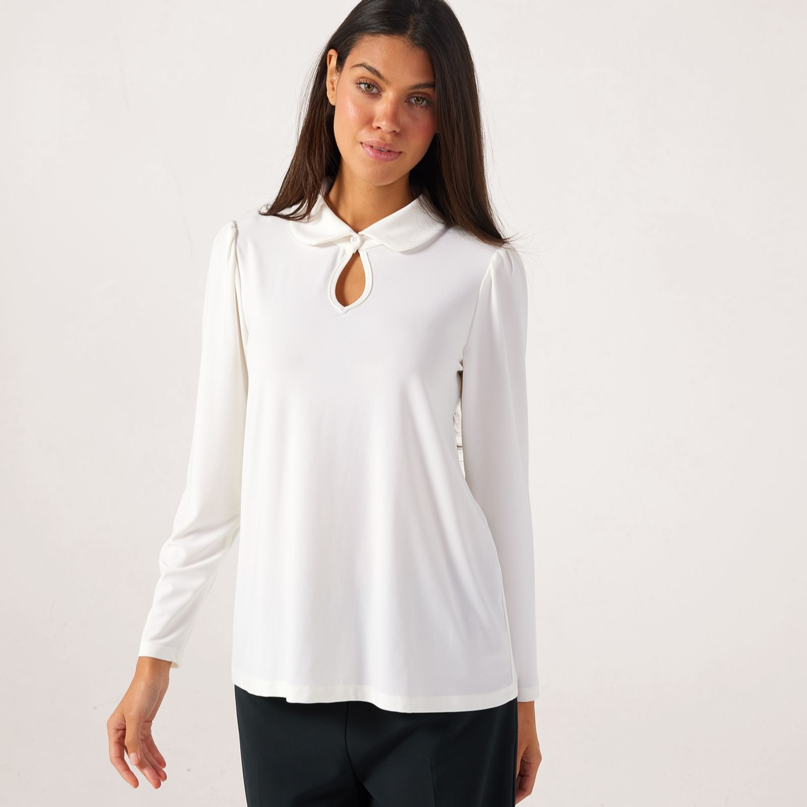 Infuse your wardrobe with elegance, courtesy of the Kim & Co Deluxe Brazil Jersey Peter Pan collar top, a charming piece that blends vintage-inspired elegance with contemporary flair. Delicate shirring at the sleeve head and a decorative pearl shank button at the keyhole neckline add a touch of sophistication, making this long sleeve top perfect for everything from brunch dates to office chic. Pair it with tailored trousers or your favourite jeans for a polished look.