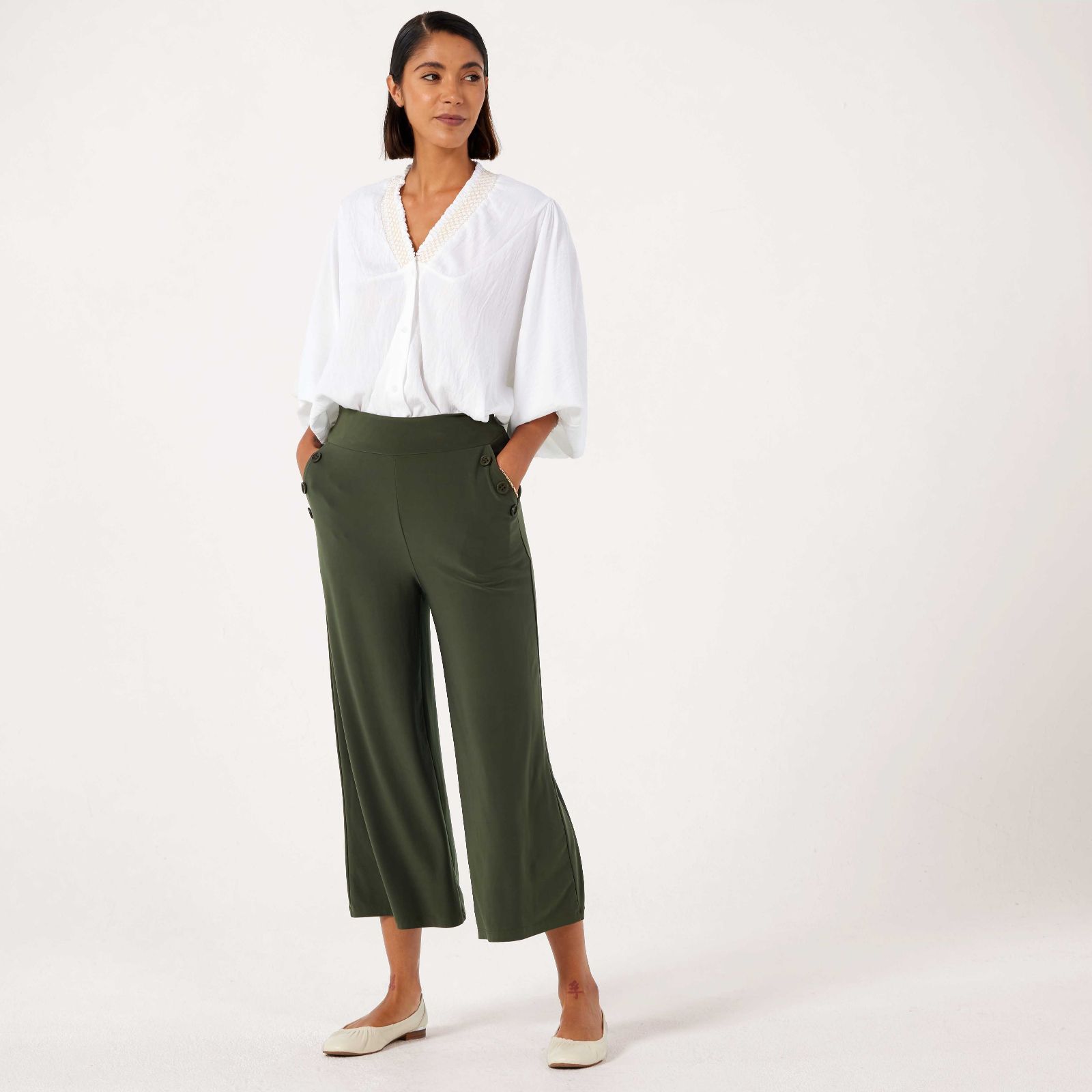 Add a touch of nautical charm to your wardrobe with the Deluxe Brazil Jersey Wide Sailor Cropped Trousers from Kim & Co in a standard fit. These stylish trousers feature a wide comfort waistband and slanted pockets at the front side seam, adorned with decorative buttons along the pocket opening. Ideal for casual outings or dressed-up events, these versatile trousers can effortlessly transition from day to night. Pair them with a tucked-in blouse and sandals for a chic, relaxed look.