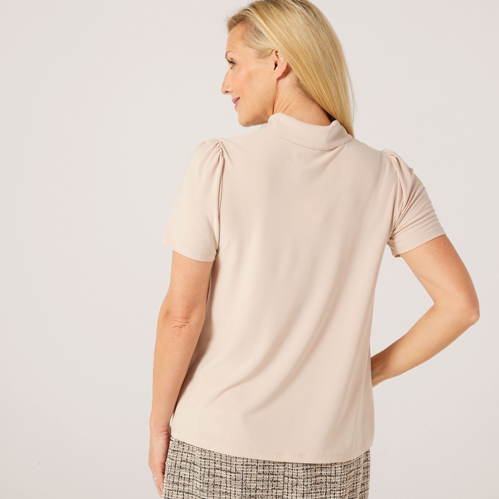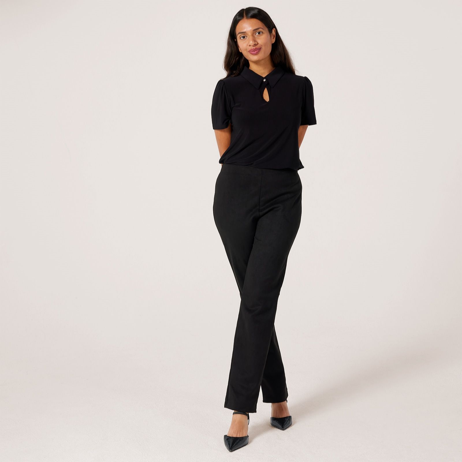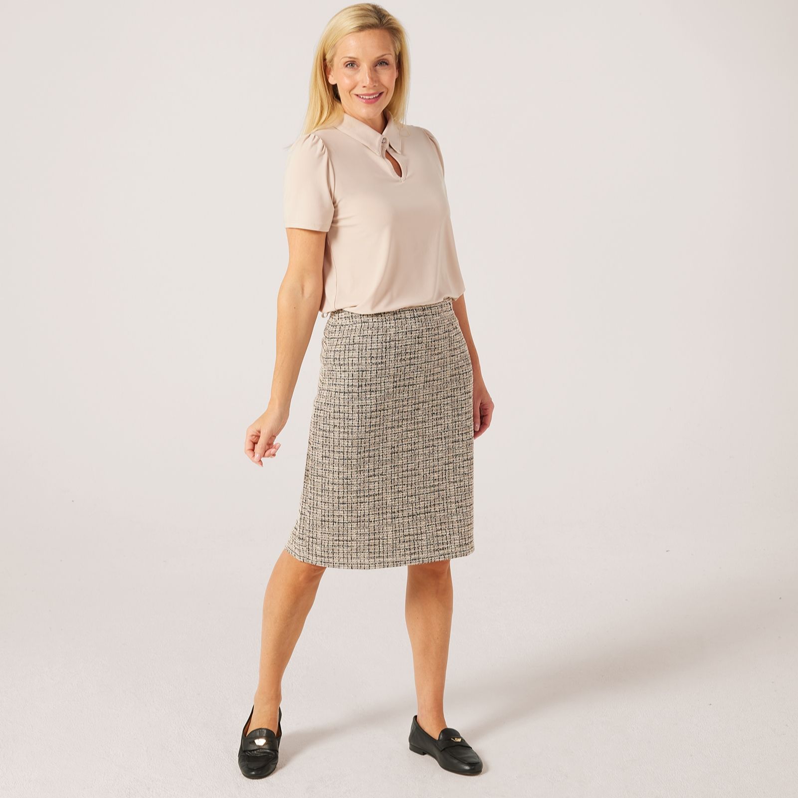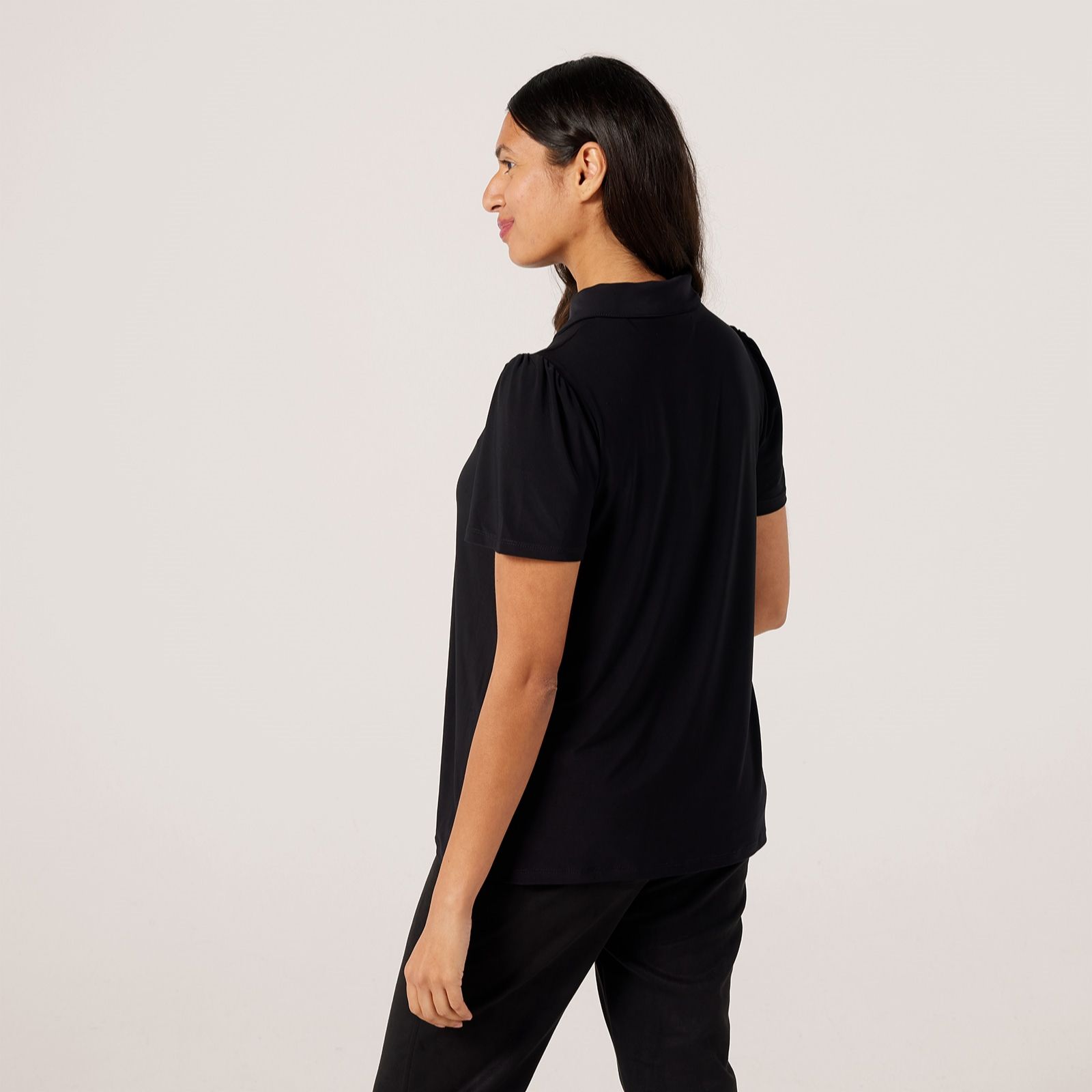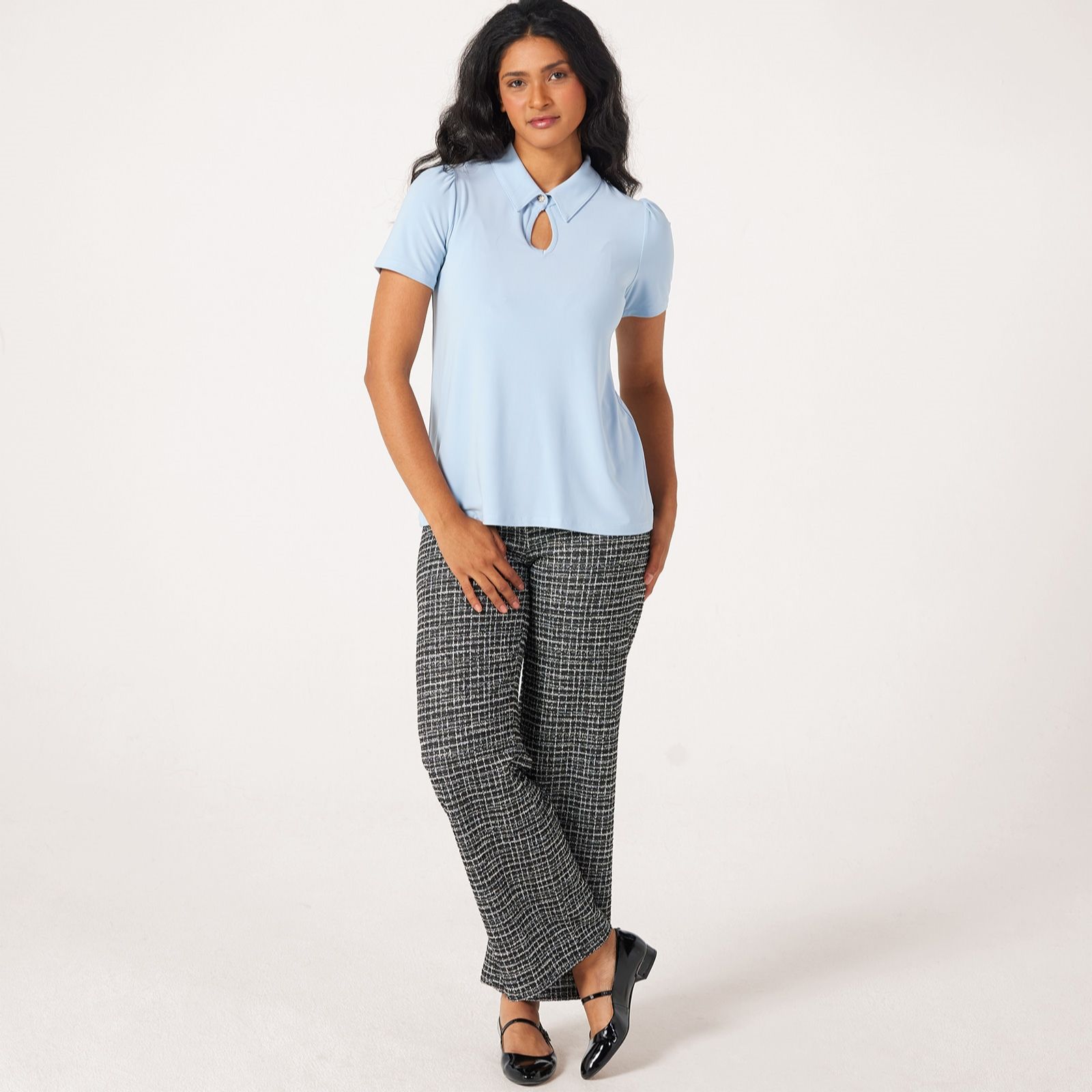 Indulge in effortless elegance with this short sleeve collar top from Kim & Co, crafted in signature Deluxe Brazil jersey. This piece features a keyhole neckline with a decorative button and gentle shirring at the sleeve head, bringing subtle sophistication to your everyday looks. Ideal for both workdays and relaxed weekends, this top adapts beautifully to any occasion. For a polished finish, team it with a sleek skirt or tailored trousers.