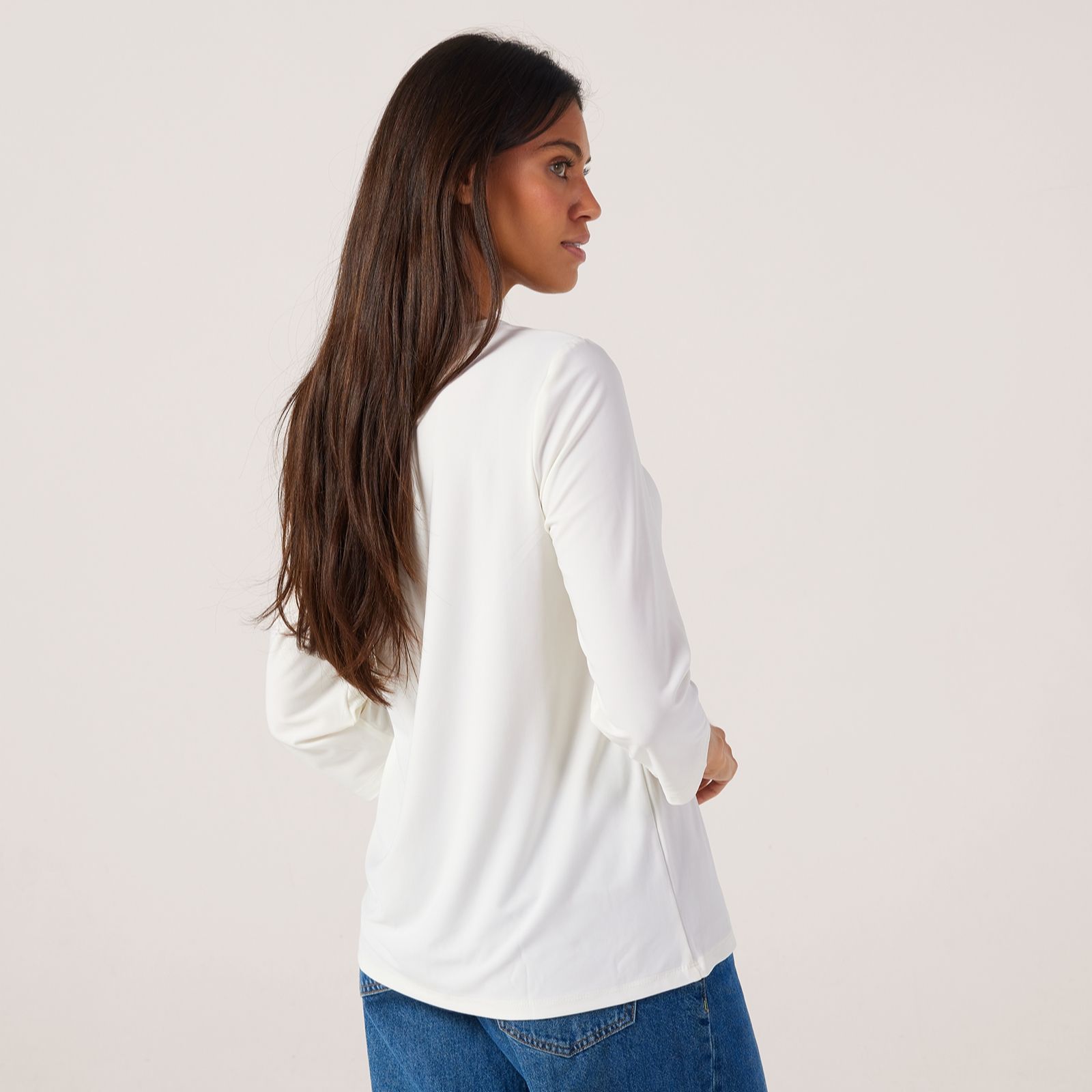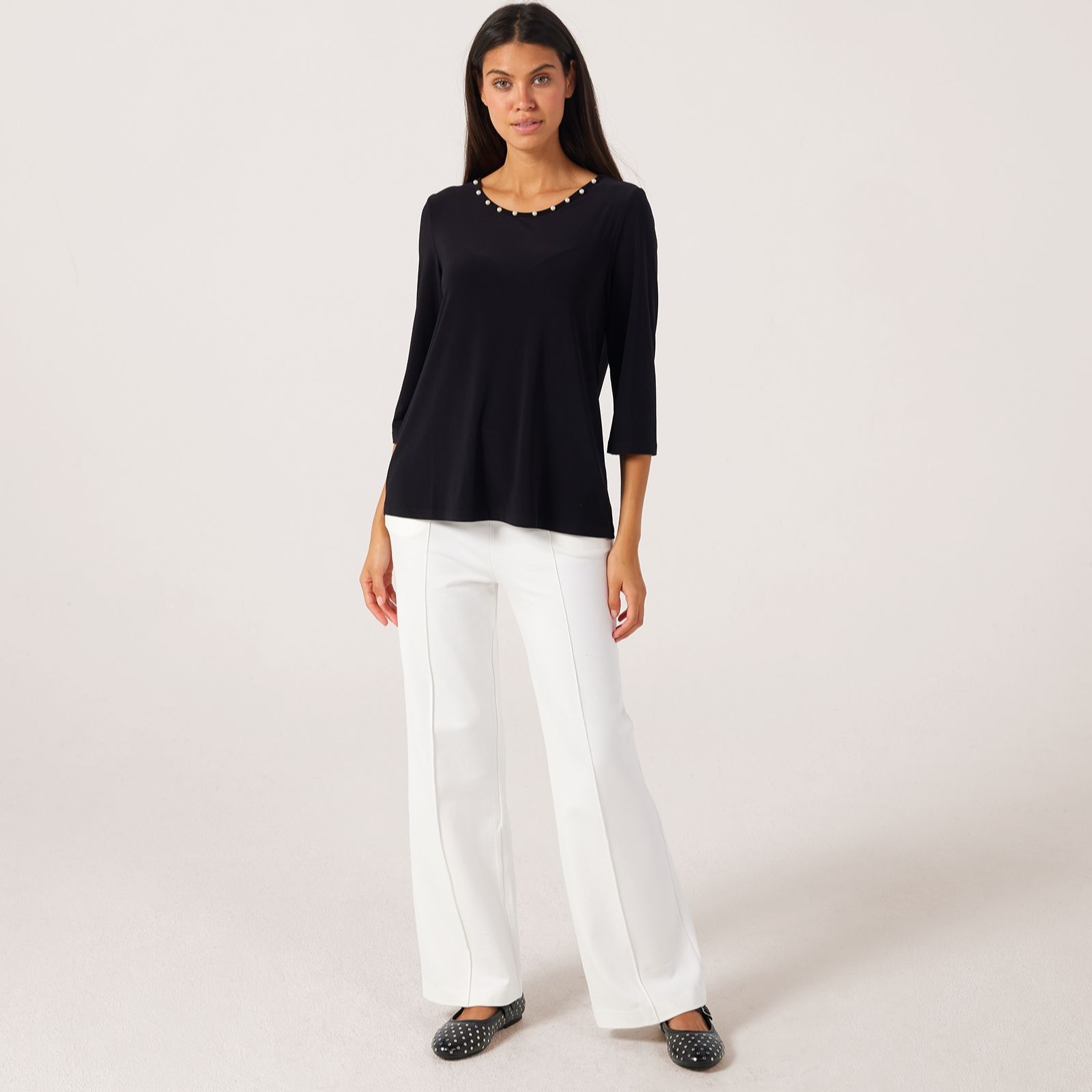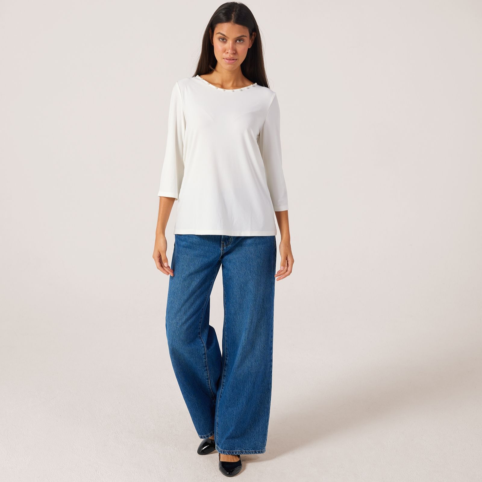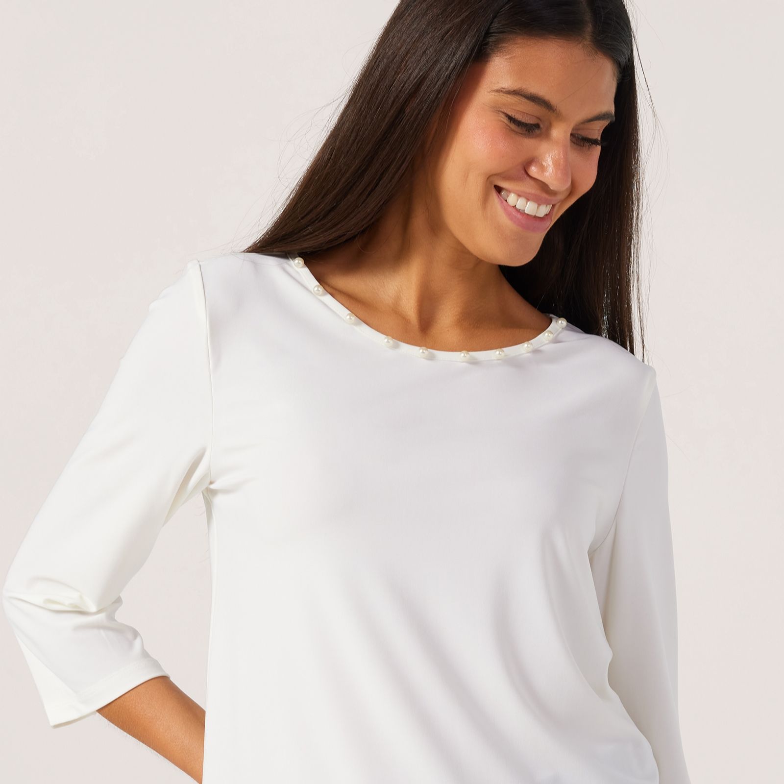 Embrace elegance in the Kim & Co Deluxe Brazil Jersey pearl top, where three-quarter length sleeves and a round neckline adorned with lustrous pearl beads create a look that's both sophisticated and effortless to wear. Perfect for everything from casual lunches to evening gatherings, this versatile piece will elevate your everyday style. Try pairing it with tailored trousers or a flowing skirt for a polished, feminine ensemble.