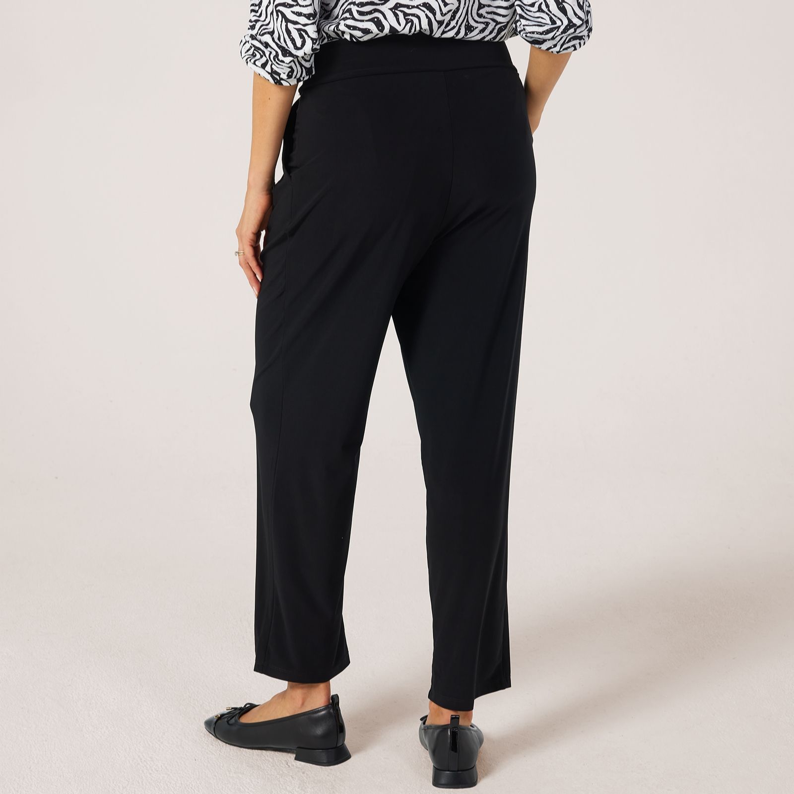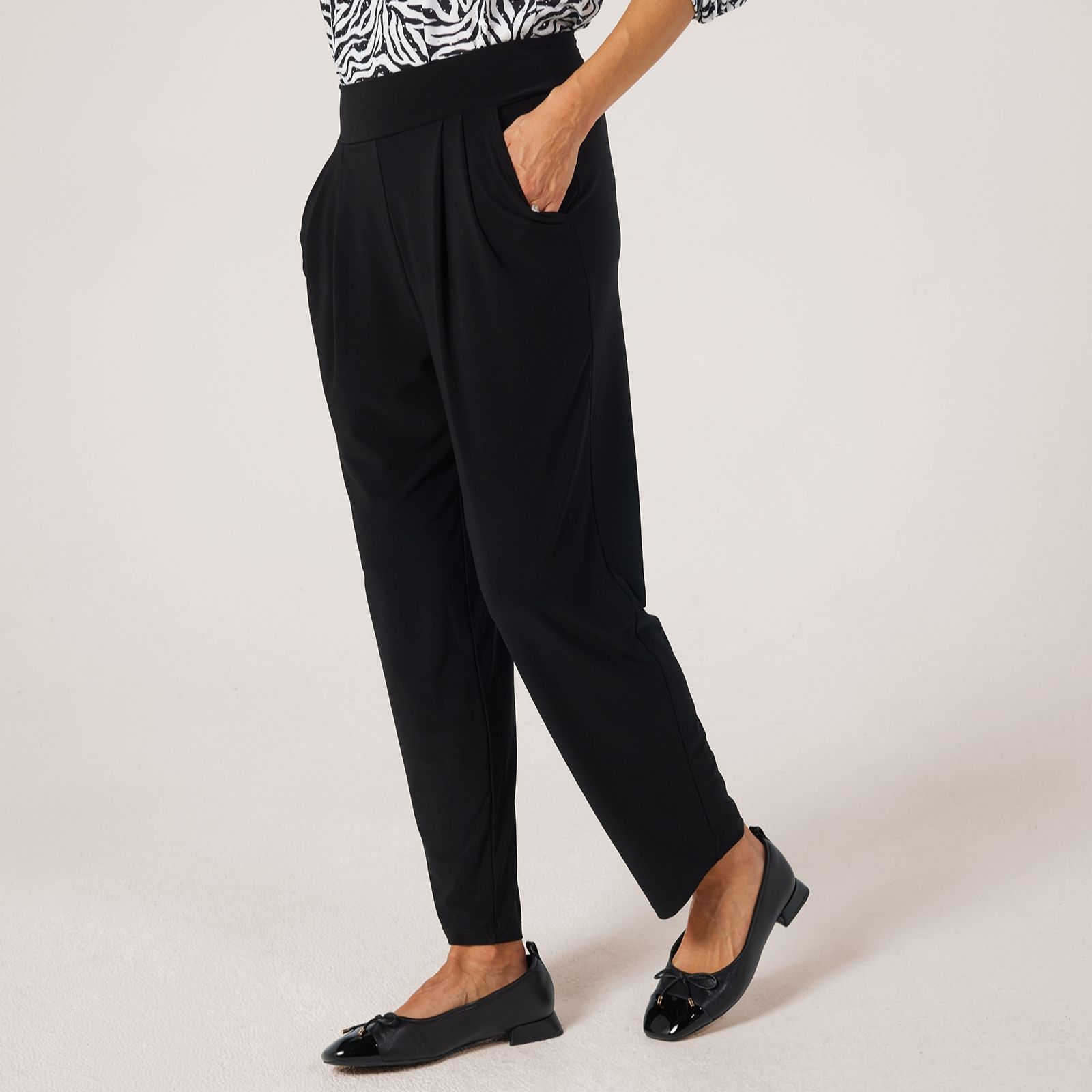 Step into effortless style with the Deluxe Brazil jersey wellness ankle-length pleated trousers petite from Kim & Co. Designed with a wide comfort waistband, front pleats and slanted side pockets, they bring a polished yet relaxed vibe to your everyday look. Perfect for workdays, casual outings or travel, they pair beautifully with a tucked-in blouse and loafers for a chic finish.