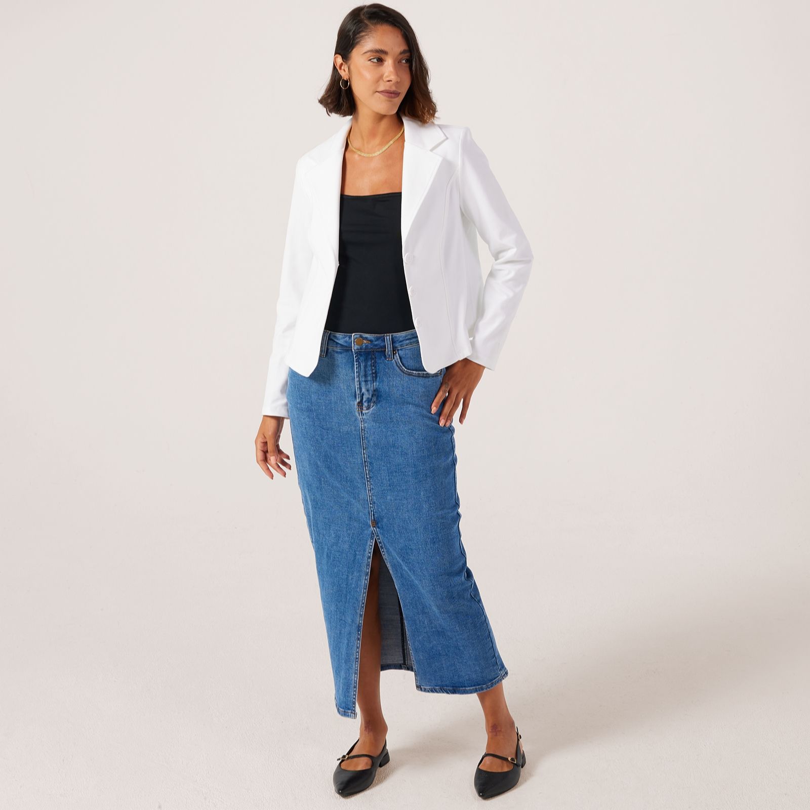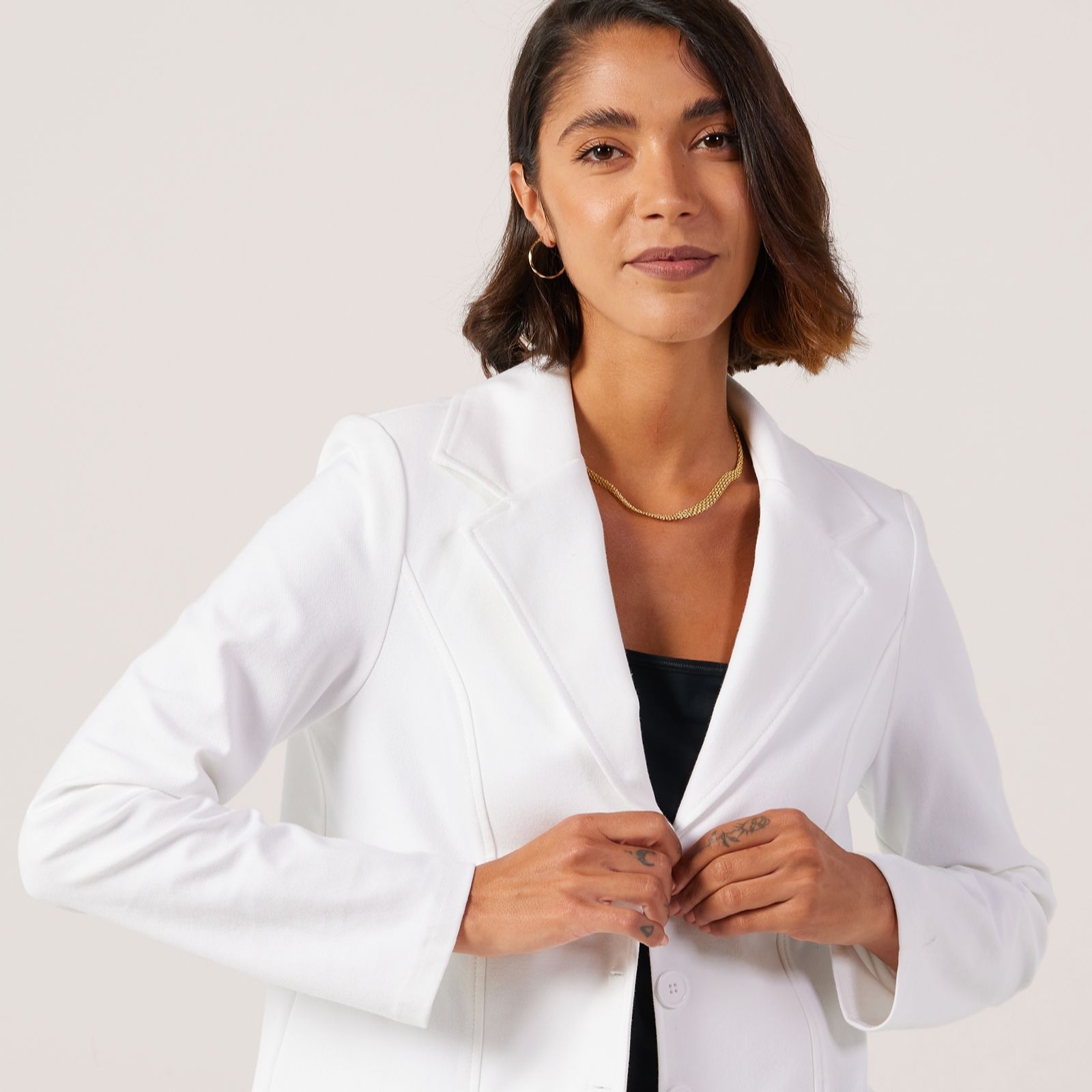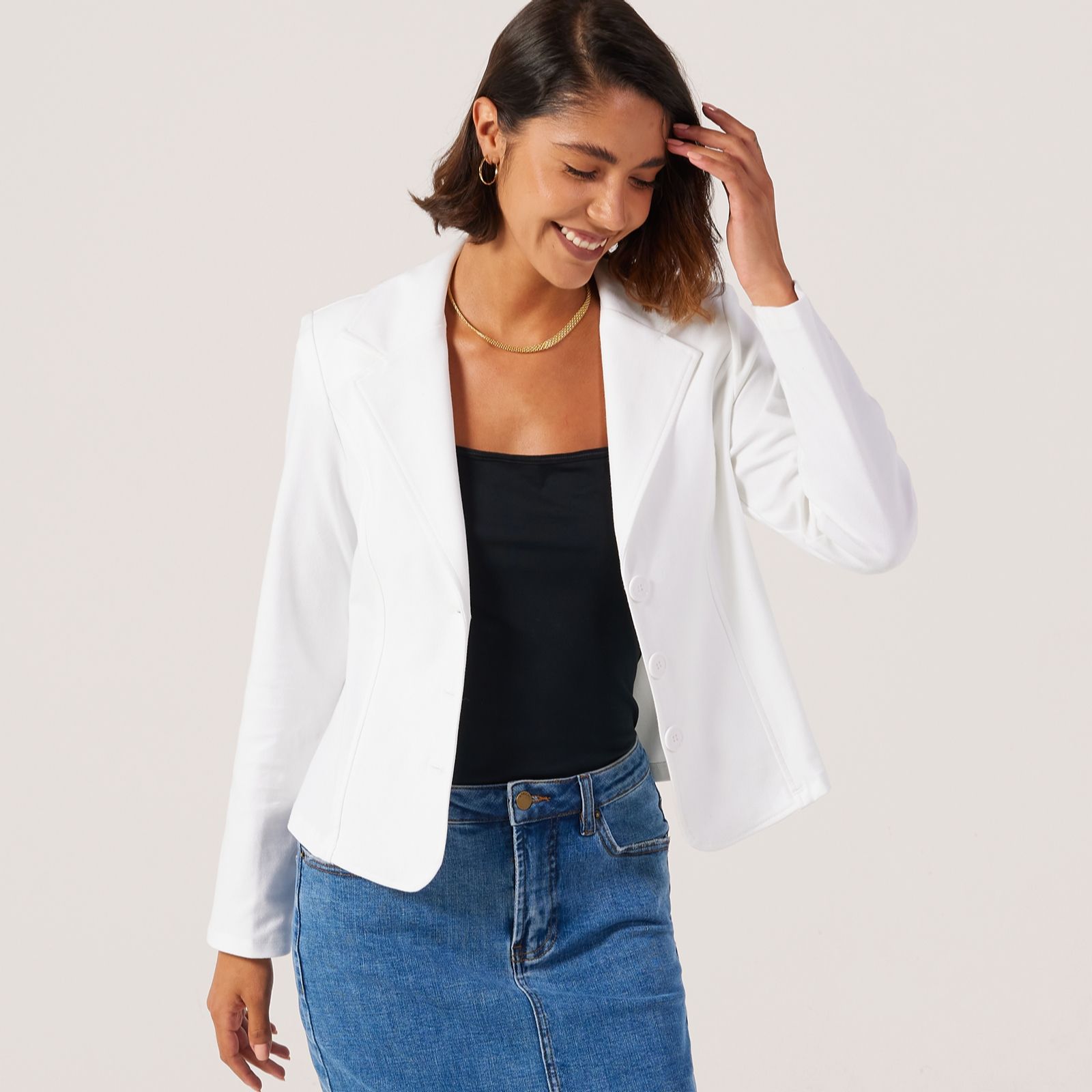 Embrace effortless style with the Kim & Co Deluxe Denim Knit 3/4 Sleeve Short Jacket. This chic jacket features a V-neckline with a tailored collar and a three-button closure at the front, making it a versatile addition to any wardrobe. Its short length and shoulder pads add a touch of sophistication, perfect for both casual outings and more formal occasions. Pair it with your favourite jeans and a crisp shirt for a polished look, or layer it over a dress for an elegant finish.