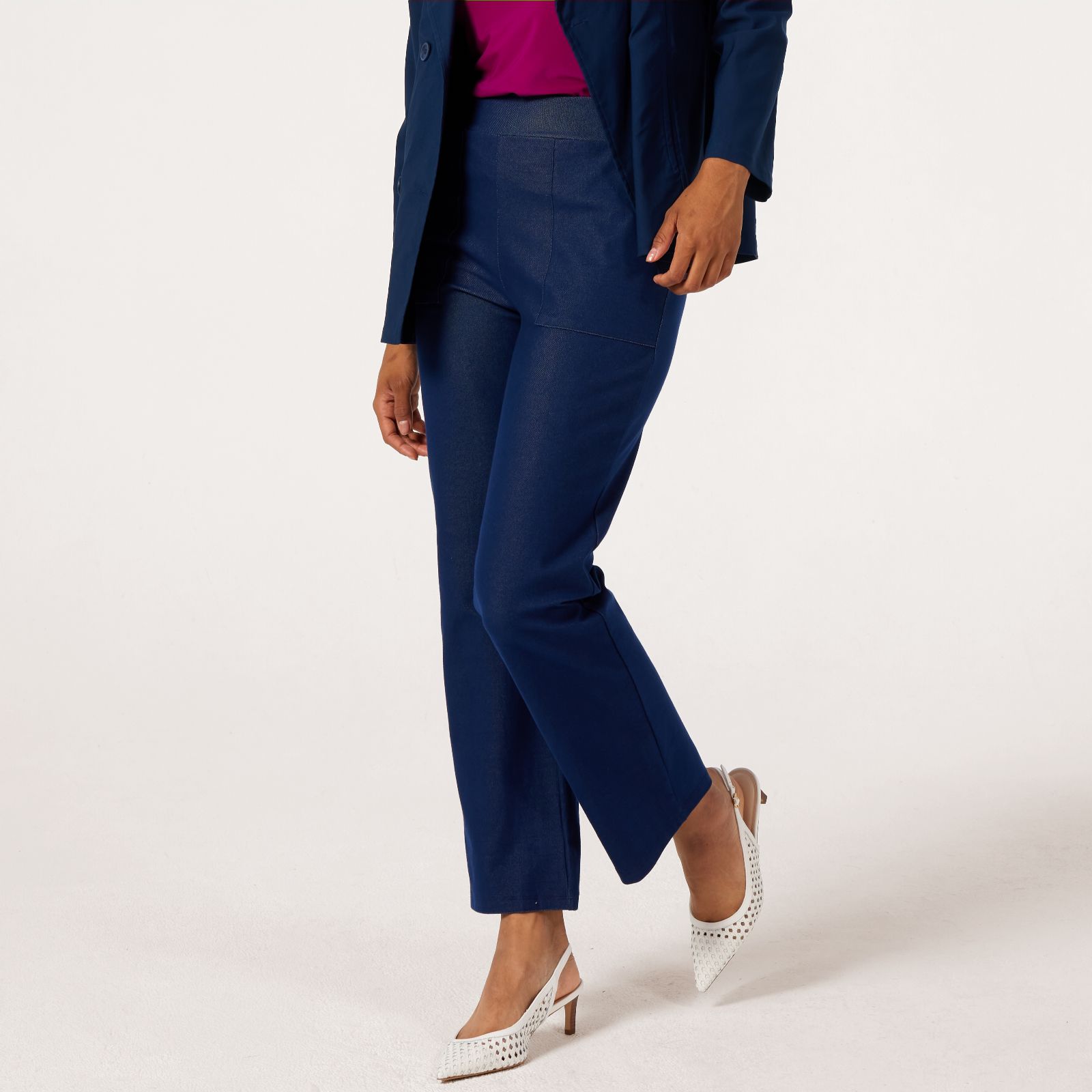 Step into style and comfort with these straight leg trousers from Kim & Co, designed in deluxe denim knit with eye-catching contrast stitching and a wide, comfort waistband. Whether you're running errands or heading out for a relaxed lunch, these trousers bring effortless polish to your everyday looks. Pair them with a soft knit or your favourite T-shirt for an easy, put-together outfit.