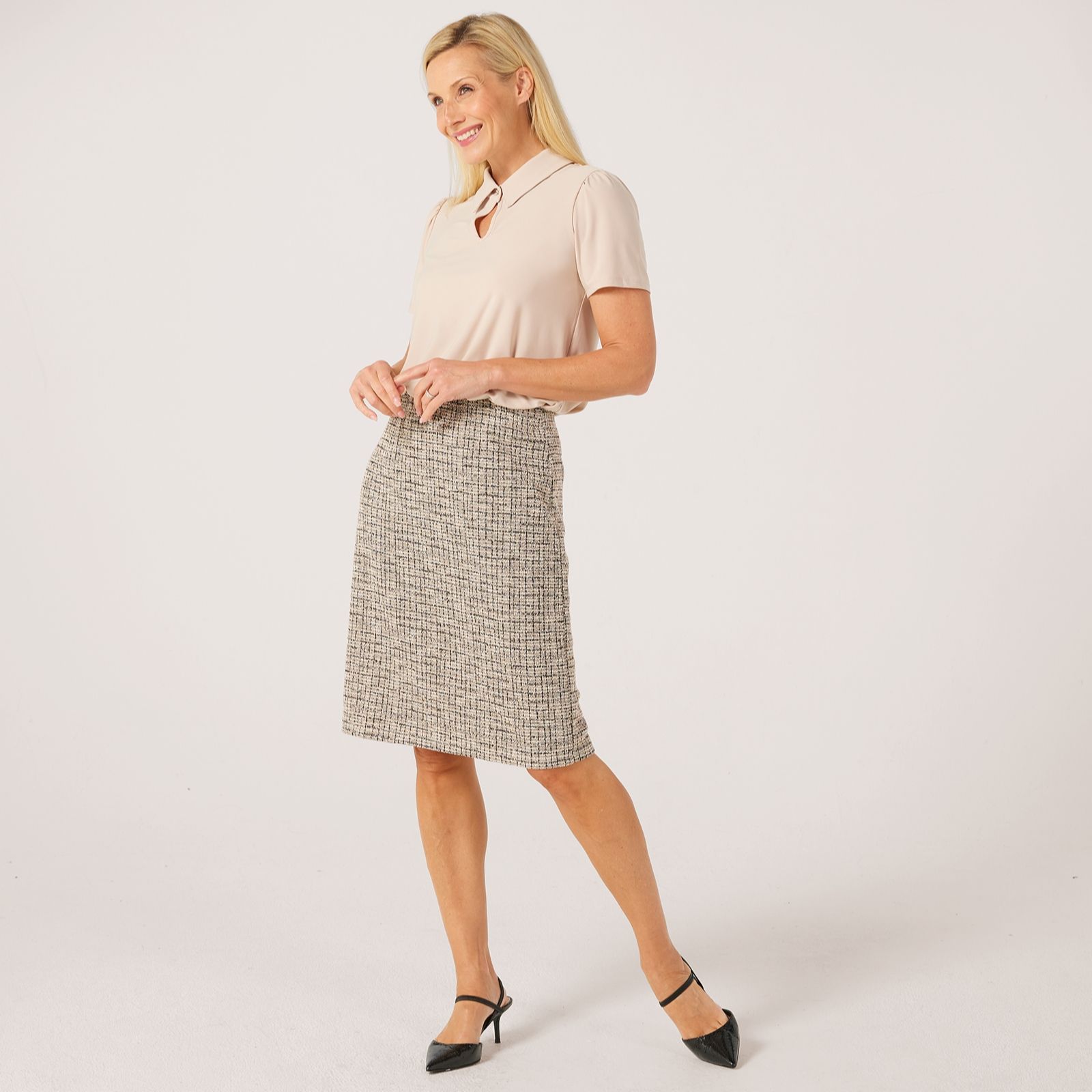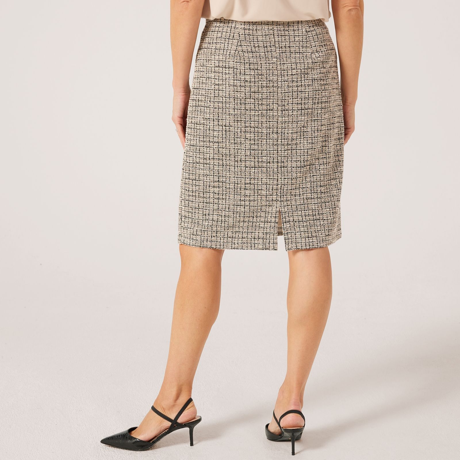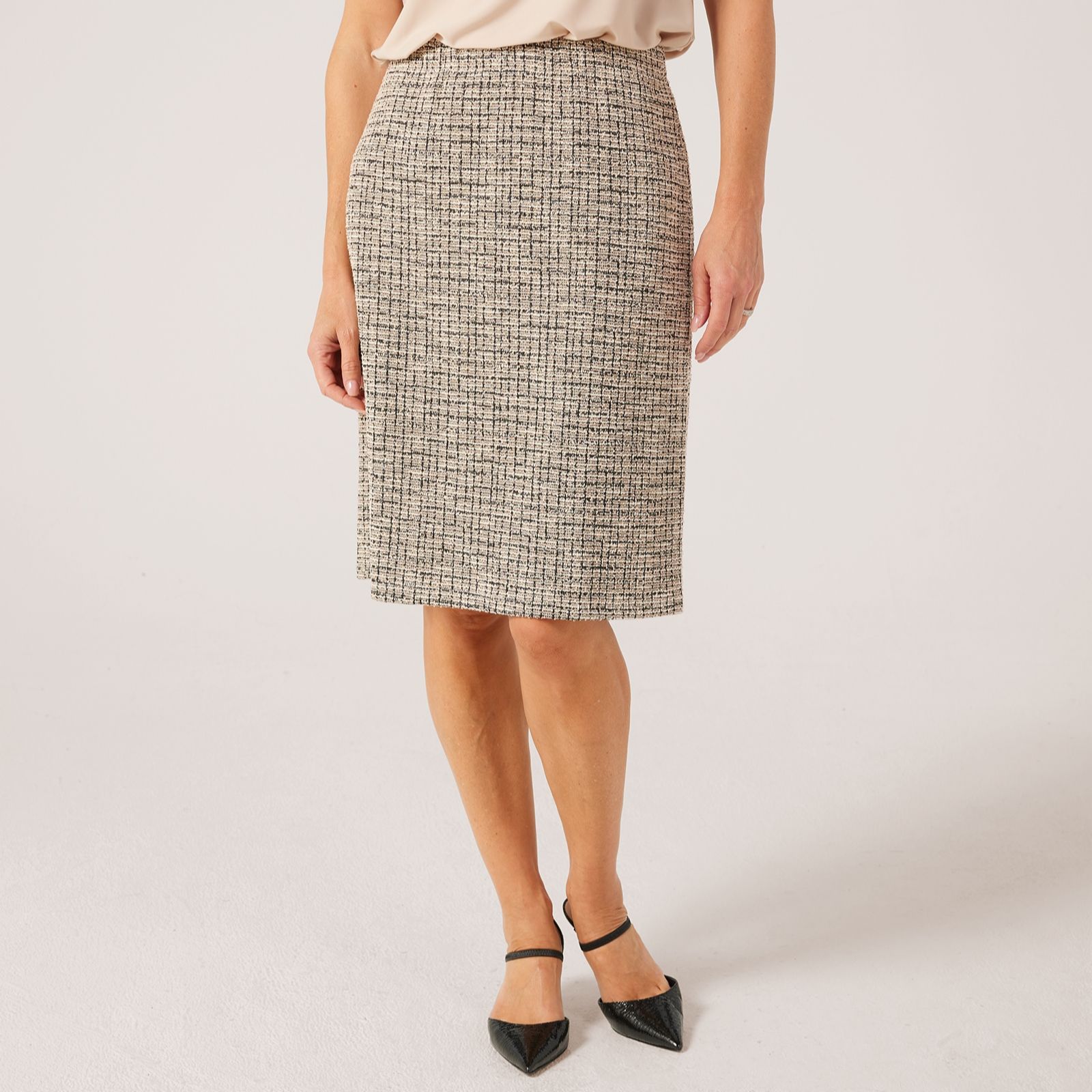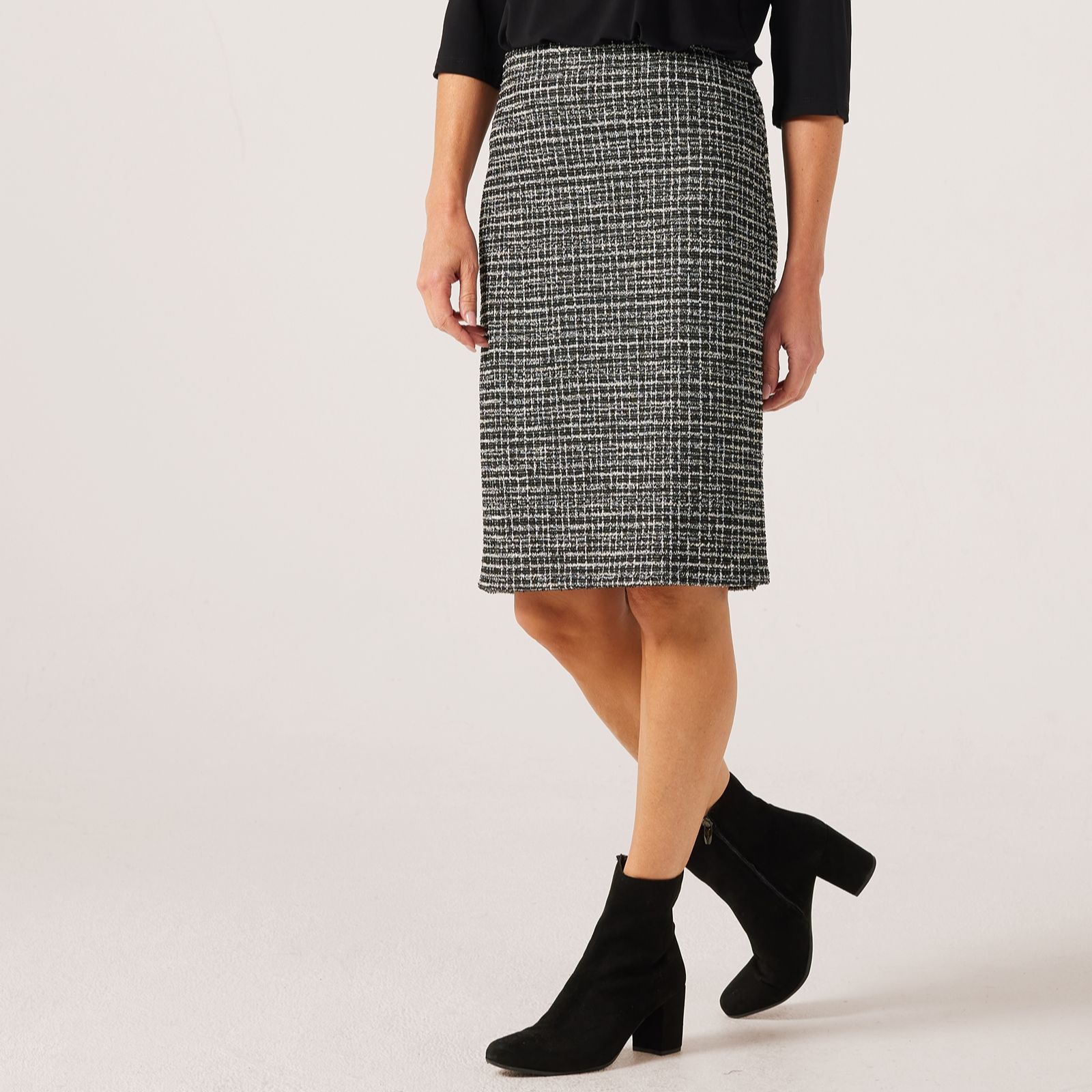 Channel timeless sophistication with the mini plaid boucle knit lined pencil skirt from Kim & Co, designed with a thoughtful back dart detail, a comfortable elasticated waist and a subtle slit at the back hem for ease of movement. Perfect for both office days and evenings out, its tailored silhouette offers endless styling potential. Pair it with a crisp blouse and heels for work or a chunky roll-neck jumper and ankle boots for a chic weekend look.