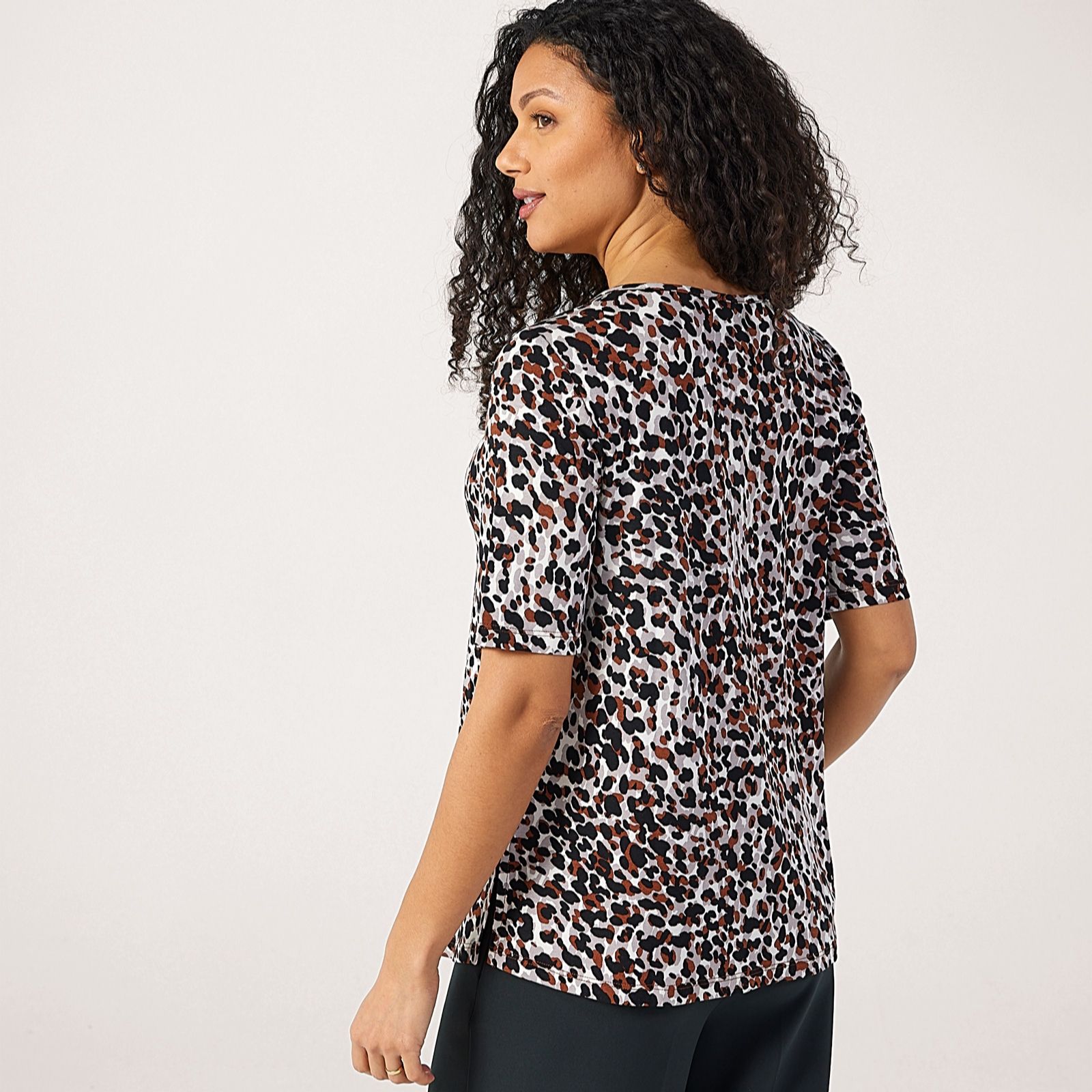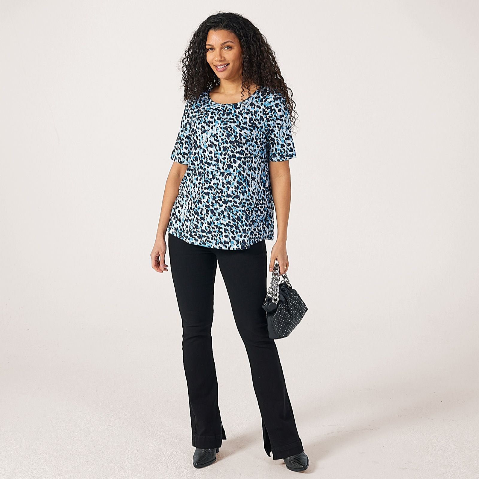 Add a playful pop of print to your everyday wardrobe with this short sleeve top from Kim & Co. Designed in a vibrant pattern with a classic round neckline and subtle side slits at the hem, this piece blends comfort with contemporary charm. Whether you're heading to brunch, the office or a relaxed evening out, its easy silhouette makes it a versatile choice. Try pairing it with cropped trousers and sandals for a fresh, effortless look.
