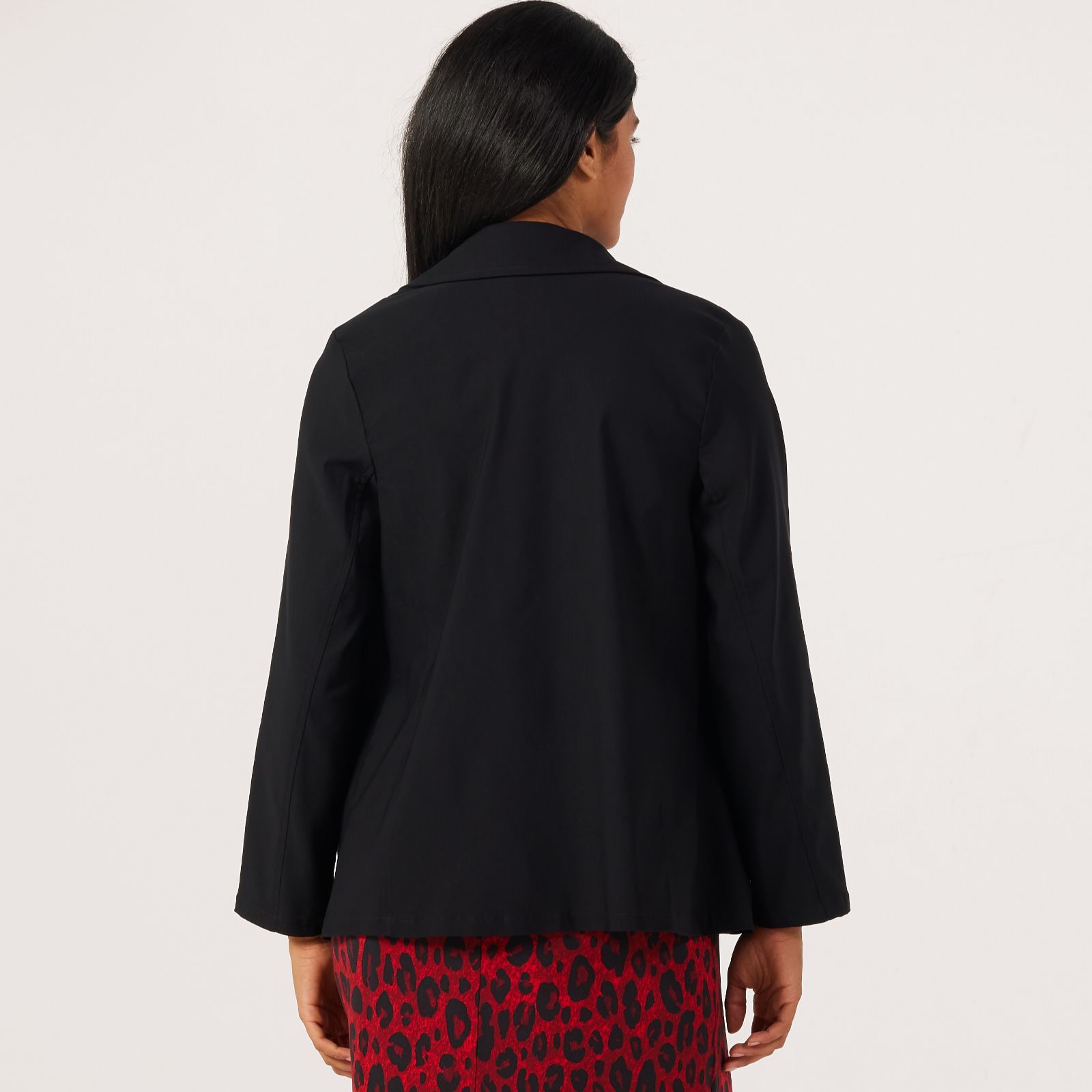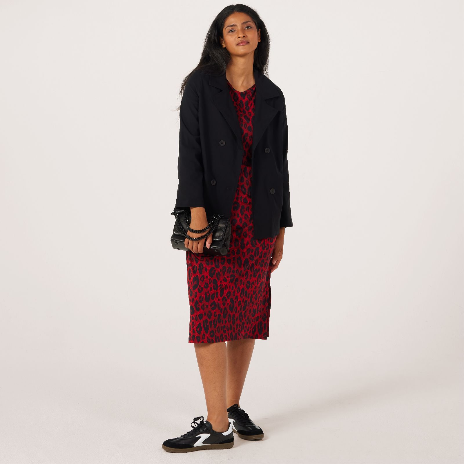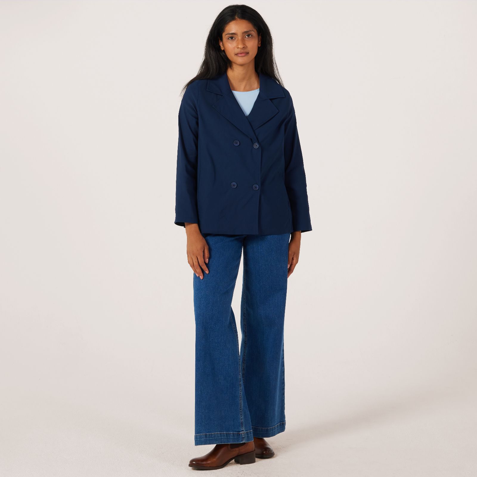 - Double-breasted front with hidden pockets at the princess seam