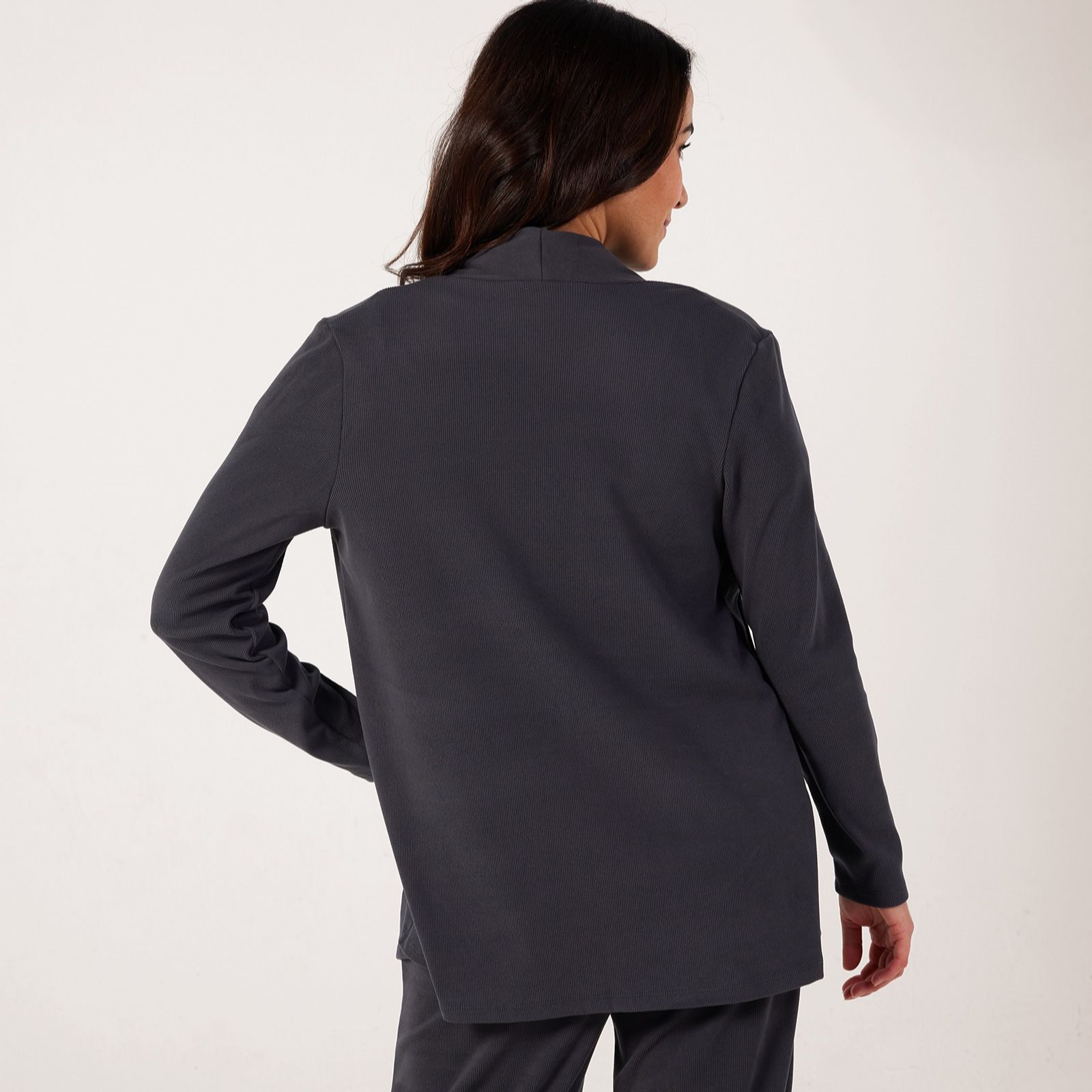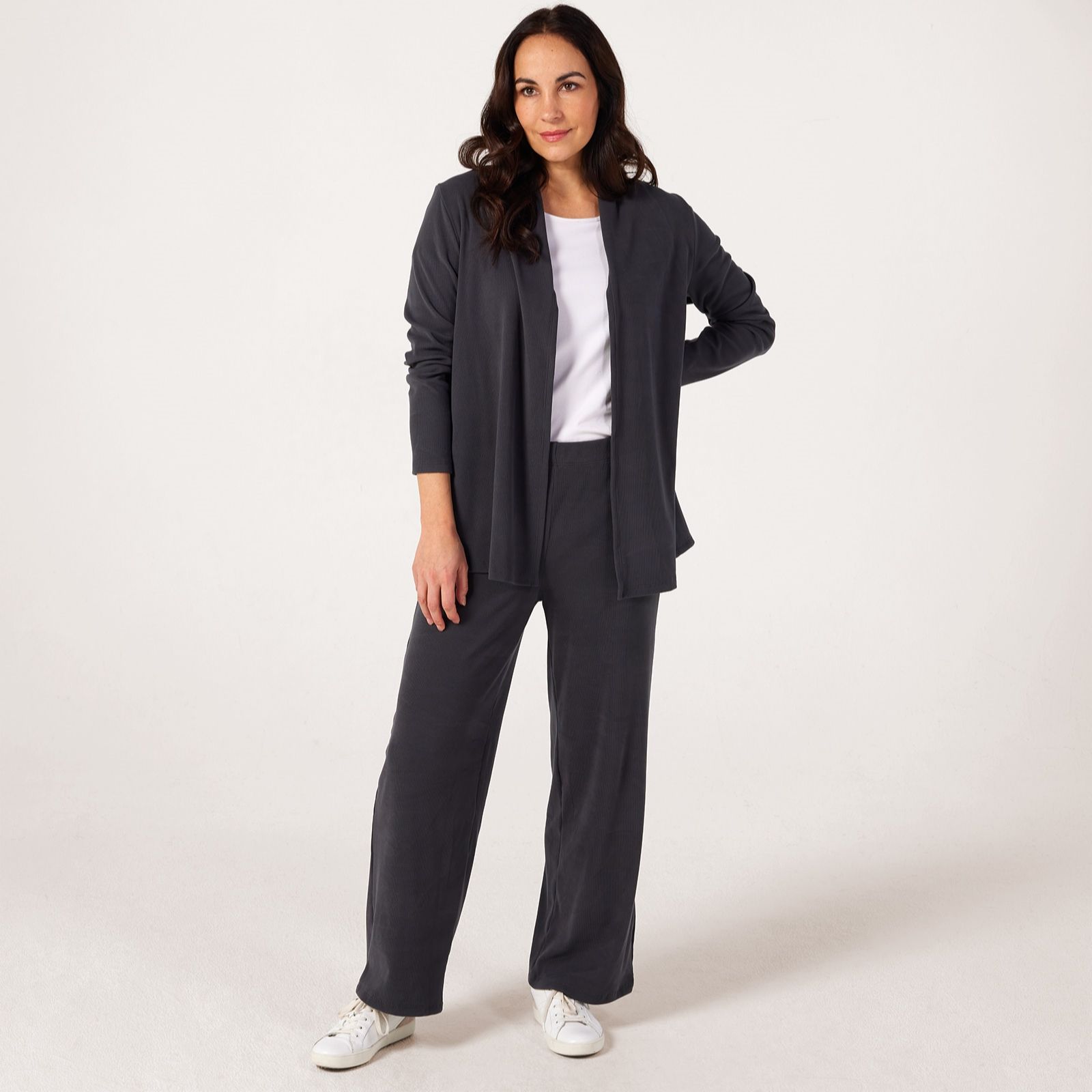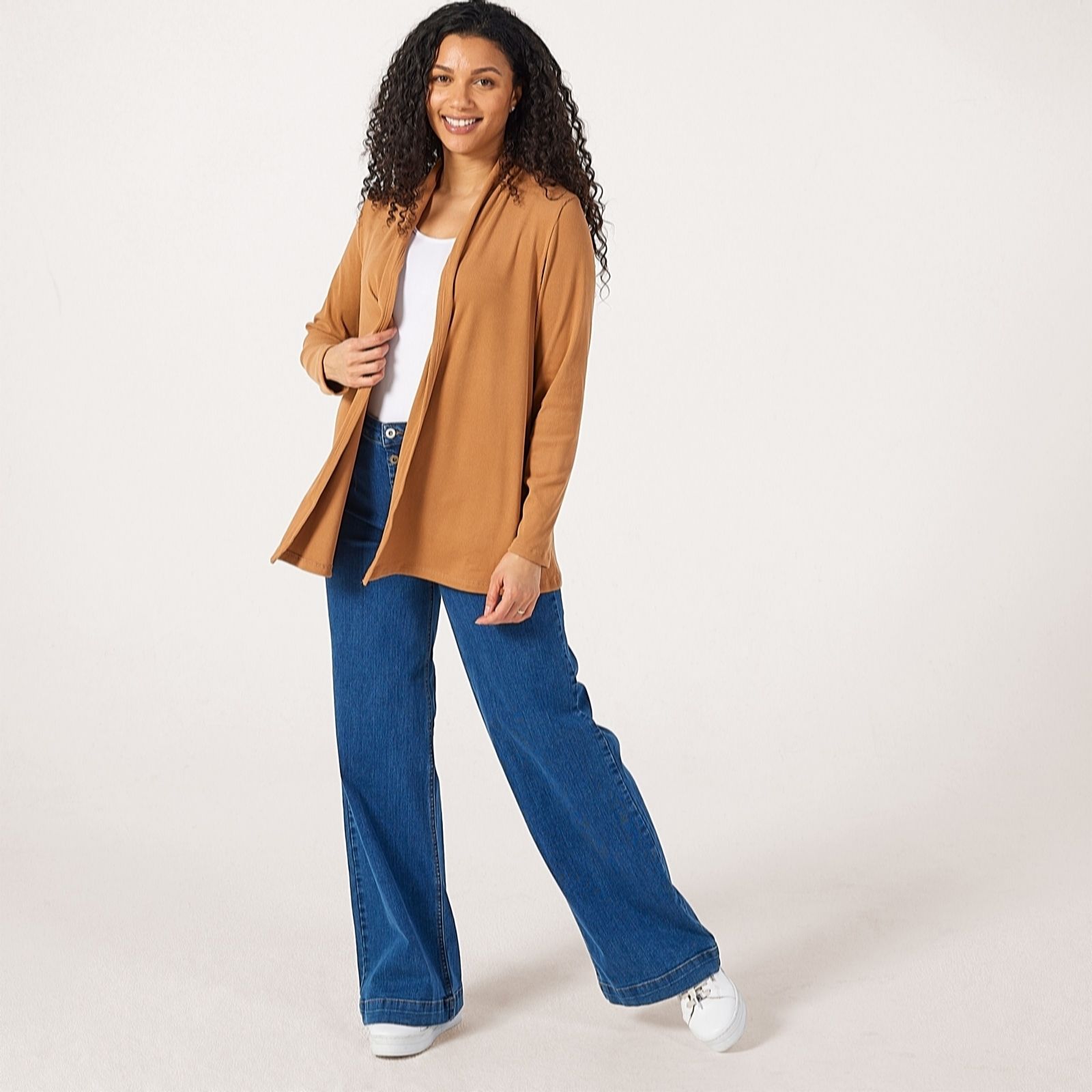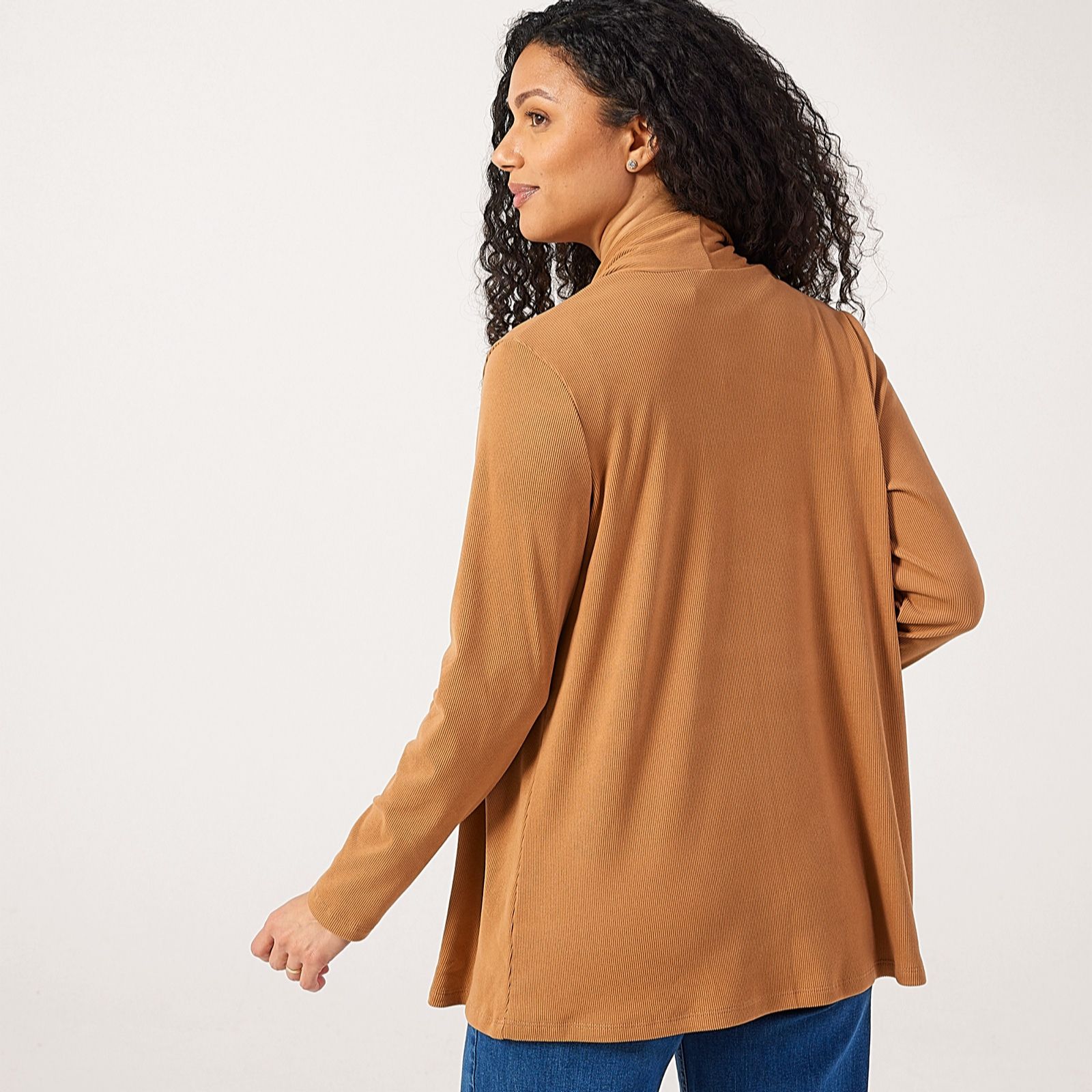 Wrap yourself in the effortless elegance of the soft rib knit edge-to-edge cardigan from Kim & Co. Designed with a high neck at the back featuring subtle shirring, it offers a refined yet relaxed silhouette perfect for layering. Whether you're heading to the office, enjoying a weekend brunch or adding a cosy touch to your evening look, this versatile piece has you covered. Try pairing it with tailored trousers for a polished finish or drape it over a simple dress for a chic, laid-back vibe.