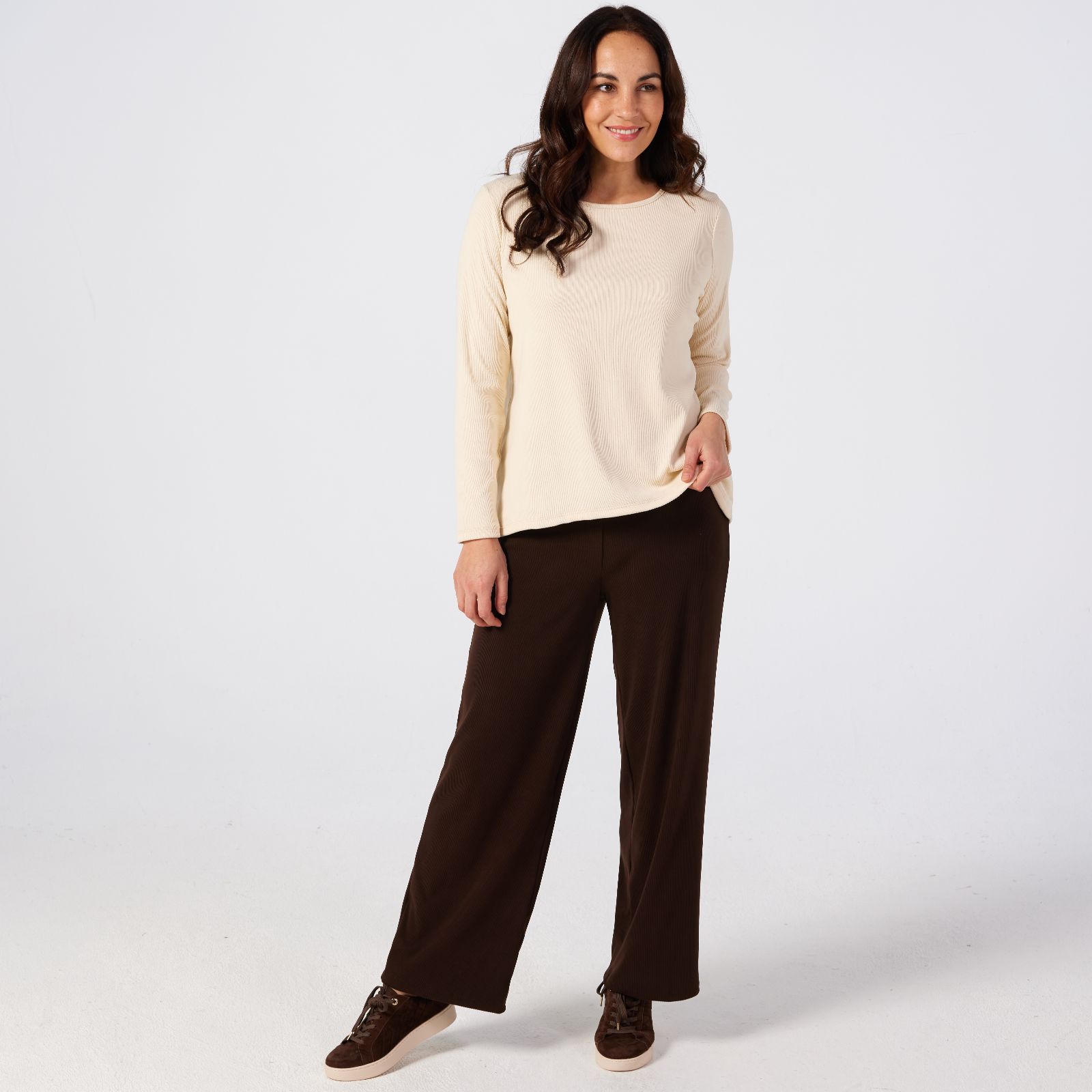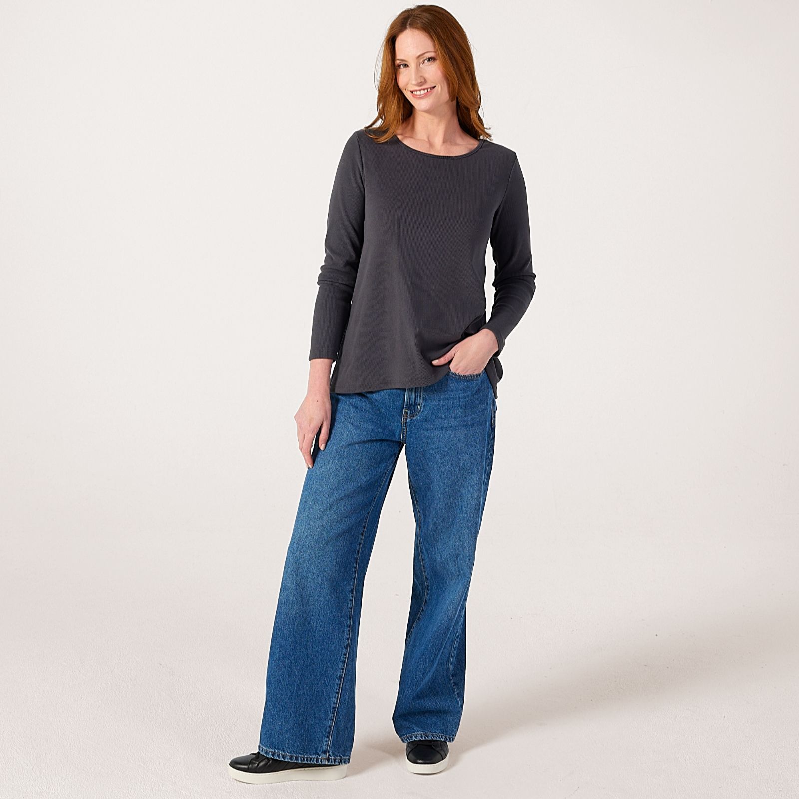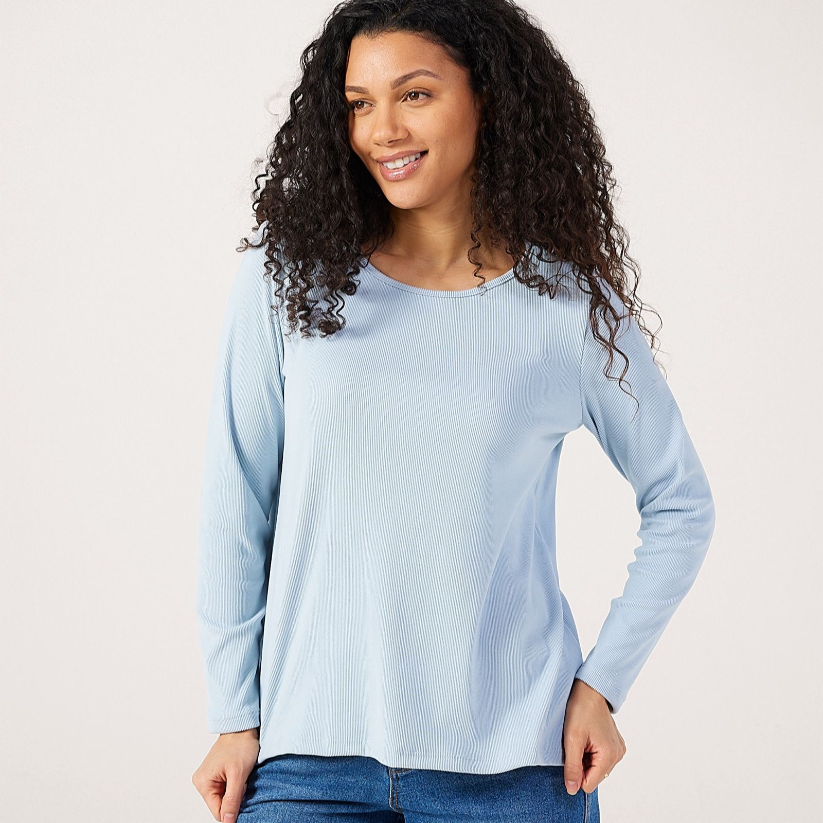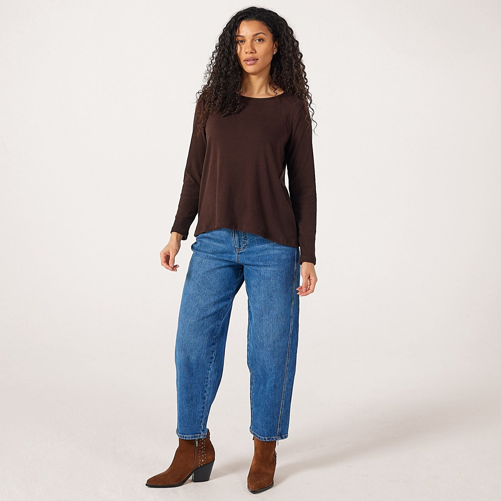 Relax into timeless comfort with the Soft Rib Knit long sleeve essential top from Kim & Co. Showcasing a classic round neckline and a chic high-low hem, this piece boasts a new, soft, ribbed take on the classic knit fabric that you'll the feel of. It's ideal for adding understated elegance to any outfit, whether you're enjoying a leisurely park stroll, catching up over weekend brunch or unwinding at home. Team it with tailored trousers for a polished feel or dress it down with your favourite jeans for effortless day-to-evening style.