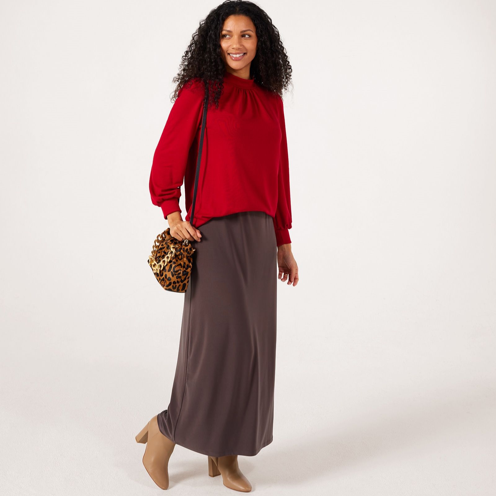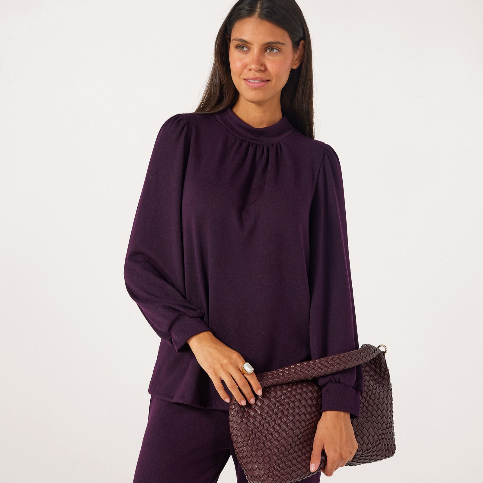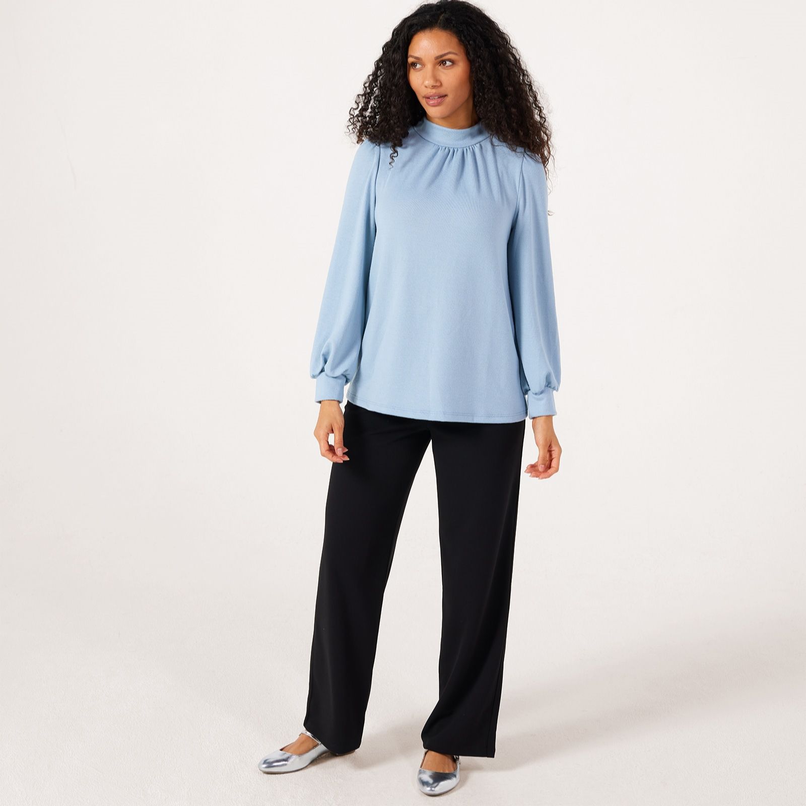 Give your seasonal wardrobe an elegant upgrade with this super-soft knit top from Kim & Co. Boasting a versatile design that will pair perfectly with your favourite trousers and skirts, this knit top features a sleek high neckline and sophisticated shirring details on the cuffs, neckline and shoulders. Introduce softness and plenty of style to your transitional wardrobe today!