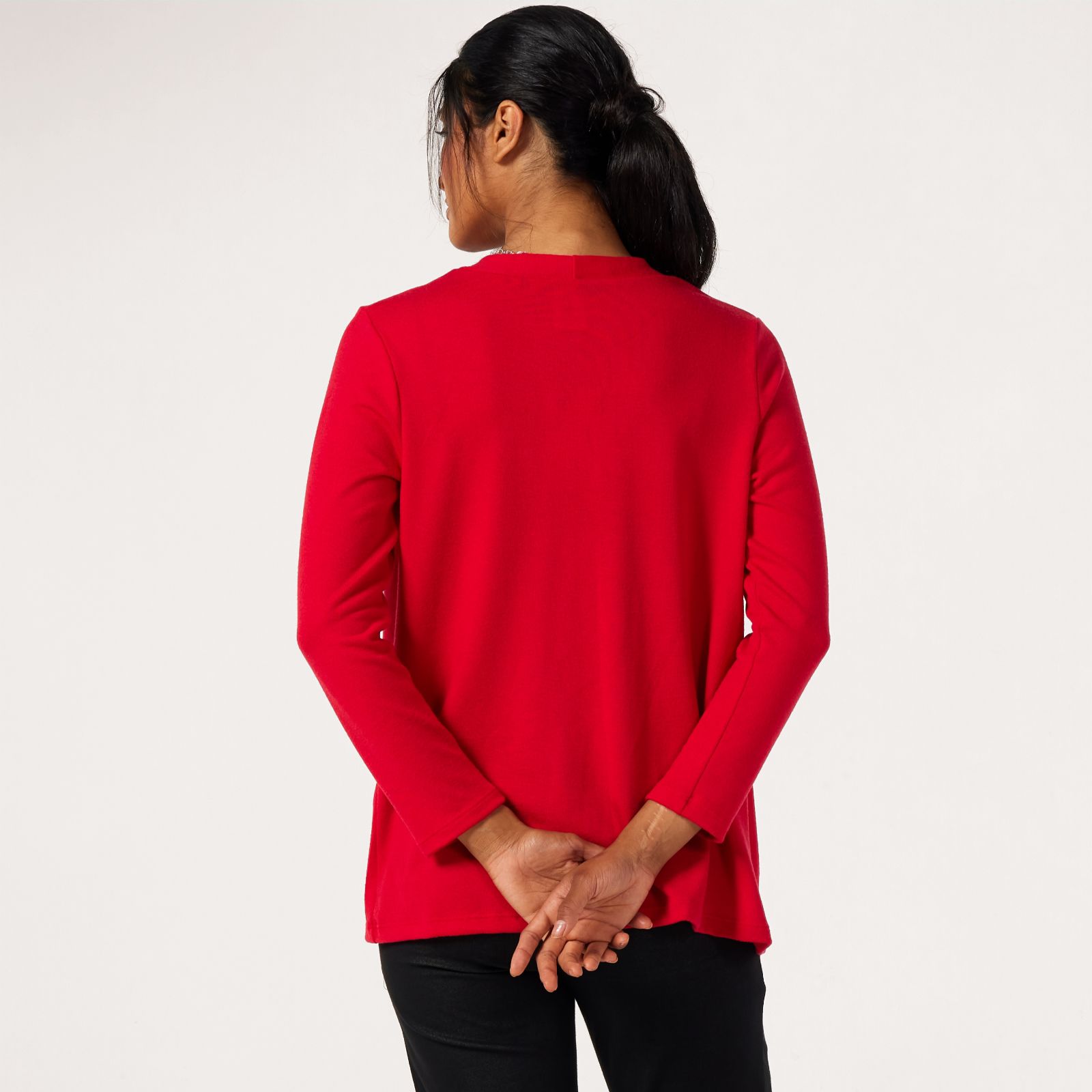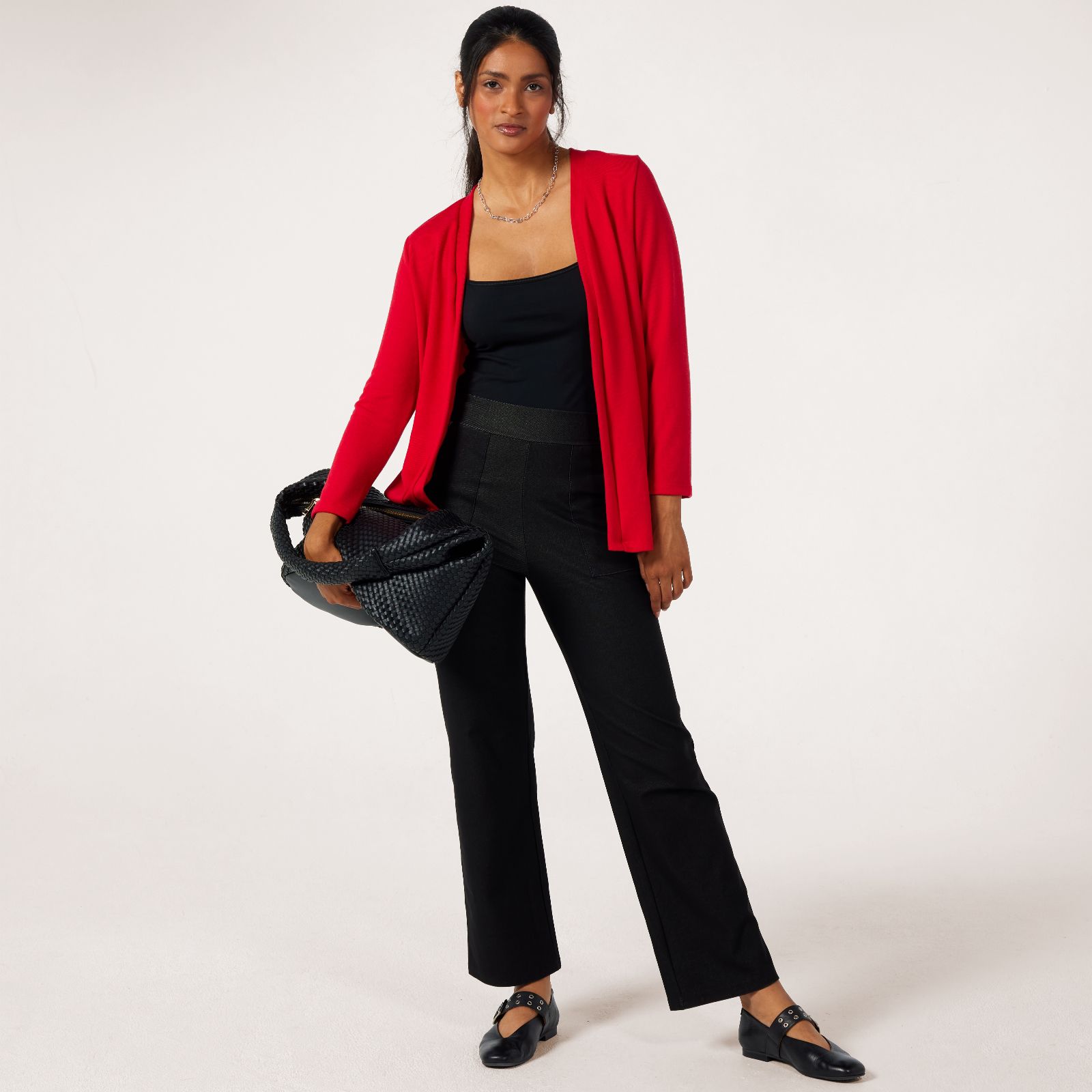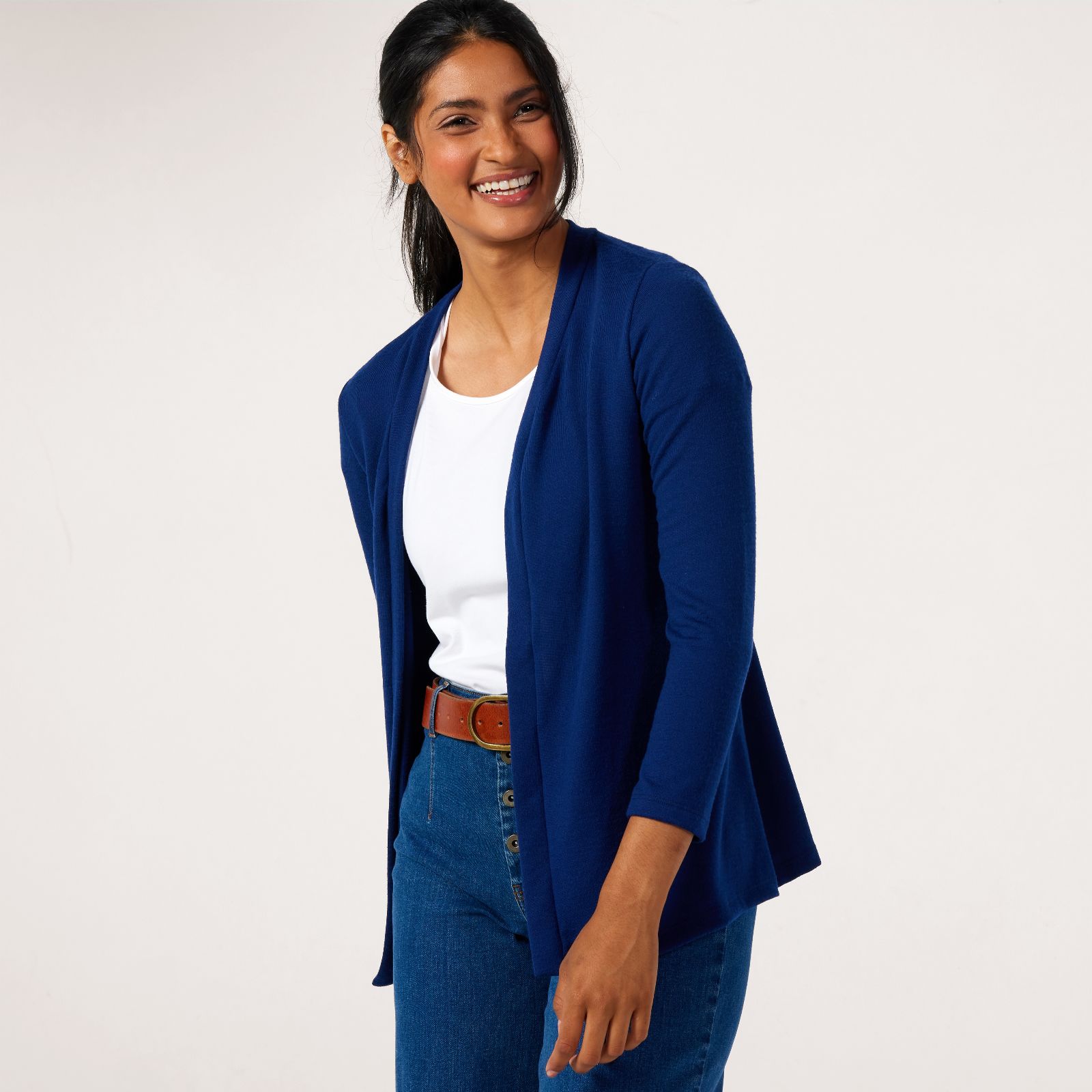Slip on the Kim & Co Soft Touch Contrast Detail Cardigan and enjoy an effortless blend of comfort and contemporary style. The open front and sleek banded trim add a modern edge, making this piece ideal for everything from workdays to relaxed weekends. Layer it over a blouse and slim trousers for a polished finish or keep it casual with your favourite jeans and trainers.
