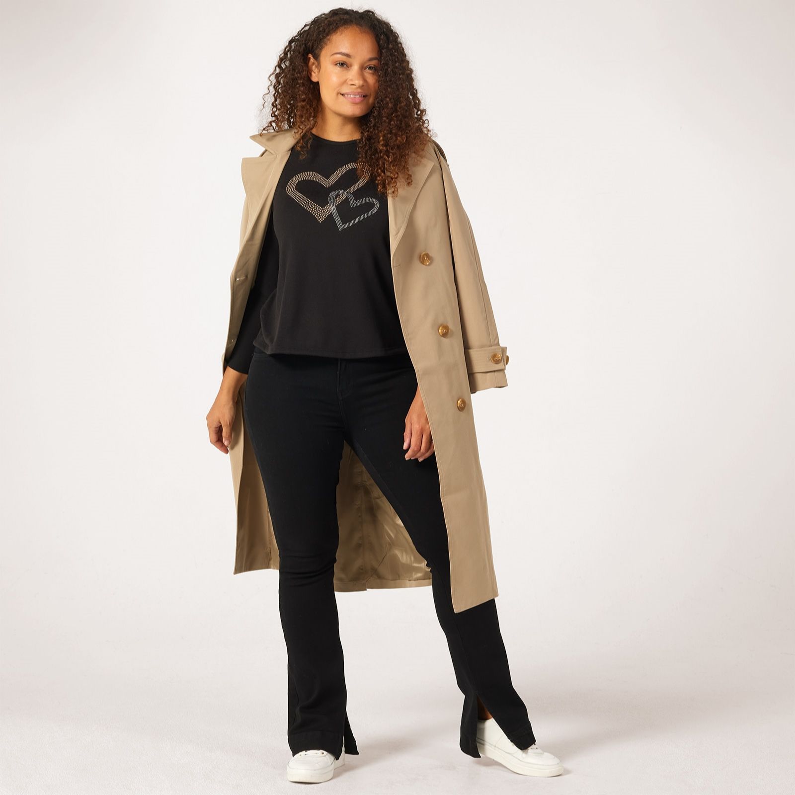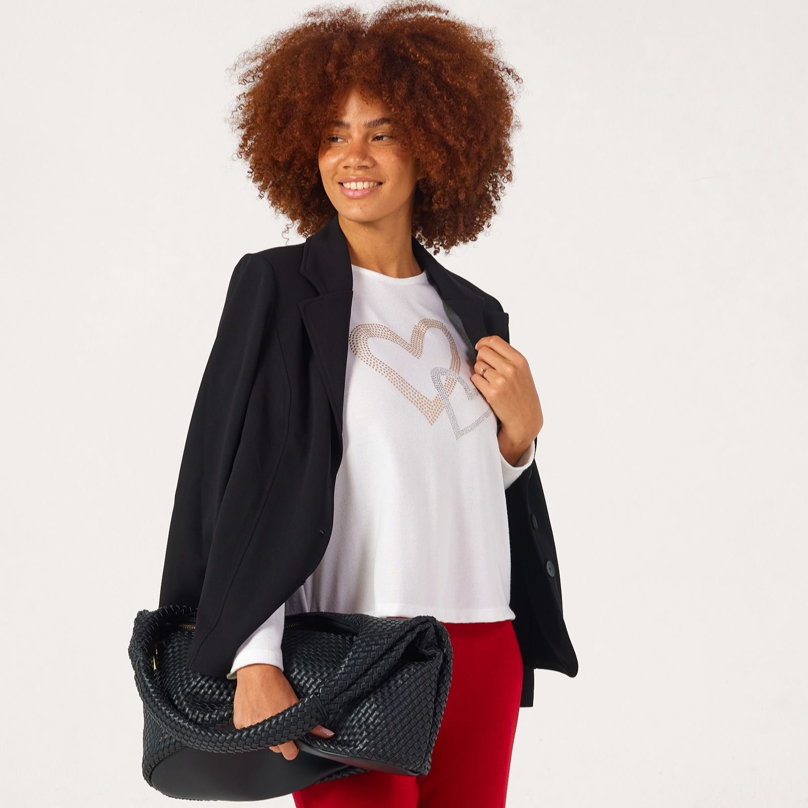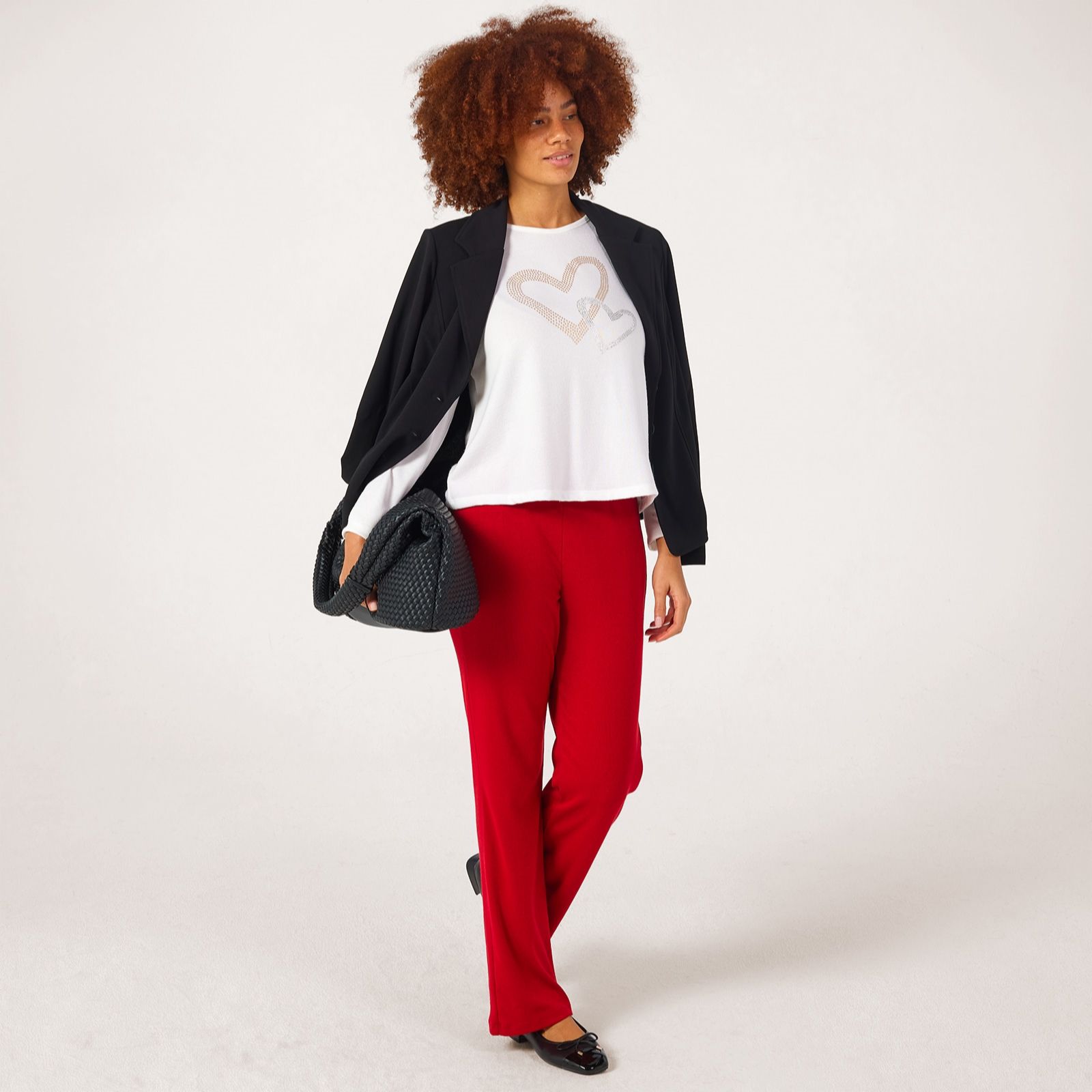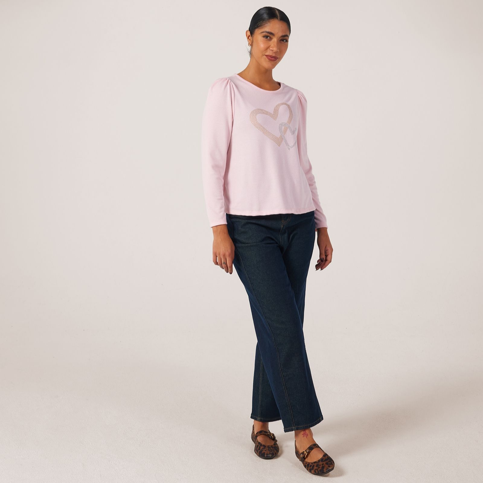 Bring a touch of sparkle to your everyday with the Soft Touch Long Sleeve Rhinestone Heart In Heart Print Top from Kim & Co. Adorned with a shimmering rhinestone heart motif at the chest and gentle shirring at the sleeve heads, this round neck top adds a romantic accent to your wardrobe. Perfect for casual outings, cosy evenings, or dressing up for dinner, its a versatile piece that transitions effortlessly from day to night. Pair it with tailored trousers or your favourite jeans for an easy, polished look.